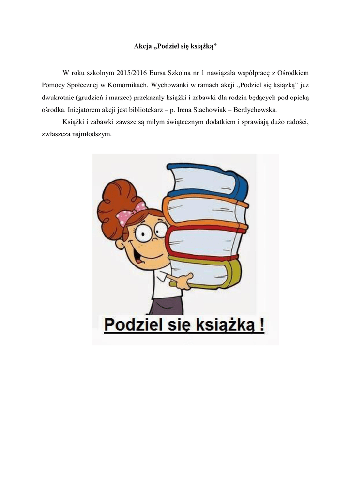 Akcja „Podziel się książką” W roku szkolnym 2015/2016 Bursa Szkolna nr 1 nawiązała współpracę z Ośrodkiem Pomocy Społecznej w Komornikach. Wychowanki w ramach akcji „Podziel się książką” już dwukrotnie (grudzień i marzec) przekazały książki i zabawki dla rodzin będących pod opieką ośrodka. Inicjatorem akcji jest bibliotekarz – p. Irena Stachowiak – Berdychowska. Książki i zabawki zawsze są miłym świątecznym dodatkiem i sprawiają dużo radości, zwłaszcza najmłodszym.