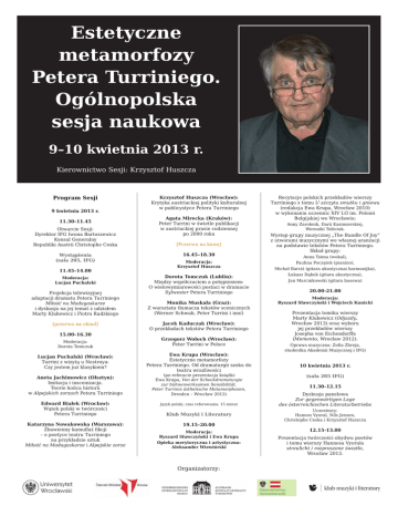 Estetyczne metamorfozy Petera Turriniego. Ogólnopolska sesja naukowa 9–10 kwietnia 2013 r. Kierownictwo Sesji: Krzysztof Huszcza Program Sesji 9 kwietnia 2013 r. 11.30–11.45 Otwarcie Sesji: Dyrektor IFG Iwona Bartoszewicz Konsul Generalny Republiki Austrii Christophe Ceska Wystąpienia (sala 205, IFG) Krzysztof Huszcza (Wrocław): Krytyka austriackiej polityki kulturalnej w publicystyce Petera Turriniego Agata Mirecka (Kraków): Peter Turrini w świetle publikacji w austriackiej prasie codziennej po 2000 roku [Przerwa na kawę] 16.45–18.30 Moderacja: Krzysztof Huszcza 11.45–14.00 Moderacja: Lucjan Puchalski Projekcja telewizyjnej adaptacji dramatu Petera Turriniego Miłość na Madagaskarze i dyskusja na jej temat z udziałem Marty Klubowicz i Piotra Rudzkiego [przerwa na obiad] Dorota Tomczuk (Lublin): Między współczuciem a potępieniem: O wielowymiarowości postaci w dramacie Sylwester Petera Turriniego Monika Muskała (Graz): Z warsztatu tłumacza tekstów scenicznych (Werner Schwab, Peter Turrini i inni) Jacek Kaduczak (Wrocław): O przekładach tekstów Petera Turriniego 15.00–16.30 Moderacja: Dorota Tomczuk Grzegorz Wołoch (Wrocław): Peter Turrini w Polsce Lucjan Puchalski (Wrocław): Turrini z wizytą u Nestroya: Czy jestem już klasykiem? Ewa Krupa (Wrocław): Estetyczne metamorfozy Petera Turriniego. Od dramaturgii szoku do teatru wrażliwości Aneta Jachimowicz (Olsztyn): Imitacja i inscenizacja. Teorie końca historii w Alpejskich zorzach Petera Turriniego (po referacie prezentacja książki: Ewa Krupa, Von der Schockdramaturgie zur bühnenwirksamen Sensibilität. Peter Turrinis ästhetische Metamorphosen, Dresden – Wrocław 2012) Edward Białek (Wrocław): Wątek polski w twórczości Petera Turriniego Język polski, czas referowania: 15 minut Katarzyna Nowakowska (Warszawa): Zbawienny kamuflaż fikcji – o poetyce teatru Turriniego na przykładzie sztuk Miłość na Madagaskarze i Alpejskie zorze 19.15–20.00 Klub Muzyki i Literatury Moderacja: Ryszard Sławczyński i Ewa Krupa Opieka merytoryczna i artystyczna: Aleksander Wiewiórski Organizatorzy: Recytacje polskich przekładów wierszy Turriniego z tomu U szczytu smutku i gniewu (redakcja Ewa Krupa, Wrocław 2010) w wykonaniu uczennic XIV LO im. Polonii Belgijskiej we Wrocławiu: Anny Zarobnik, Darii Kazimierskiej, Weroniki Tołściuk. Występ grupy muzycznej „The Bundle Of Joy” z utworami muzycznymi we własnej aranżacji na podstawie tekstów Petera Turriniego. Skład grupy: Anna Tsima (wokal), Paulina Początek (pianino), Michał Barciś (gitara akustycznai harmonijka), Łukasz Dąbek (gitara akustyczna), Jan Marcinkowski (gitara basowa) 20.00-21.00 Moderacja: Ryszard Sławczyński i Wojciech Kunicki Prezentacja tomiku wierszy Marty Klubowicz (Odjazdy, Wrocław 2013) oraz wyboru jej przekładów wierszy Josepha von Eichendorffa (Memento, Wrocław 2012). Oprawa muzyczna: Zofia Zbroja, studentka Akademii Muzycznej i IFG) 10 kwietnia 2013 r. (sala 205 IFG) 11.30–12.15 Dyskusja panelowa Zur gegenwärtigen Lage des österreichischen Literaturbetriebs Uczestnicy: Hannes Vyoral, Nils Jensen, Christophe Ceska i Krzysztof Huszcza 12.15-13.00 Prezentacja twórczości obydwu poetów i tomu wierszy Hannesa Vyorala streulicht / rozproszone światło, Wrocław 2013.