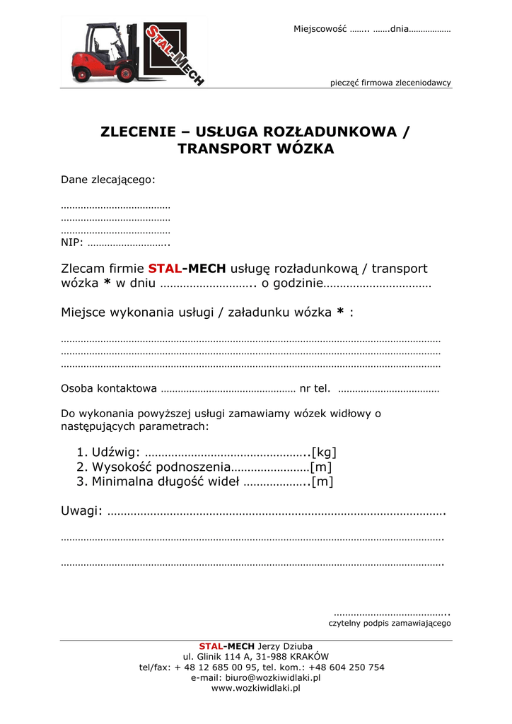 Miejscowość …….. …….dnia……………… pieczęć firmowa zleceniodawcy ZLECENIE – USŁUGA ROZŁADUNKOWA / TRANSPORT WÓZKA Dane zlecającego: ………………………………… ………………………………… ………………………………… NIP: ……………………….. Zlecam firmie STAL-MECH usługę rozładunkową / transport wózka * w dniu ……………………….. o godzinie…………………………… Miejsce wykonania usługi / załadunku wózka * : ……………………………………………………………………………………………………………………… ……………………………………………………………………………………………………………………… ……………………………………………………………………………………………………………………… Osoba kontaktowa ………………………………………… nr tel. ……………………………… Do wykonania powyŜszej usługi zamawiamy wózek widłowy o następujących parametrach: 1. Udźwig: …………………………………………..[kg] 2. Wysokość podnoszenia……………………[m] 3. Minimalna długość wideł ………………..[m] Uwagi: …………………………………………………………………………………………. ………………………………………………………………………………………………………………………. ………………………………………………………………………………………………………………………. ………………………………….. czytelny podpis zamawiającego STAL-MECH Jerzy Dziuba ul. Glinik 114 A, 31-988 KRAKÓW tel/fax: + 48 12 685 00 95, tel. kom.: +48 604 250 754 e-mail: [email protected] www.wozkiwidlaki.pl