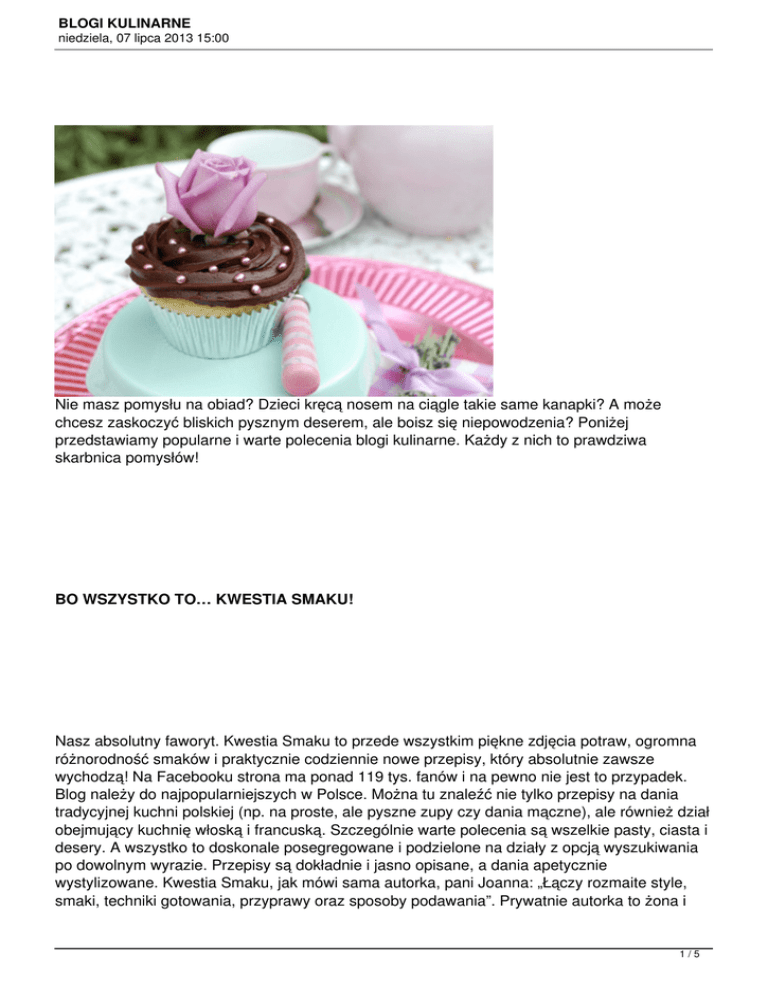 BLOGI KULINARNE niedziela, 07 lipca 2013 15:00 Nie masz pomysłu na obiad? Dzieci kręcą nosem na ciągle takie same kanapki? A może chcesz zaskoczyć bliskich pysznym deserem, ale boisz się niepowodzenia? Poniżej przedstawiamy popularne i warte polecenia blogi kulinarne. Każdy z nich to prawdziwa skarbnica pomysłów! BO WSZYSTKO TO… KWESTIA SMAKU! Nasz absolutny faworyt. Kwestia Smaku to przede wszystkim piękne zdjęcia potraw, ogromna różnorodność smaków i praktycznie codziennie nowe przepisy, który absolutnie zawsze wychodzą! Na Facebooku strona ma ponad 119 tys. fanów i na pewno nie jest to przypadek. Blog należy do najpopularniejszych w Polsce. Można tu znaleźć nie tylko przepisy na dania tradycyjnej kuchni polskiej (np. na proste, ale pyszne zupy czy dania mączne), ale również dział obejmujący kuchnię włoską i francuską. Szczególnie warte polecenia są wszelkie pasty, ciasta i desery. A wszystko to doskonale posegregowane i podzielone na działy z opcją wyszukiwania po dowolnym wyrazie. Przepisy są dokładnie i jasno opisane, a dania apetycznie wystylizowane. Kwestia Smaku, jak mówi sama autorka, pani Joanna: „Łączy rozmaite style, smaki, techniki gotowania, przyprawy oraz sposoby podawania”. Prywatnie autorka to żona i 1/5 BLOGI KULINARNE niedziela, 07 lipca 2013 15:00 matka trojga dzieci, która – jak można się domyślać – doskonale spełnia się w kuchni i co rusz zaskakuje nas nowościami. www.kwestiasmaku.com KOLOROWY WHITE PLATE Ciepło, jakie autorka bloga wkłada w przygotowanie każdej potrawy, jest wyczuwalne nawet przez monitor. To miejsce magiczne na blogowej mapie, bo prezentuje bardzo uczuciowe podejście do kulinariów. Muszą tu koniecznie zajrzeć wszyscy, którzy chcą poczuć magię przedwojennej Warszawy. Autorka, pani Eliza Morawska, na swojej stronie nie tylko prezentuje przepisy, ale też wprowadza nas w świat podróży kulinarnych po różnych zakątkach Europy. Głównie prezentowane są przepisy na dania jarskie. Jak mówi o sobie autorka: „Gotuję od zawsze. Kuchnia, którą lubię najbardziej, to ta lokalna, zharmonizowana z porami roku i szerokością geograficzną. Bliska memu sercu jest też kuchnia przedwojenna i kresowa, którą pamiętam z czasów swojego dzieciństwa, bo tak gotowała moja babcia”. Blogerka hołduje tradycji i chętnie sięga po lokalne składniki: twarogi, zakwasy, buraki, soki. Na swoim drugim kulinarnym blogu, Pracowni Wypieków, pokazuje, jak rozpocząć przygodę z domową piekarnią: jak upiec chleb, bułeczki czy bagietki. Autorka strony wydała książkę kulinarną oraz prowadzi własne warsztaty. www.whiteplate.blogspot.com www.pracowniawypiekow.blogspot.com 2/5 BLOGI KULINARNE niedziela, 07 lipca 2013 15:00 SOK Z FIOŁKÓW, CZYLI EVERY CAKE YOU BAKE To kolejne magiczne miejsce warte odwiedzenia. Każdy przepis na tej stronie jest osobnym dziełem sztuki – co nie dziwi, gdy dodamy, że jego autorka z wykształcenia jest historykiem sztuki, a blog to dla niej odskocznia i relaks. Przepisy są oryginalne i niepowtarzalne. Autorka tak pisze o sobie: „Gotuję z przyjemnością i dla przyjemności. Uprawiam zioła, warzę sok z fiołków, zwijam różyczki z kruchego ciasta i godzinami zdobię pierniczki. Wszystko po to, by moje dania cieszyły oko, zachwycały nos i pieściły podniebienie. Bo jedzenie to dla mnie alchemia zmysłów”. Warto tę stronę odwiedzić już dla samych artystycznych zdjęć, warto również poznać tajemnicę robienia słodkich lizaków z fiołkami w środku lub przepisu na puszyste zielone ciasto pandanowe. Jedno jest pewne – przepisy do łatwych nie należą, ale na pewno zachwycą niejedną osobę. www.everycakeyoubake.blogspot.com AM MNIAM – DLA NAJMŁODSZYCH Każdy rodzic wie, jak ważna jest zdrowa dieta małego członka rodziny i jak czasami trudno zachęcić maluchy do zjedzenia całego posiłku. Strona Am Mniam prezentuje proste i smaczne przepisy na potrawy dla najmłodszych – ale dorośli również zjedzą je ze smakiem. Przepisy podzielone są na kategorie: śniadanie, obiad i kolacja, a dodatkowy dział zajmują potrawy bezglutenowe. Pomysł na pisanie bloga powstał z chęci zwrócenia uwagi na fakt, iż zdrowe żywienie dzieci jest bardzo ważne i ma ogromny wpływ na budowę odporności organizmu. Przepisy propagują wprowadzenie do diety domowników jak największej ilości warzyw i 3/5 BLOGI KULINARNE niedziela, 07 lipca 2013 15:00 owoców. www.ammniam.pl CIOCCOLATO GATTO Jeśli ktoś przepada za słodkościami, to obowiązkowy miejscem będzie Cioccolato Gatto – blog o deserach, słodkościach, czekoladach, dżemach i wszystkim, co zawiera w sobie słodycz. Trzeba przyznać, że blog to nie tylko pyszne przepisy i piękne zdjęcia – przyjemnie się go także czyta. Jest wiele stron poświęconych słodkim wypiekom, ale tylko tu znajdziecie mufinkowy zegar i niezliczone ilości wykwintnych pralin, trufli i czekoladek. Autorka, Joanna Basista, często odwiedza Kraków, a szczególnie krakowskie cukiernie, czerpiąc stamtąd inspiracje. cioccolatogatto.blox.pl Jeśli jednak powyższa lista jest dla was niewystarczająca, warto zajrzeć na stronę www.dursz lak.pl , która prezentuje zbiór przepisów z polskich blogów kulinarnych. Są one automatycznie aktualizowane: równocześnie z pojawieniem się przepisu na blogu pojawia się on na durszlak.pl. Aby w pełni korzystać z zasobów strony, należy się na niej zarejestrować, można ją 4/5 BLOGI KULINARNE niedziela, 07 lipca 2013 15:00 też śledzić na Facebooku. Po dokonaniu rejestracji otwiera się przed nami dostęp do ponad 300 tys. przepisów pochodzących z 3500 blogów! To prawdziwa rozkosz dla oka i podniebienia! Agnieszka Szołtysik Gazetka 123 – lipiec/sierpień 2013 5/5