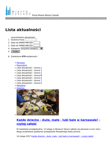 Portal Miasta Miasta Czeladź http://www.czeladz.pl/aktualnosci/lista_aktualnosci/Czeladz-wyrozniona-wsrod-Gmin-Przyjaznym-Seniorom/st:5/printpdf Lista aktualności wyszukiwarka aktualności 1. Szukana fraza 2. Data od (RRRR-MM-DD) 3. Data do (RRRR-MM-DD) 4. Kategorie wszystkie kategorie ... ▼ 5. Szukaj 6. Znaleziono 470 wiadomości. Pierwsza Poprzednia Lista aktualności - strona 2 Lista aktualności - strona 3 Lista aktualności - strona 4 Lista aktualności - strona 5 Lista aktualności - strona 6 Lista aktualności - strona 7 Lista aktualności - strona 8 Następna Ostatnia Każde dziecko - duże, małe - lubi bale w karnawale! czytaj całość W niedzielne przedpołudnie, 12 lutego w Muzeum Saturn odbyło się pierwsze w tym roku i długo oczekiwane spotkanie sympatyków Muzealnego Klubu Juniora. 14 lutego 2017 Każde dziecko - duże, małe - lubi bale w karnawale! - czytaj całość Powiadomienie o jakości powietrza w województwie śląskim - czytaj całość Wojewódzki Inspektorat Ochrony Środowiska w Katowicach informuje o jakości powietrza w województwie śląskim w dniach 12-14.02.2017 r. 14 lutego 2017 Powiadomienie o jakości powietrza w województwie śląskim - czytaj całość Jak chronić się przed ptasią grypą - czytaj całość Zachęcamy do zapoznanie się z broszurami informacyjnymi, które przedstawiają najważniejsze zasady ochrony przed ptasią grypą. 13 lutego 2017 Jak chronić się przed ptasią grypą - czytaj całość Ostatnie pożegnanie śp. Krystyny Górnej - czytaj całość Z głębokim żalem zawiadamiamy, że dnia 10 lutego 2017 r. odeszła śp. Krystyna Górna. Wieloletnia ceniona nauczycielka historii czeladzkich szkół - Szkoły Podstawowej nr 2 oraz Gimnazjum nr 1. Oddany pracownik merytoryczny Muzeum Saturn. 13 lutego 2017 Ostatnie pożegnanie śp. Krystyny Górnej - czytaj całość Powiadomienie o jakości powietrza w województwie śląskim - czytaj całość Wojewódzki Inspektorat Ochrony Środowiska informuje o jakości powietrza w województwie śląskim w dniach 09-11.02.2017 r. 10 lutego 2017 Powiadomienie o jakości powietrza w województwie śląskim - czytaj całość Powiadomienie o jakości powietrza w województwie śląskim - czytaj całość Wojewódzki Inspektorat Ochrony Środowiska informuje o jakości powietrza w dniach 08-10.02.2017 r. 09 lutego 2017 Powiadomienie o jakości powietrza w województwie śląskim - czytaj całość Zimowe zajęcia dla dzieci - czytaj całość Miejska Biblioteka Publiczna serdecznie zaprasza dzieci w wieku 4-8 lat na kolejne zajęcia z cyklu Czytanki-niespodzianki pt. Zima u Królowej Śniegu. 09 lutego 2017 Zimowe zajęcia dla dzieci - czytaj całość Powiadomienie o jakości powietrza w województwie śląskim - czytaj całość Wojewódzki Inspektorat Ochrony Środowiska w Katowicach informuje o jakości powietrza w województwie śląskim w dniach 07.02.-09.02.2017 r. 08 lutego 2017 Powiadomienie o jakości powietrza w województwie śląskim - czytaj całość Powiadomienie o jakości powietrza w województwie śląskim - czytaj całość Wojewódzki Inspektorat Ochrony Środowiska w Katowicach informuje o jakości powietrza w województwie śląskim w dniach 05.02.-08.02.2017 r. 07 lutego 2017 Powiadomienie o jakości powietrza w województwie śląskim - czytaj całość Ostrzeżenie meteorologiczne Nr 30 - marznące opady czytaj całość IMGW-PIB Centralne Biuro Prognoz Meteorologicznych w Krakowie ostrzega przed marznącymi opadami. 07 lutego 2017 Ostrzeżenie meteorologiczne Nr 30 - marznące opady - czytaj całość Pierwsza Poprzednia Lista aktualności - strona 2 Lista aktualności - strona 3 Lista aktualności - strona 4 Lista aktualności - strona 5 Lista aktualności - strona 6 Lista aktualności - strona 7 Lista aktualności - strona 8 Następna Ostatnia