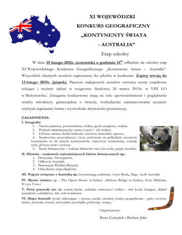 XI WOJEWÓDZKI KONKURS GEOGRAFICZNY ,,KONTYNENTY ŚWIATA - AUSTRALIA” Etap szkolny W dniu 19 lutego 2015r. (czwartek) o godzinie 1150 odbędzie się szkolny etap XI Wojewódzkiego Konkursu Geograficznego „Kontynenty świata – Australia”. Wszystkich chętnych uczniów zapraszamy do udziału w konkursie. Zapisy trwają do 13 lutego 2015r. (piątek). Pięcioro najlepszych uczniów otrzyma oceny cząstkowe celujące i weźmie udział w rozgrywce finałowej 26 marca 2015r. w VIII LO w Białymstoku. Zmagania konkursowe mają na celu upowszechnienie i pogłębienie wiedzy młodzieży gimnazjalnej o świecie, rozbudzenia zainteresowania uczniów różnymi regionami świata i wyzwolenie aktywności poznawczej. ZAGADNIENIA: I. Geografia: 1. Nazwa państwa, powierzchnia, stolica, język urzędowy, waluta. 2. Podział administracyjny (stany/części i ich stolice). 3. Główne miasta, liczba ludności, surowce mineralne, uprawy. 4. Środowisko przyrodnicze ( m.in. położenie na półkulach, wysokość kontynentu na tle innych kontynentów, najwyższe wzniesienia, rodzaje rzek, główne rzeki i jeziora). 5. Strefy klimatyczne – rodzaje klimatów oraz ich cechy, prądy morskie. II. Historia - znajomość najważniejszych faktów historycznych np.: 1. Dotyczące Aborygenów, 2. Odkrycia Australii, 3. Panowania Wielkiej Brytanii, 4. Odzyskania niepodległości. III. Pojęcia związane z Australią np.: boomerang, endemity, Ayers Rock, flaga , herb Australii. IV. Słynne miejsca np. : The Opera House in Sydney , Habour Bridge in Sydney, Góry Błękitne, Wyspa Fraser. V. Świat przyrody (m. in. rodzaje lasów, unikalne zwierzęta i rośliny – miś koala, kangury, diabeł tasmański, eukaliptusy, itd., rafa koralowa). VI. Mapa Australii (wody oblewające – morza, zatoki, cieśniny; krainy geograficzne – góry, wyżyny, niziny, pustynie, baseny artezyjskie; przylądki, półwyspy, wyspy, Organizatorzy: Beata Gawryluk i Barbara Joka