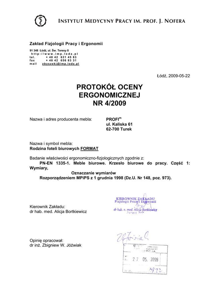 Zakład Fizjologii Pracy i Ergonomii 91 348 Łódź, ul. Św. Teresy 8 http://www.imp.lodz.pl tel. + 48 42 631 45 83 fax + 48 42 656 83 31 mail [email protected] Łódź, 2009-05-22 PROTOKÓŁ OCENY ERGONOMICZNEJ NR 4/2009 Nazwa i adres producenta mebla: PROFIm ul. Kaliska 61 62-700 Turek Nazwa i symbol mebla: Rodzina foteli biurowych FORMAT Badanie właściwości ergonomiczno-fizjologicznych zgodnie z: PN-EN 1335-1. Meble biurowe. Krzesło biurowe do pracy. Część 1: Wymiary, Oznaczanie wymiarów Rozporządzeniem MPiPS z 1 grudnia 1998 (Dz.U. Nr 148, poz. 973). Kierownik Zakładu: dr hab. med. Alicja Bortkiewicz Opinię opracował: dr inż. Zbigniew W. Jóźwiak OCENA FIZJOLOGICZNO - ERGONOMICZNA Fot. 1. Fotel FORMAT 10SL chrom Fotele obrotowe serii FORMAT to fotele na teleskopie gazowym z oparciem połączonym z siedziskiem przy wykorzystaniu synchromechanizmu, który w połączeniu z możliwością regulacji wysokości siedziska i oparcia oraz kąta nachylenia oparcia, a także odpowiednimi profilami siedziska i oparcia zapewnia możliwość dostosowania warunków siedzenia do anatomicznych potrzeb użytkowników. Zastosowany mechanizm umożliwia siedzenie dynamiczne i przyjmowanie zrelaksowanej, odchylonej do tyłu pozycji ciała. Podstawę krzesła stanowi pięcioramienna baza, wykonana z aluminium (bez szkieletu metalowego, wytrzymałość 800 kg nacisku o rozstawie ramion: od osi bazy do osi kółka R= 340 mm gwarantująca wysoką stabilność krzesła. Podstawa wyposażona w kółka jezdne o średnicy 65 mm umożliwiające swobodne przemieszczanie się w czasie pracy, występujące w dwóch wersjach: do wykładzin dywanowych i do podłóg twardych. Kółka wyposażone są w hamulec, który zapobiega „odjeżdżaniu” krzesła bez obciążenia. Teleskop gazowy, zapewniający miękkie resorowanie oraz płynną regulację wysokości, występuje w wersji o skoku 95 mm. 2 Mechanizm regulacji wysokości i zmiany kąta pochylenia siedziska oraz wysokości i zmiany kąta nachylenia oparcia zapewnia właściwy zakres zmian. Mechanizm charakteryzuje się synchroniczną zmianą kątów oparcia oraz siedziska i wyposażony jest dodatkowo w system manualnej regulacji wstępnego napięcia sprężyn w zależności od masy ciała użytkownika - zwiększa to komfort dzięki dopasowaniu siły oporu fotela do ciężaru ciała. Regulacja wstępnego napięcia sprężyn – oporu mechanizmu odbywa się przy użyciu pokrętła, którego rączka jest wysuwana z boku siedziska, co znacznie poprawia dostępność i jakość regulacji i umożliwia dokonywanie zmian z pozycji siedzącej. Synchro mechanizm pozwala na uzyskanie ciągłego (bez względu na aktualnie przyjmowaną pozycję ciała), właściwego fizjologicznie podparcia pleców (a zwłaszcza odcinka lędźwiowego kręgosłupa) niezbędnego podczas tzw. siedzenia dynamicznego. Istnieje możliwość zablokowania mechanizmu w kilku pozycjach, a zastosowanie mechanizmu anti-shock eliminuje nieprzyjemne „uderzenie” oparcia podczas powrotu do opcji podparcia ciągłego. Dodatkową funkcją mechanizmu SYNCHRO jest możliwość regulacji głębokości siedziska dopasowując tym samym fotel do użytkownika o różnych gabarytach. Siedzisko krzesła o szerokości 500 mm i głębokości do 460 mm posiada zaokrągloną krawędź przednią w celu zmniejszenia ucisku na mięśnie ud i zapobiegania uczuciu drętwienia kończyn dolnych podczas utrzymywania pochylonej do przodu pozycji ciała (np. podczas pisania). Siedzisko wykonane ze stelaża metalowego o mocnej konstrukcji, zalewanego pianką PU (wykonaną w technologii spieniania poliuretanu, w formach). Wyprofilowanie siedziska ułatwia prawidłowe pozycjonowanie miednicy, pozwala na właściwe ułożenie kończyn osoby korzystającej z krzesła i wygodne wykonywanie pracy w pozycji pochylonej do przodu. Oparcie krzesła o wysokości całkowitej 740 mm stanowi metalowy stelaż zalewany pianką PU (wykonane w technologii spieniania poliuretanu w formach). Dzięki odpowiedniej sprężystości materiału oparcie jest elastyczne i wygodne. Istotnym elementem oparcia jest dźwignia regulacji podparcia lędźwiowego. Bardzo dobre wyprofilowanie oparcia pozwala na uzyskanie (w korelacji z profilem tylnej części siedziska) prawidłowego podparcia lędźwiowego niezbędnego podczas długotrwałego siedzenia i wykonywania różnych czynności w pozycji siedzącej (np. praca z komputerem, pisanie ręczne). Odpowiednie profile w połączeniu z dużą szerokością siedziska i oparcia zapewniają możliwość utrzymywania prawidłowej pozycji ciała (bez skrzywienia na boki) nie ograniczając jednocześnie możliwości zmiany pozycji ciała podczas pracy. Podłokietniki (jako integralny element oparcia), pozwalają na uzyskanie właściwego podparcia przedramion podczas wykonywania praktycznie wszystkich czynności typu biurowego. Opcjonalnie podłokietniki występują z nakładkami drewnianymi lub tapicerowanymi, co jeszcze bardziej zwiększa komfort pracy biurowej. Materiały tapicerskie - oparcie i siedzisko wykonane są z wysokiej jakości pianki poliuretanowej odpornej na odkształcenia i pokryte specjalnymi tkaninami przeznaczonymi do użytku w obiektach biurowych i użyteczności publicznej o wysokiej odporności na ścieranie, pilling, światło i ogień. Konstrukcja foteli FORMAT pozwala na wygodne dopasowanie go do wymagań indywidualnych dzięki m.in.: odpowiedniemu zakresowi regulacji wysokości i głębokości siedziska, zmiany wysokości i kąta pochylenia oparcia, 3 synchromechanizmowi i możliwości dopasowania go do masy ciała użytkownika i łatwemu dostępowi do elementów sterujących. Pozwala to stwierdzić, iż fotel FORMAT spełnia wszystkie wymagania ergonomiczne dla krzeseł przeznaczonych dla typowych stanowisk pracy biurowej (siedzącej) wg normy PN-EN 1335-1 w zakresie wymiarów funkcjonalnych dla krzeseł biurowych (patrz Tab. 1). Powyższe cechy umożliwiają zastosowanie foteli 