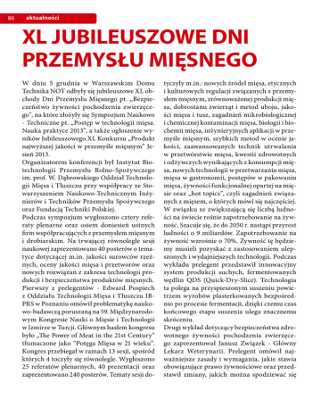 86 aktualności XL JUBILEUSZOWE DNI PRZEMYSŁU MIĘSNEGO W dniu 5 grudnia w Warszawskim Domu Technika NOT odbyły się jubileuszowe XL obchody Dni Przemysłu Mięsnego pt. „Bezpieczeństwo żywności pochodzenia zwierzęcego”, na które złożyły się Sympozjum Naukowo - Techniczne pt. „Postęp w technologii mięsa. Nauka praktyce 2013”, a także ogłoszenie wyników Jubileuszowego XL Konkursu „Produkt najwyższej jakości w przemyśle mięsnym” Jesień 2013. Organizatorem konferencji był Instytut Biotechnologii Przemysłu Rolno-Spożywczego im. prof. W. Dąbrowskiego Oddział Technologii Mięsa i Tłuszczu przy współpracy ze Stowarzyszeniem Naukowo-Technicznym Inżynierów i Techników Przemysłu Spożywczego oraz Fundacją Techniki Polskiej. Podczas sympozjum wygłoszono cztery referaty plenarne oraz osiem doniesień ustnych firm współpracujących z przemysłem mięsnym i drobiarskim. Na trwającej równolegle sesji naukowej zaprezentowano 40 posterów o tematyce dotyczącej m.in. jakości surowców rzeźnych, oceny jakości mięsa i przetworów oraz nowych rozwiązań z zakresu technologii produkcji i bezpieczeństwa produktów mięsnych. Pierwszy z prelegentów - Edward Pospiech z Oddziału Technologii Mięsa i Tłuszczu IBPRS w Poznaniu omówił problematykę naukowo-badawczą poruszaną na 59. Międzynarodowym Kongresie Nauki o Mięsie i Technologii w Izmirze w Turcji. Głównym hasłem kongresu było „The Power of Meat in the 21st Century” tłumaczone jako “Potęga Mięsa w 21 wieku”. Kongres przebiegał w ramach 13 sesji, spośród których 4 toczyły się równolegle. Wygłoszono 25 referatów plenarnych, 40 prezentacji oraz zaprezentowano 240 posterów. Tematy sesji do- tyczyły m.in.: nowych źródeł mięsa, etycznych i kulturowych regulacji związanych z przemysłem mięsnym, zrównoważonej produkcji mięsa, dobrostanu zwierząt i metod uboju, jakości mięsa i tusz, zagadnień mikrobiologicznej i chemicznej kontaminacji mięsa, biologii i biochemii mięsa, inżynieryjnych aplikacji w przemyśle mięsnym, szybkich metod w ocenie jakości, zaawansowanych technik utrwalania w przetwórstwie mięsa, kwestii zdrowotnych i odżywczych wynikających z konsumpcji mięsa, nowych technologii w przetwarzaniu mięsa, mięsa w gastronomii, postępów w pakowaniu mięsa, żywności funkcjonalnej opartej na mięsie oraz „hot topics”, czyli zagadnień związanych z mięsem, o których mówi się najczęściej. W związku ze zwiększającą się liczbą ludności na świecie rośnie zapotrzebowanie na żywność. Szacuje się, że do 2050 r. nastąpi przyrost ludności o 9 miliardów. Zapotrzebowanie na żywność wzrośnie o 70%. Żywność tę będziemy musieli pozyskać z zastosowaniem ulepszonych i wydajniejszych technologii. Podczas wykładu prelegent przedstawił innowacyjny system produkcji suchych, fermentowanych wędlin QDS (Quick-Dry-Slice). Technologia ta polega na przyspieszonym suszeniu powietrzem wyrobów plasterkowanych bezpośrednio po procesie fermentacji, dzięki czemu czas końcowego etapu suszenia ulega znacznemu skróceniu. Drugi wykład dotyczący bezpieczeństwa zdrowotnego żywności pochodzenia zwierzęcego zaprezentował Janusz Związek - Główny Lekarz Weterynarii. Prelegent omówił najważniejsze zasady i wymagania, jakie stawia obowiązujące prawo żywnościowe oraz przedstawił zmiany, jakich można spodziewać się aktualności w najbliższym czasie w prawie odnośnie bezpieczeństwa żywności. Poruszono kwestię zintegrowanego podejścia do bezpieczeństwa żywności, które umożliwia zintegrowany nadzór nad żywnością „od pola do stołu”. Właściwe oznaczanie i etykietowanie żywności oraz pasz ułatwia ich monitorowanie dzięki stosownym informacjom lub dokumentacji. Ponadto przedstawiono zakres zadań Inspekcji Weterynaryjnej oraz sposoby nadzoru pełnionego przez IW. W dalszej części wykładu Główny Lekarz Weterynarii przedstawił program „ZERO TOLERANCJI”, który został wprowadzony w kraju z dniem 5 kwietnia 2013 r., a jego celem jest wyeliminowanie podmiotów z branży mięsnej działających niezgodnie z prawem. Łącznie na terenie całej Polski w ramach programu przeprowadzono 38 526 kontroli. W przypadku 2 885 stwierdzono uchybienia. W wyniku podjętych działań ujawniono także 576 przypadków prowadzenia nielegalnej działalności. Istotnym zagadnieniem poruszonym na wykładzie był także eksport produktów pochodzenia zwierzęcego na wiodące rynki państw trzecich. Najwięcej uprawnień uzyskały zakłady na eksport do Rosji, Ukrainy oraz Chin. Wśród odbiorców polskich produktów znalazły się także Japonia, Korea Południowa, Wietnam, Argentyna, Tajwan, Hongkong, USA i wiele innych. W ostatnich latach przeprowadzono wiele kontroli i audytów w zakładach eksportujących produkty pochodzenia zwierzęcego ze strony Państw trzecich. Kolejnym zagadnieniem poruszanym podczas konferencji były problemy związane z gospodarką odpadami produkcyjnymi w przemyśle mięsnym. Omawiał je Jacek Leonkiewicz, Przewodniczący Komitetu Rady Gospodarki Żywnościowej ds. przeciwdziałania szarej strefie w gospodarce żywnościowej. Podkreślił on wagę uregulowania przepisów prawa w kwestii racjonalnego postępowania z żywnością podlegającą zwrotom lub wycofywaną z handlu w trosce o bezpieczeństwo zdrowia konsu- mentów. Prelegent zaznaczył również, że istnieje wiele innych problemów, na które trzeba zwrócić uwagę i podjąć konkretne działania. Kontrole Inspekcji Weterynaryjnej w ramach programu „Zero tolerancji” ujawniły niedostrzegany dotychczas problem postępowania ze zwierzętami, które uległy różnego rodzaju wypadkom. Została podjęta także szeroka akcja informacyjna dotycząca ubojów z konieczności. Kolejnym tematem poruszonym na wykładzie były kwestie związane z działalnością charytatywną w sektorze spożywczym i problem podatku od darowizn. Od 2007 r. 