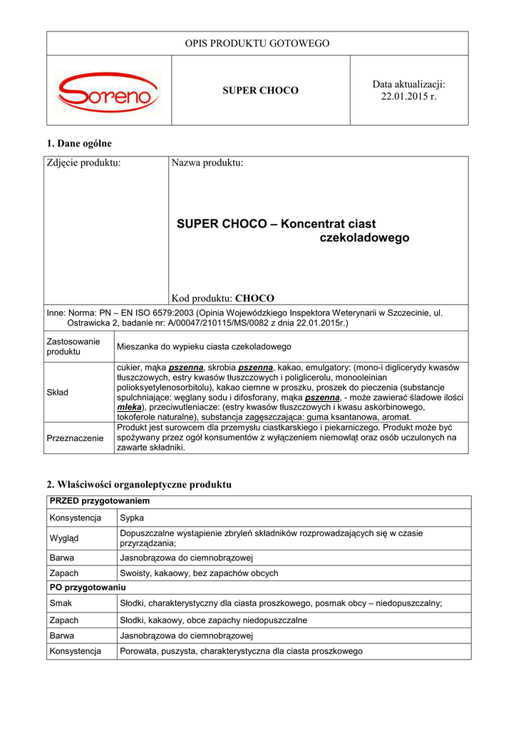 OPIS PRODUKTU GOTOWEGO SUPER CHOCO Data aktualizacji: 22.01.2015 r. 1. Dane ogólne Zdjęcie produktu: Nazwa produktu: SUPER CHOCO – Koncentrat ciast czekoladowego Kod produktu: CHOCO Inne: Norma: PN – EN ISO 6579:2003 (Opinia Wojewódzkiego Inspektora Weterynarii w Szczecinie, ul. Ostrawicka 2, badanie nr: A/00047/210115/MS/0082 z dnia 22.01.2015r.) Zastosowanie produktu Skład Przeznaczenie Mieszanka do wypieku ciasta czekoladowego cukier, mąka pszenna, skrobia pszenna, kakao, emulgatory: (mono-i diglicerydy kwasów tłuszczowych, estry kwasów tłuszczowych i poliglicerolu, monooleinian polioksyetylenosorbitolu), kakao ciemne w proszku, proszek do pieczenia (substancje spulchniające: węglany sodu i difosforany, mąka pszenna, - może zawierać śladowe ilości mleka), przeciwutleniacze: (estry kwasów tłuszczowych i kwasu askorbinowego, tokoferole naturalne), substancja zagęszczająca: guma ksantanowa, aromat. Produkt jest surowcem dla przemysłu ciastkarskiego i piekarniczego. Produkt może być spożywany przez ogół konsumentów z wyłączeniem niemowląt oraz osób uczulonych na zawarte składniki. 2. Właściwości organoleptyczne produktu PRZED przygotowaniem Konsystencja Sypka Wygląd Dopuszczalne wystąpienie zbryleń składników rozprowadzających się w czasie przyrządzania; Barwa Jasnobrązowa do ciemnobrązowej Zapach Swoisty, kakaowy, bez zapachów obcych PO przygotowaniu Smak Słodki, charakterystyczny dla ciasta proszkowego, posmak obcy – niedopuszczalny; Zapach Słodki, kakaowy, obce zapachy niedopuszczalne Barwa Jasnobrązowa do ciemnobrązowej Konsystencja Porowata, puszysta, charakterystyczna dla ciasta proszkowego 3. Właściwości fizykochemiczne produktu Ołów nie więcej niż 0,30 mg/kg Obecność metali szkodliwych dla zdrowia Kadm nie więcej niż 0,10 mg/kg Rtęć nie więcej niż 0,02 mg/kg Arsen nie więcej niż 0,20 mg/kg Obecność zanieczyszczeń Niedopuszczalna 4. Właściwości mikrobiologiczne produktu Ogólna liczba drobnoustrojów w 1g Gronkowce chorobotwórcze w 0,1g Pałeczki Salmonella w 25g 5 Nie więcej niż: 2 x 10 Nieobecne Nieobecne 5. Opakowanie produktu Rodzaj opakowania Masa netto w opakowaniu Paletyzacja Worek papierowy z warstwą folii 10 kg i 20 kg 60 x 10 kg i 30 x 20 kg Opakowania, które mają bezpośrednią styczność z produktami są przeznaczone do bezpośredniego kontaktu z żywnością. 6. Przechowywanie produktu Warunki przechowywania Opakowania zamknięte (zszyte), szczelne, zabezpieczone przed dostępem wilgoci, powietrza i światła, w pomieszczeniach suchych, czystych i chłodnych, wolnych od szkodników. Okres przechowywania 8 miesięcy od daty produkcji 7. Oznakowanie produktu Na etykiecie powinny znaleźć się następujące informacje: - nazwa produktu, - nazwa i adres producenta, - skład, - przeznaczenie - zawartość netto, - przepis przygotowania - data ważności, - oznaczenie partii produkcyjnej - sposób i warunki przechowywania 8. Transport Odbywa się za pomocą transportu środków spożywczych, w warunkach zapewniających właściwe utrzymanie jakości produktu. 9. Oświadczenie GMO Niniejszym oświadczamy, że nie podlega modyfikacją genetycznym oraz nie zawiera składników genetycznie modyfikowanych. 10. Składniki alergenne produktu Deklaracja o obecności składników alergennych Dyrektywa Komisji 2000/13/WE z późniejszymi zmianami Produkt / surowiec zawiera Lp. Nazwa składnika Objaśnienie / komentarz TAK NIE Zboża zawierające gluten (tj. pszenica, żyto, jęczmień, owies zwyczajny, pszenica oplewiona / 1. X orkisz, kamut lub ich szczepy hybrydowe) i produkty pochodne 2. Skorupiaki i produkty pochodne X 3. Jaja i produkty pochodne X 4. Ryby i produkty pochodne X Orzeszki ziemne / orzeszki arachidowe i produkty pochodne 6. Nasiona soi i produkty pochodne 5. 7. Mleko i z laktozą) produkty pochodne (łącznie X X X Orzechy, tj. migdał, orzech laskowy, orzech włoski, 8. nerkowiec, orzech pekan, orzech brazylijski, pistacja, orzech pistacjowy, orzech makdamia. X 9. Seler i produkty pochodne X 10. Gorczyca i produkty pochodne X 11. Nasiona sezamu i produkty pochodne X 12. Dwutlenek siarki i siarczyny w stężeniach powyżej 10 mg/kg lub 10 mg/l w przeliczeniu na SO2 X 13. Łubin i produkty pochodne X 14. Mięczaki i produkty pochodne X Może zawierać śladowe ilości: jaj, soi, orzechów, sezamu i łubinu 11. Wartość energetyczna i odżywcza produktu Wartość energetyczna Tłuszcze W tym kwasy tłuszczowe nasycone 370 kcal / 1535 kJ 1,0 g 0,8 g Białko 3,9 g Węglowodany 84,0 g Wartości obliczone na podstawie deklaracji dostawców i tabel wartości odżywczych IŻIŻ. Wartości te podlegają biologicznym W tym cukier 41,3 g Błonnik 1,4 g Sód 0,3 g i produkcyjno – technicznym naturalnym wahaniom. Dokument został przygotowany w wersji elektronicznej i jest ważny bez podpisu. Informacje zawarte w dokumencie zostały opracowane na podstawie danych uzyskanych od naszych dostawców; naszej wiedzy i doświadczeniu oraz obowiązujących przepisach prawa. Wszystkie dane są aktualne w chwili obecnej, jednak dane te mogą ulec zmianie w zależności od właściwości surowców użytych w produkcji. Niniejszy dokument ma charakter informacyjny.