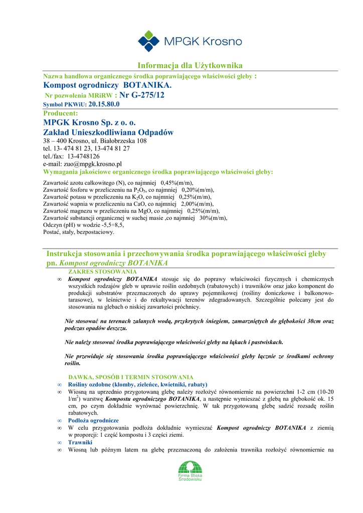 INSTRUKCJA STOSOWANIA - Kompost ogrodniczy BOTANIKA