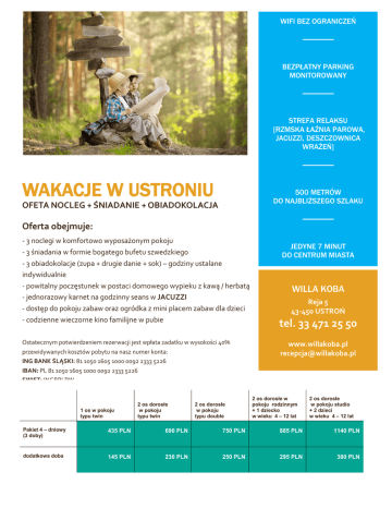 WIFI BEZ OGRANICZEŃ BEZPŁATNY PARKING MONITOROWANY STREFA RELAKSU [RZMSKA ŁAŹNIA PAROWA, JACUZZI, DESZCZOWNICA WRAŻEŃ] WAKACJE W USTRONIU 500 METRÓW DO NAJBLIŻSZEGO SZLAKU OFETA NOCLEG + ŚNIADANIE + OBIADOKOLACJA Oferta obejmuje: - 3 noclegi w komfortowo wyposażonym pokoju - 3 śniadania w formie bogatego bufetu szwedzkiego - 3 obiadokolacje (zupa + drugie danie + sok) – godziny ustalane indywidualnie - powitalny poczęstunek w postaci domowego wypieku z kawą / herbatą - jednorazowy karnet na godzinny seans w JACUZZI - dostęp do pokoju zabaw oraz ogródka z mini placem zabaw dla dzieci - codzienne wieczorne kino familijne w pubie Ostatecznym potwierdzeniem rezerwacji jest wpłata zadatku w wysokości 40% przewidywanych kosztów pobytu na nasz numer konta: ING BANK ŚLĄSKI: 81 1050 1605 1000 0092 2333 5226 IBAN: PL 81 1050 1605 1000 0092 2333 5226 SWIFT: INGBPLPW JEDYNE 7 MINUT DO CENTRUM MIASTA WILLA KOBA Reja 5 43-450 USTROŃ tel. 33 471 25 50 www.willakoba.pl [email protected] * Oferta obowiązuje od 1 lipca do 11 września 1 os w pokoju typu twin 2 os dorosłe w pokoju typu twin 2 os dorosłe w pokoju typu double 2 os dorosłe w pokoju rodzinnym + 1 dziecko w wieku 4 – 12 lat 2 os dorosłe w pokoju studio + 2 dzieci w wieku 4 – 12 lat Pakiet 4 – dniowy (3 doby) 435 PLN 690 PLN 750 PLN 885 PLN 1140 PLN dodatkowa doba 145 PLN 230 PLN 250 PLN 295 PLN 380 PLN