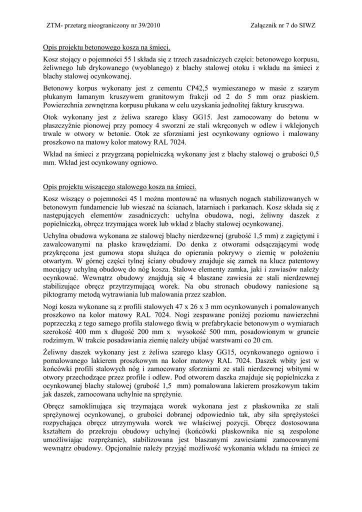 ZTM- przetarg nieograniczony nr 39/2010 Załącznik nr 7 do SIWZ Opis projektu betonowego kosza na śmieci. Kosz stojący o pojemności 55 l składa się z trzech zasadniczych części: betonowego korpusu, żeliwnego lub drykowanego (wyoblanego) z blachy stalowej otoku i wkładu na śmieci z blachy stalowej ocynkowanej. Betonowy korpus wykonany jest z cementu CP42,5 wymieszanego w masie z szarym płukanym łamanym kruszywem granitowym frakcji od 2 do 5 mm oraz piaskiem. Powierzchnia zewnętrzna korpusu płukana w celu uzyskania jednolitej faktury kruszywa. Otok wykonany jest z żeliwa szarego klasy GG15. Jest zamocowany do betonu w płaszczyźnie pionowej przy pomocy 4 sworzni ze stali wkręconych w odlew i wklejonych trwale w otwory w betonie. Otok ze sforzniami jest ocynkowany ogniowo i malowany proszkowo na matowy kolor matowy RAL 7024. Wkład na śmieci z przygrzaną popielniczką wykonany jest z blachy stalowej o grubości 0,5 mm. Wkład jest ocynkowany ogniowo. Opis projektu wiszącego stalowego kosza na śmieci. Kosz wiszący o pojemności 45 l można montować na własnych nogach stabilizowanych w betonowym fundamencie lub wieszać na ścianach, latarniach i parkanach. Kosz składa się z następujących elementów zasadniczych: uchylna obudowa, nogi, żeliwny daszek z popielniczką, obręcz trzymająca worek lub wkład z blachy stalowej ocynkowanej. Uchylna obudowa wykonana ze stalowej blachy nierdzewnej (grubość 1,5 mm) z zagiętymi i zawalcowanymi na płasko krawędziami. Do denka z otworami odsączającymi wodę przykręcona jest gumowa stopa służąca do opierania pokrywy o ziemię w położeniu otwartym. W górnej części tylnej ściany obudowy znajduje się zamek na klucz patentowy mocujący uchylną obudowę do nóg kosza. Stalowe elementy zamka, jaki i zawiasów należy ocynkować. Wewnątrz obudowy znajdują się 4 blaszane zawiesia ze stali nierdzewnej stabilizujące obręcz przytrzymującą worek. Na obu stronach obudowy naniesione są piktogramy metodą wytrawiania lub malowania przez szablon. Nogi kosza wykonane są z profili stalowych 47 x 26 x 3 mm ocynkowanych i pomalowanych proszkowo na kolor matowy RAL 7024. Nogi zespawane poniżej poziomu nawierzchni poprzeczką z tego samego profila stalowego tkwią w prefabrykacie betonowym o wymiarach szerokość 400 mm x długość 200 mm x wysokość 500 mm, posadowionym w gruncie rodzimym. W trakcie posadawiania ziemię należy ubijać warstwami co 20 cm. Żeliwny daszek wykonany jest z żeliwa szarego klasy GG15, ocynkowanego ogniowo i pomalowanego lakierem proszkowym na kolor matowy RAL 7024. Daszek wbity jest w końcówki profili stalowych nóg i zamocowany sforzniami ze stali nierdzewnej wbitymi w otwory przechodzące przez profile i odlew. Pod otworem daszka znajduje się popielniczka z ocynkowanej blachy stalowej (grubość 1,5 mm) pomalowana lakierem proszkowym takim jak daszek, zamocowana uchylnie na sprężynie. Obręcz samoklinująca się trzymająca worek wykonana jest z płaskownika ze stali sprężynowej ocynkowanej, o grubości dobranej odpowiednio tak, aby siła sprężystości rozpychająca obręcz utrzymywała worek we właściwej pozycji. Obręcz dostosowana kształtem do przekroju obudowy uchylnej (końcówki płaskownika nie są zespolone umożliwiając rozprężanie), stabilizowana jest blaszanymi zawiesiami zamocowanymi wewnątrz obudowy. Opcjonalnie należy przyjąć możliwość wykonania wkładu na śmieci ze ZTM- przetarg nieograniczony nr 39/2010 Załącznik nr 7 do SIWZ blachy stalowej (grubości 1 mm) ocynkowanej odpowiadającego wewnętrznemu obrysowi uchylnej obudowy ze stali nierdzewnej z zachowaniem tolerancji ok. 8 mm. W wersjach kosza mocowanych do ścian, latarni, ogrodzeń profile stalowe nóg kosza kończą się na wysokości dolnej krawędzi obudowy uchylnej, oraz zespawane są ze sobą dwoma płaskownikami stalowymi o wymiarach 4 x 30 mm. Całość powstałej w ten sposób ramki mocującej jest ocynkowana i pomalowana proszkowo na kolor matowy RAL 7024. W zależności od obiektu, do którego kosz będzie mocowany, do ramki mocującej należy przykręcić odpowiednie zawiesie. Pozostałe elementy i zasada działania kosza w tych wersjach nie ulega zmianie. Projektanci: Grzegorz Niwiński i Jerzy Porębski