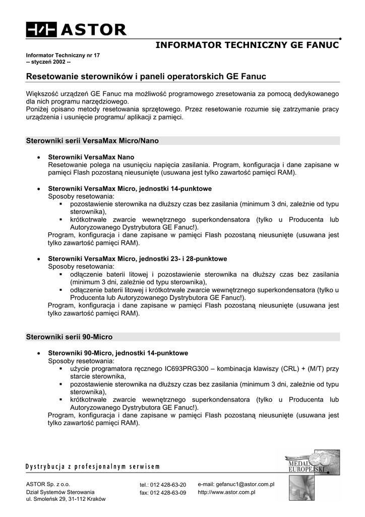 INFORMATOR TECHNICZNY GE FANUC Informator Techniczny nr 17 -- styczeń 2002 -- Resetowanie sterowników i paneli operatorskich GE Fanuc Większość urządzeń GE Fanuc ma możliwość programowego zresetowania za pomocą dedykowanego dla nich programu narzędziowego. Poniżej opisano metody resetowania sprzętowego. Przez resetowanie rozumie się zatrzymanie pracy urządzenia i usunięcie programu/ aplikacji z pamięci. Sterowniki serii VersaMax Micro/Nano • Sterowniki VersaMax Nano Resetowanie polega na usunięciu napięcia zasilania. Program, konfiguracja i dane zapisane w pamięci Flash pozostaną nieusunięte (usuwana jest tylko zawartość pamięci RAM). • Sterowniki VersaMax Micro, jednostki 14-punktowe Sposoby resetowania: pozostawienie sterownika na dłuższy czas bez zasilania (minimum 3 dni, zależnie od typu sterownika), krótkotrwałe zwarcie wewnętrznego superkondensatora (tylko u Producenta lub Autoryzowanego Dystrybutora GE Fanuc!). Program, konfiguracja i dane zapisane w pamięci Flash pozostaną nieusunięte (usuwana jest tylko zawartość pamięci RAM). • Sterowniki VersaMax Micro, jednostki 23- i 28-punktowe Sposoby resetowania: odłączenie baterii litowej i pozostawienie sterownika na dłuższy czas bez zasilania (minimum 3 dni, zależnie od typu sterownika), odłączenie baterii litowej i krótkotrwałe zwarcie wewnętrznego superkondensatora (tylko u Producenta lub Autoryzowanego Dystrybutora GE Fanuc!). Program, konfiguracja i dane zapisane w pamięci Flash pozostaną nieusunięte (usuwana jest tylko zawartość pamięci RAM). Sterowniki serii 90-Micro • Sterowniki 90-Micro, jednostki 14-punktowe Sposoby resetowania: użycie programatora ręcznego IC693PRG300 – kombinacja klawiszy (CRL) + (M/T) przy starcie sterownika, pozostawienie sterownika na dłuższy czas bez zasilania (minimum 3 dni, zależnie od typu sterownika), krótkotrwałe zwarcie wewnętrznego superkondensatora (tylko u Producenta lub Autoryzowanego Dystrybutora GE Fanuc!). Program, konfiguracja i dane zapisane w pamięci Flash pozostaną nieusunięte (usuwana jest tylko zawartość pamięci RAM). ASTOR Sp. z o.o. Dział Systemów Sterowania ul. Smoleńsk 29, 31-112 Kraków tel.: 012 428-63-20 fax: 012 428-63-09 e-mail: [email protected] http://www.astor.com.pl • Sterowniki 90-Micro, jednostki 23- i 28-punktowe Sposoby resetowania: użycie programatora ręcznego IC693PRG300 – kombinacja klawiszy (CRL) + (M/T) przy starcie sterownika, krótkotrwałe odłączenie baterii litowej i zwarcie na płytce pól lutowniczych dla baterii (tylko u Producenta lub Autoryzowanego Dystrybutora GE Fanuc!). Program, konfiguracja i dane zapisane w pamięci Flash pozostaną nieusunięte (usuwana jest tylko zawartość pamięci RAM). Sterowniki serii 90-30 • Jednostki centralne CPU311, CPU313, CPU323 Sposoby resetowania: użycie programatora ręcznego IC693PRG300 – kombinacja klawiszy (CRL) + (M/T) przy starcie sterownika, pozostawienie sterownika na dłuższy czas bez zasilania i bez baterii litowej zarówno w CPU jak i w zasilaczu (minimum 3 dni, zależnie od typu CPU), resetowanie uzyskuje się też przez krótkotrwałe zwarcie wewnętrznego superkondensatora (tylko u Producenta lub Autoryzowanego Dystrybutora GE Fanuc!). Program, konfiguracja i dane zapisane w pamięci PROM pozostaną nieusunięte (usuwana jest tylko zawartość pamięci RAM). • Jednostki centralne CPU331, CPU341 Sposoby resetowania: użycie programatora ręcznego IC693PRG300 – kombinacja klawiszy (CRL) + (M/T) przy starcie sterownika, zależnie od serii produkcyjnej resetowanie uzyskuje się też przez: (dotyczy jednostek produkowanych od roku 1998) krótkotrwałe zwarcie punktów oznaczonych jako MEM CLR, zlokalizowanych od strony gniazda połączeniowego lub (dotyczy jednostek wyprodukowanych przed rokiem 1998) poprzez krótkotrwałe zwarcie wewnętrznego superkondensatora (tylko u Producenta lub Autoryzowanego Dystrybutora GE Fanuc!). Program, konfiguracja i dane zapisane w pamięci PROM pozostaną nieusunięte (usuwana jest tylko zawartość pamięci RAM). Jednostki centralne CPU350, CPU351, CPU352, CPU360, CPU363, CPU364 W celu zresetowania należy zdjąć przednią pokrywę odszukać na spodniej części płytki drukowanej punkty oznaczone symbolem MEM CLR, a następnie krótkotrwale zewrzeć je. Program, konfiguracja i dane zapisane w pamięci Flash pozostaną nieusunięte (usuwana jest tylko zawartość pamięci RAM). Sterowniki serii VersaMax Resetowanie uzyskuje się przez krótkotrwałe zwarcie punktów oznaczonych jako MEM CLR, do których jest dostęp się po wyjęciu baterii litowej. Należy wcześniej wyłączyć zasilanie sterownika! Program, konfiguracja i dane zapisane w pamięci Flash pozostaną nieusunięte (usuwana jest tylko zawartość pamięci RAM). 2 Sterowniki serii MiniOCS, OCS, RSC • • • Sterowniki MiniOCS kombinacja klawiszy (F1) + (strzałka w górę) + (enter) powoduje zatrzymanie sterownika i usunięcie programu, kombinacja klawiszy (F1) + (F2) + (strzałka w górę) powoduje tylko restart sterownika (jest równoznaczna z wyłączeniem i włączeniem zasilania). W tym przypadku nie jest usuwany program sterujący. Sterowniki OCS kombinacja klawiszy (F1) + (strzałka w górę) + (enter) powoduje zatrzymanie sterownika i usunięcie programu, kombinacja klawiszy (F1) + (F2) + (strzałka w górę) powoduje tylko restart cyklu sterownika (jest równoznaczna z wyłączeniem i włączeniem zasilania). W tym przypadku nie jest usuwany program sterujący. Sterowniki RCS Aby zresetować jednostkę RCS należy ustawić adres sieciowy (ID) na w pozycję FE (mniej znacząca cyfra na E, bardziej znacząca na F). Następnie należy wyłączyć i załączyć sterownik, zaczekać aż jednostka centralna przejdzie fazę inicjalizacji i wtedy zmienić adres na FF. Należy ponownie wyłączyć i załączyć zasilanie - spowoduje to usunięcie programu z pamięci. Panele operatorskie serii Datapanel Brak moż