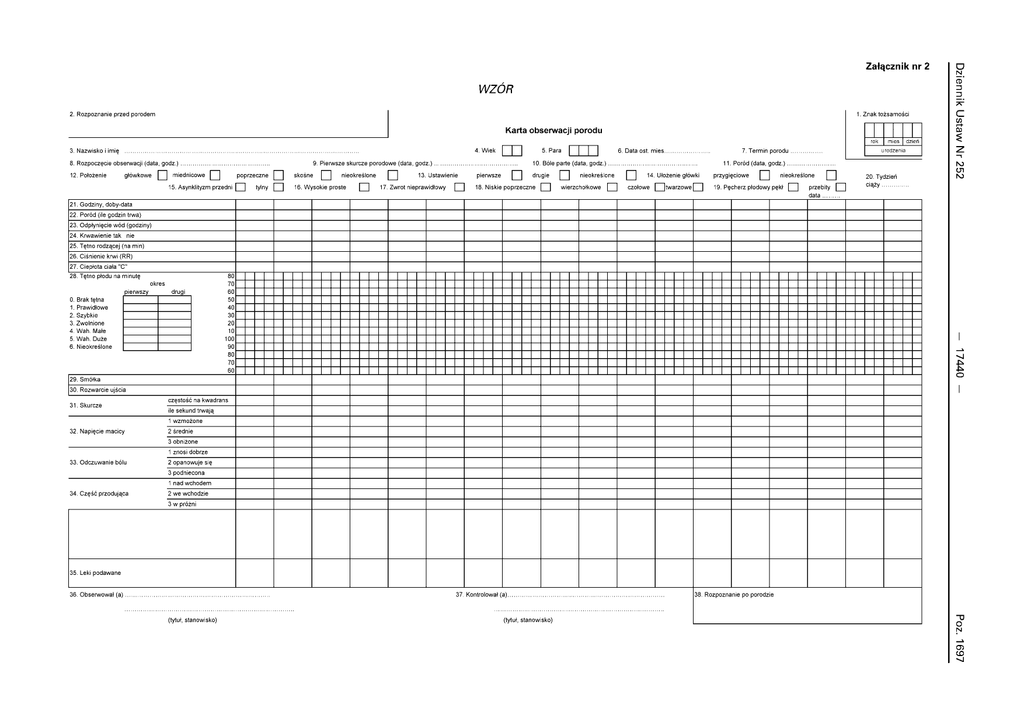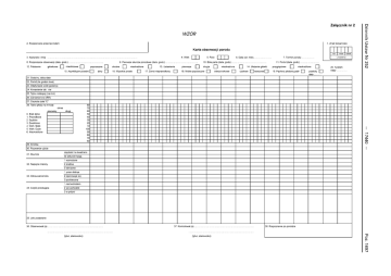 Załącznik nr 2 O N CD" WZÓR TT 2. Rozpoznanie przed porodem 1. Znak tożsamości c co Karta obserwacji porodu i—h 3. Nazwisko i imię 6. Data ost. mies.. 8. Rozpoczęcie obserwacji (data, godz.) 12. Położenie główkowe Q 9. Pierwsze skurcze porodowe (data, godz.) miednicowe Q poprzeczne 15. Asynklityzm przedni | | tylny | skośne | [ | nieokreślone 16. Wysokie proste | 13. Ustawienie 17. Zwrot nieprawidłowy [ pierwsze m | 7. Termin porodu 10. Bóle parte (data, godz.) | drugie 18. Niskie poprzeczne | [ | | 11. Poród (data, godz.) nieokreślone wierzchołkowe | | | 14. Ułożenie główki czołowe | |twarzowej przygięciowe | | | nieokreślone nieokreślone 19. Pęcherz płodowy pękł | | przebity data Q 20. Tydzień ciąży M Ol M 21. Godziny, doby-data 22. Poród (ile godzin trwa) 23. Odpłynięcie wód (godziny) 24. Krwawienie tak nie 25. Tętno rodzącej (na min) 26. Ciśnienie krwi (RR) 27. Ciepłota ciała "C" 28. Tętno płodu na minutę okres pierwszy drugi 0. Brak tętna 1. Prawidłowe 2. Szybkie 3. Zwolnione 4. Wah. Małe 5. Wah. Duże 6. Nieokreślone 80 70 60 50 40 30 20 10 100 90 80 70 60 O 29. Smółka 30. Rozwarcie ujścia 31. Skurcze częstość na kwadrans ile sekund trwają 1 wzmożone 32. Napięcie macicy 2 średnie 3 obniżone 1 znosi dobrze 33. Odczuwanie bólu 2 opanowuje się 3 podniecona 1 nad wchodem 34. Część przodująca 2 we wchodzie 3 w próżni 35. Leki podawane 36. Obserwował (a) 37. Kontrolował (a) (tytuł, stanowisko) (tytuł, stanowisko) 38. Rozpoznanie po porodzie "O o N CT) CD