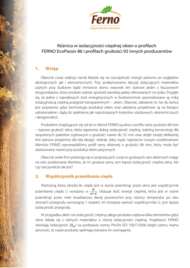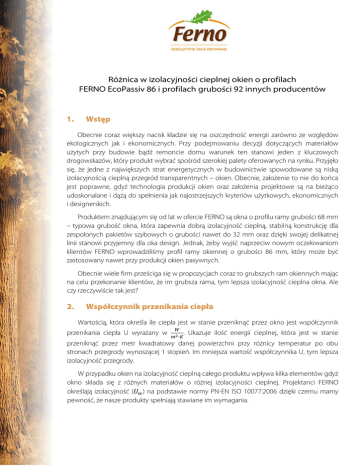 Różnica w izolacyjności cieplnej okien o profilach FERNO EcoPassiv 86 i profilach grubości 92 innych producentów 1. Wstęp Obecnie coraz większy nacisk kładzie się na oszczędność energii zarówno ze względów ekologicznych jak i ekonomicznych. Przy podejmowaniu decyzji dotyczących materiałów użytych przy budowie bądź remoncie domu warunek ten stanowi jeden z kluczowych drogowskazów, który produkt wybrać spośród szerokiej palety oferowanych na rynku. Przyjęło się, że jedne z największych strat energetycznych w budownictwie spowodowane są niską izolacyjnością cieplną przegród transparentnych – okien. Obecnie, założenie to nie do końca jest poprawne, gdyż technologia produkcji okien oraz założenia projektowe są na bieżąco udoskonalane i dążą do spełnienia jak najostrzejszych kryteriów użytkowych, ekonomicznych i designerskich. Produktem znajdującym się od lat w ofercie FERNO są okna o profilu ramy grubości 68 mm – typowa grubość okna, która zapewnia dobrą izolacyjność cieplną, stabilną konstrukcję dla zespolonych pakietów szybowych o grubości nawet do 32 mm oraz dzięki swojej delikatnej linii stanowi przyjemny dla oka design. Jednak, żeby wyjść naprzeciw nowym oczekiwaniom klientów FERNO wprowadziliśmy profil ramy okiennej o grubości 86 mm, który może być zastosowany nawet przy produkcji okien pasywnych. Obecnie wiele firm prześciga się w propozycjach coraz to grubszych ram okiennych mając na celu przekonanie klientów, że im grubsza rama, tym lepsza izolacyjność cieplna okna. Ale czy rzeczywiście tak jest? 2. Współczynnik przenikania ciepła Wartością, która określa ile ciepła jest w stanie przeniknąć przez okno jest współczynnik przenikania ciepła U wyrażany w ∙ . Ukazuje ilość energii cieplnej, która jest w stanie przeniknąć przez metr kwadratowy danej powierzchni przy różnicy temperatur po obu stronach przegrody wynoszącej 1 stopień. Im mniejsza wartość współczynnika U, tym lepsza izolacyjność przegrody. W przypadku okien na izolacyjność cieplną całego produktu wpływa kilka elementów gdyż okno składa się z różnych materiałów o różnej izolacyjności cieplnej. Projektanci FERNO określają izolacyjność ( ) na podstawie normy PN-EN ISO 10077:2006 dzięki czemu mamy pewność, że nasze produkty spełniają stawiane im wymagania. ∙ ∙ ∙ Gdzie: – współczynnik przenikania ciepła dla: w – okna, f – ramy okiennej, g – pakietu szybowego – pole powierzchni: f – ramy okiennej, g – szklenia – liniowy współczynnik przenikania ciepła mostka – ramki międzyszybowej – długość ramki międzyszybowej Jak widać wzór przedstawia wpływ na przenikalność ciepła zarówno pakietu szybowego, ramy okiennej jak i liniowego mostka cieplnego, który w tym przypadku stanowi ramka międzyszybowa. Do uzyskania okna o jak najniższym współczynniku przenikalności cieplnej potrzebujemy zatem materiałów, których współczynnik ten będzie również miał jak najniższą wartość. Zarówno w przypadku zespolonego pakietu szybowego jak i ramki dystansowej odnalezienie współczynnika U jest łatwe, gdyż wartości te podawane są przez producentów tych materiałów. Co do współczynnika przenikalności cieplnej ramy okiennej przypadek jest zupełnie inny – producenci niechętnie podają jego wartość. Dlaczego? Odpowiedź jest prosta – wpływ izolacyjności cieplnej ramy na izolacyjność cieplną całego okna jest znikomy. Dodatkowo, pomimo bardzo zróżnicowanych grubości ram, wartość współczynnika zmienia się minimalnie i przy różnych grubościach może się nawet okazać, że współczynnik pozostaje taki sam. Profil FERNO EcoPassiv przy grubości 86 mm osiąga bardzo korzystny współczynnik 1,1 ∙ , którego wartość potwierdzają wyniki badań w specjalistycznych laboratoriach, podczas gdy profile o grubościach 92 mm osiągają 0,9 czy nawet 1,0 ∙ (dane innych producentów okien drewnianych udostępnione w internecie). Różnica jest znikoma, ale jak to się ma w odniesieniu dla całego okna? 3. Porównanie okien z ramami szerokościach 86 mm i 92 mm Wiele producentów okien drewnianych poleca profile o grubości 92 mm i zaznacza, że im grubszy profil tym lepsza izolacyjność cieplna. Ale czy rzeczywiście zastosowanie profilu 86 przyczynia się do znacznych strat energii cieplnej? Na pytanie można jednoznacznie odpowiedzieć podstawiając znane wartości do wzoru podanego w normie i porównując współczynniki przenikania ciepła U dla okna referencyjnego. Wartość Symbol Jednostka Współczynnik przenikania ciepła ramy Powierzchnia ramy Współczynnik przenikania ciepła szklenia Powierzchnia szklenia Współczynnik przenikania ciepła ramki międzyszybowej Długość ramki międzyszybowej Okno z ramą szerokości 86 mm Okno z ramą szerokości 92 mm 1,1 0,9 0,6 0,6 0,6 0,6 1,2 1,2 0,07 0,07 4,5 4,5 ∙ ∙ ∙ ∙ Zastosowany wzór wg normy Współczynnik przenikania ciepła ramy ∙ 0,94 ∙ 0,9 ∙ 0,88 0,9 Tabela: Porównanie wartości współczynnika przenikania ciepła dla okien z ramami 86 i 92 Jak widać, różnice w wartościach przenikalności cieplnej okien z ramami o różnych szerokościach różnią się setnymi częściami, co w ogólnym rozrachunku (wartości współczynników przenikania ciepła podawane z dokładnością do 0,1) można przyrównać do zerowej różnicy. Dlaczego w takim razie nie można pozostać przy profilu 68, skoro grubość ramy nie ma prawie wpływu na izolacyjność cieplną? Odpowiedź jest prosta – grubsze, a co za tym idzie „cieplejsze” pakiety szybowe nie zmieszczą się w wąskiej ramie 68. Największy wpływ na współczynnik przenikania ciepła w oknie ma zastosowany pakiet szybowy. Im szklenie lepiej izoluje, tym lepsze własności izolacyjne ma całe okno. Natomiast żeby pakiet szybowy miał odpowiednią izolacyjność termiczną producenci szyb stosują ró