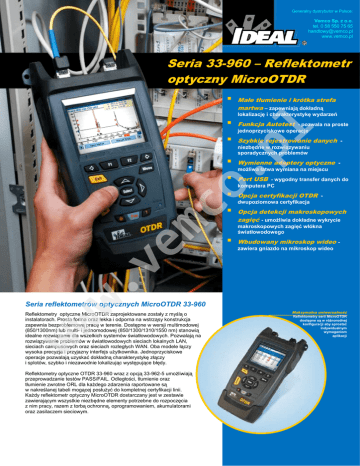 Generalny dystrybutor w Polsce: Vemco Sp. z o.o. tel. 0 58 550 75 65 [email protected] www.vemco.pl Seria 33-960 – Reflektometr optyczny MicroOTDR Małe tłumienie i krótka strefa martwa – zapewniają dokładną lokalizację i charakterystykę wydarzeń Funkcja Autotest - pozwala na proste Szybkie rejestrowanie danych - l jednoprzyciskowe operacje em co .p niezbędne w rozwiązywaniu sporadycznych problemów Wymienne adaptery optyczne - Port USB - wygodny transfer danych do Opcja certyfikacji OTDR - Opcja detekcji makroskopowych zagięć - umożliwia dokładne wykrycie możliwa łatwa wymiana na miejscu komputera PC dwupoziomowa certyfikacja makroskopowych zagięć włókna światłowodowego w. v Wbudowany mikroskop wideo - zawiera gniazdo na mikroskop wideo Seria reflektometrów optycznych MicroOTDR 33-960 ww Reflektometry optyczne MicroOTDR zaprojektowane zostały z myślą o instalatorach. Prosta forma oraz lekka i odporna na wstrząsy konstrukcja zapewnia bezproblemową pracę w terenie. Dostępne w wersji multimodowej (850/1300nm) lub multi- i jednomodowej (850/1300/1310/1550 nm) stanowią idealne rozwiązanie dla wszelkich systemów światłowodowych. Pozwalają na rozwiązywanie problemów w światłowodowych sieciach lokalnych LAN, sieciach campusowych oraz sieciach rozległych WAN. Oba modele łączy wysoka precyzja i przyjazny interfejs użytkownika. Jednoprzyciskowe operacje pozwalają uzyskać dokładną charakterystykę złączy i splotów, szybko i niezawodnie lokalizując występujące błędy. Reflektometry optyczne OTDR 33-960 wraz z opcją 33-962-5 umożliwiają przeprowadzanie testów PASS/FAIL. Odległości, tłumienie oraz tłumienie zwrotne ORL dla każdego zdarzenia raportowane są w nakreślanej tabeli mogącej posłużyć do kompletnej certyfikacji linii. Każdy reflektometr optyczny MicroOTDR dostarczany jest w zestawie zawierającym wszystkie niezbędne elementy potrzebne do rozpoczęcia z nim pracy, razem z torbą ochronną, oprogramowaniem, akumulatorami oraz zasilaczem sieciowym. Maksymalna uniwersalność Reflektometry serii MicroOTDR dostępne są w różnorodnej konfiguracji aby sprostać indywidualnym wymaganiom aplikacji Seria 33-960 Reflektometr OTDR – Modele i aplikacje Docelowe aplikacje em co .p Kluczowe funkcje: Niska tłumienność i krótka strefa martwa pozwala na dokładną lokalizację i charakterystykę zdarzeń nawet krótkich linii optycznych Funkcja Autotest dwóch długości fali z automatyczną regulacją parametrów testu Tryb manualny pozwala użytkownikom definiować wszystkie parametry testu Tryb rozwiązywania problemów w czasie rzeczywistym użyteczny jest w przypadku problemów pojawiających się jedynie przez krótkie przedziały czasu Czytelny opis zdarzeń Szybka rejestracja danych w. v Certyfikacja Tier-2 sieci premise i enterprise wymagająca testów OTDR. Parametry reflektometrów serii MicroOTDR 33-960 zostały idealnie dobrane dla tych aplikacji. Rosnące pasmo w światłowodowych sieciach lokalnych i campusowych wymaga dokładniejszego testowania. Seria 33-960 dostarcza wszystkich niezbędnych narzędzi testowych w przyjaznej formie. Rozwiązywanie problemów sieci światłowodowych wymaga użycia dokładnego i łatwego w użyciu reflektometru optycznego OTDR. Wysokie parametry techniczne i podręczna forma reflektometrów serii 33-960 stanowią idealne rozwiązanie do każdej instalacji. Sieci WAN i FTTH wymagają reflektometru OTDR z wysokim zakresem dynamiki. Oferowana dynamika na poziomie 29 dB reflektometrów serii 33-960 przekracza wymagania większości stanowisk pracy. l 33-960-1 MM OTDR ww Multimodowy reflektometr optyczny OTDR o długości fali 850 nm i 1300 nm. Reflektometr optyczny 33-960-1 MM OTDR umożliwia wykonanie dokładnych pomiarów nawet na bardzo krótkich odcinkach połączeń multimodowych stosowanych m.in. w szkielecie sieci. Naciśnij klawisz Autotest a urządzenie automatycznie wybierze optymalną konfigurację testu dla testowanego połączenia, tym samym pomagając niedoświadczonym użytkownikom uzyskać konkretne i dokładne wyniki testu. Bardziej doświadczeni użytkownicy za przydatne uznają tryb manulany i tryby rozwiązywania problemów działające w czasie rzeczywistym. Opcja oprogramowania 33-962-5 pozwala rozbudować reflektometry optyczne OTDR serii 33-960 o funkcję certyfikacji kabli światłowodowych stosujących typowe wskazania PASS/FAIL dla każdej testowanej linii. 33-960-3 Quad OTDR Reflektometr optyczny 33-960-3 Quad OTDR posiada te same funkcjonalności jak wersja MM powyżej. Dodatkowo zawiera jednak gniazdo dla długości fali 1310 nm i 1550 nm co czyni ten reflektometr uniwersalnym rozwiązaniem do testów multimodowych i jednomodowych kabli światłowodowych. Opcja oprogramowania 33-962-5 zawiera również detektor zagięć makroskopowych , umożliwiający użytkownikom określenie z maksymalną dokładnością obszary wzdłuż włókna gdzie promień zgięcia jest niewielki. Wymienialne adaptery optyczne z szerokim wyborem konfiguracji Dołączone oprogramowanie na komputer PC. Raporty w standardzie Bellcore™ Kolorowy wyświetlacz Gniazdo USB do połączenia z komputerem PC lub do podłączenia PenDrive USB Opcjonalne oprogramowanie do certyfikacji OTDR Opcja detekcji makroskopowych zagięć w światłowodach jednomodowych Wbudowany mikroskop wideo (więcej szczegółów w specyfikacji na stronie 4) Seria 33-960 Reflektometr OTDR – Oprogramowanie i opcje Wszechstronne oprogramowanie PC W skład każdego standardowego zestawu wchodzi wielojęzyczne oprogramowanie na komputer PC. Oprogramowanie używane jest do zarządzania wykresami reflektometrycznymi i wynikami testów. Pobieranie danych z reflektometru optycznego OTDR może być realizowane poprzez bezpośrednie połączenie z komputerem PC za pomocą portu USB lub za pośrednictwem kart pamięci. Tryb AUTO pozwala na prostą interpretację wykresów. Tryb EXPERT umożliwia bardziej doświadczonym uży