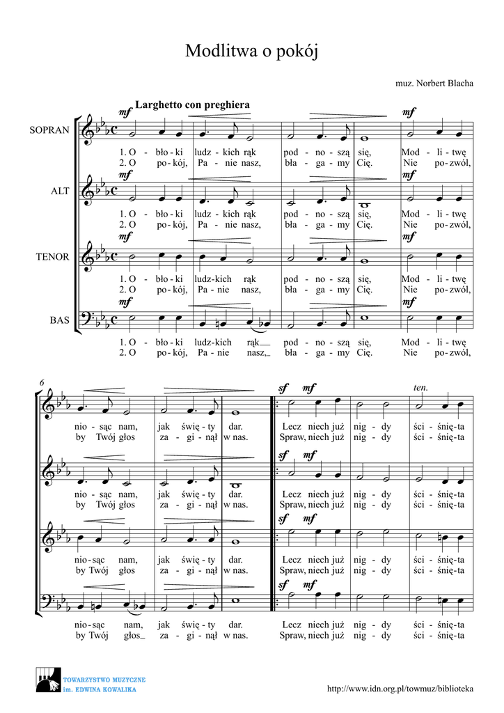 Modlitwa o pokój muz. Norbert Blacha ° b SOPRAN & b b c ˙ œ œ œ™ j œ ˙ b & b bc ˙ œ œ œ™ j œ ˙ b & b bc ˙ œ œ œ œ ?bc ˙ ¢ bb œ œ œ nœ mf Larghetto con preghiera 1. O - bło - ki ludz - kich rąk 2. O po - kój, Pa - nie nasz, mf ALT TENOR BAS pod - no - szą się, bła - ga - my Cię. 1. O - bło - ki ludz - kich 2. O po - kój, Pa - nie pod - no - szą się, bła - ga - my Cię. j œ™ œ ˙ nio - sąc nam, by Twój głos ?b ¢ b b œ nœ nio - sąc by Twój j œ™ œ w 1. O - bło - ki ludz - kich rąk 2. O po - kój, Pa - nie nasz, mf nio - sąc nam, by Twój głos nio - sąc by Twój ˙ pod - no - szą się, bła - ga - my Cię. ° b j &b b œ™ œ ˙ b &b b œ œ ˙ j œ œ™ w ˙ nam, głos ˙ j œ™ œ w ˙ j œ œ™ w ˙ j œ™ œ w j œ™ œ w rąk nasz, jak świę - ty dar. za - gi - nął w nas. jak świę - ty dar. za - gi - nął w nas. jak świę - ty dar. za - gi - nął w nas. ™™ ˙ sf mf œ œ ˙ sf mf œ œ ˙ œ œ ˙ œ œ Mod - li - twę Nie po - zwól, mf Mod - li - twę Nie po - zwól, mf ˙ œ œ Mod - li - twę Nie po - zwól, ˙ Lecz niech już nig - dy Spraw, niech już nig - dy ™™ ˙ ˙ Mod - li - twę Nie po - zwól, mf j œ™ œ w œ bœ ˙ jak świę - ty dar. za - gi - nął w nas. œ bœ ˙ nam, głos ˙ mf pod - no - szą się, bła - ga - my Cię. 1. O - bło - ki ludz - kich rąk 2. O po - kój, Pa - nie nasz, mf 6 b &b b ˙ j œ™ œ w œ œ ˙ ˙ ™™ ˙ œ œ ˙ ™™ ˙ œ œ ˙ ten. ˙ œ œ ści - śnię - ta ści - śnię - ta ˙ œ œ Lecz niech już nig - dy Spraw, niech już nig - dy sf mf ści - śnię - ta ści - śnię - ta ˙ ˙ nœ œ Lecz niech już nig - dy Spraw, niech już nig - dy sf mf ści - śnię - ta ści - śnię - ta ˙ ˙ nœ œ Lecz niech już nig - dy Spraw, niech już nig - dy ści - śnię - ta ści - śnię - ta http://www.idn.org.pl/towmuz/biblioteka ° b &b b w 2 12 ˙ pięść pięść b &b b ˙ nad nad na - szą na - szą ˙ ˙ nœ œ b˙ ˙ b & b b bw n˙ bœ œ ˙ ? b bw ¢ bb nad nad na - szą na - szą ˙ ˙ #œ œ n˙ ˙ nad nad pięść pięść pięść pięść nad nad na - szą na - szą na - szą na - szą ˙ zie - mią zie - mią ˙ pięść pięść ˙ œ œ œ œ nie nie wzno - si wzno - si ˙ zie - mią zie - mią zie - mią zie - mią się. się. nœ œ b w ˙ ™™ ™™ nie nie wzno - si wzno - si się. się. #˙ nœ œ w ™™ œ œ bw ™™ nie nie wzno - si wzno - si n˙ zie - mią zie - mią ˙ nie nie się. się. wzno - si wzno - si się. się. Ø CODA ° b &b b ˙ 17 meno mosso mf O mf b &b b ˙ O mf b &b b ˙ O ?b ˙ ¢ bb mf O œ œ po - kój, œ œ po - kój, œ œ po - kój, œ œ po - kój, œ™ Pa œ™ Pa œ rall. j œ ˙ - nie nasz, - j œ ˙ nie nasz, œ Pa - nie œ nœ Pa - nie ˙ nasz, œ bœ nasz, ˙ bła ˙ bła - - ˙ bła ˙ bła œ™ ga œ™ ga - - œ™ - - ga œ™ ga - - U j œ w my Cię. U j œ w my Cię. j U œ w my Cię. j U œ w my Cię. http://www.idn.org.pl/towmuz/biblioteka