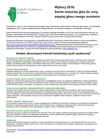 Wybory 2016: Zanim wrzucisz głos do urny, zapytaj głosu swego sumienia Powszechne wybory, które odbędą się 8 listopada, dają mieszkańcom stanu Illinois możliwość głosowania na kandydatów ubiegających się o urząd prezydenta Stanów Zjednoczonych, na członków Kongresu i do legislatury stanowej. Kościół katolicki jest instytucją bezpartyjną i nie popiera żadnego kandydata, ani też nie może wskazywać wiernym, na którego z kandydatów powinni głosować. Podczas, gdy wierni sami podejmują decyzje o tym, jak głosować w zgodzie z właściwie uformowanym sumieniem, Kościół udziela im porad pomocnych w rozeznawaniu decyzji. Konferencja Biskupów Amerykańskich uaktualniła dokument Formowanie sumień dla wierności w życiu obywatelskim (Forming Consciences for Faithful Citizenship), który można znaleźć na stronie internetowej pod adresem: www.usccb.org/issues-and-action/faithful-citizenship/index.cfm. Konferencja Biskupów Amerykańskich zachęca nas do uważnego zapoznania się z siedmioma zagadnieniami katolickiej nauki społecznej przytoczonymi poniżej, kiedy wybieramy kandydatów. Więcej informacji dostępnych jest pod adresem: www.ilcatholic.org. Siedem kluczowych kwestii katolickiej nauki społecznej* Obrona życia i godności ludzkiej Życie ludzkie jest święte a godność osoby ludzkiej jest fundamentem moralnej wizji społeczeństwa i katolickiej nauki społecznej. Aborcja, samobójstwo wspomagane przez lekarza, klonowanie, badania nad komórkami macierzystymi z udziałem embrionów ludzkich, jak również rasizm są złem, przed którym należy się chronić i któremu należy się przeciwstawiać. Promowanie godności ludzkiej i życia prowadzi nas do działania na rzecz wyeliminowania wojny i kary śmierci. Troska o Boże stworzenie Zostaliśmy wezwani do ochrony naszej planety, żyjąc w zgodzie ze wszystkimi Bożymi stworzeniami. Papież Franciszek podkreślił ważność naszej służby na rzecz Ziemi w swojej encyklice Laudato Si’ poświęconej trosce o wspólny dom. Papież zadaje w encyklice kluczowe pytanie: „Jaki świat chcemy przekazać tym, którzy będą po nas, dorastającym dzieciom?” Ochrona rodziny, życie w rodzinie i wspólnocie Społeczne i ekonomiczne przepisy prawne mają wpływ na perspektywę rozwoju we wspólnocie. Małżeństwo i rodzina są głównymi instytucjami społecznymi, które muszą otrzymywać wsparcie. Papież Franciszek wskazuje na ważność rodziny w encyklice Amoris Laetitia (Radość miłości) zauważając, że małżeństwo i rodzina są głównymi instytucjami, które muszą być wspierane przez władze. Ochrona praw człowieka i odpowiedzialność za każdą jednostkę ludzką Godność osoby ludzkiej może być chroniona, a zdrowe społeczeństwo może istnieć jedynie wówczas, gdy chronione są prawa człowieka i gdy podejmowana jest odpowiedzialność za każdą jednostkę ludzką. Każda osoba ludzka ma fundamentalne prawo do życia i wszystkiego, co jest potrzebne dla zachowania godnej ludzkiej egzystencji, takich jak: żywność, woda, schronienie, zatrudnienie i opieka zdrowotna. Jako obywatele, wszyscy mamy zobowiązania względem siebie nawzajem, względem naszych rodzin i społeczeństwa. Troska o ubogich i bezbronnych Choć wszystkim należy dobrze czynić, to osoby znajdujące się w największych potrzebach zasługują na priorytetowe potraktowanie. Moralnym sprawdzianem społeczeństwa jest to, jak obchodzi się ono z najsłabszymi włączając dzieci, osoby niepełnosprawne, uchodźców, osoby w podeszłym wieku, bezrobotnych, ubogich i osoby z marginesu społecznego. Szacunek dla pracy i prawa robotników Ekonomia musi służyć ludziom i nie powinno być odwrotnie. Praca jest swego rodzajem kontynuacją uczestniczenia w Bożym dziele stworzenia. Robotnicy muszą mieć zapewnione podstawowe prawa do godnej pracy, godziwej zapłaty, zbiorowych negocjacji, własności prywatnej i podejmowania inicjatywy gospodarczej. Solidarność Jesteśmy jedną rodziną ludzką bez względu na naszą przynależność narodową, etniczną, na sytuację ekonomiczną, czy różnice ideologiczne. Jesteśmy stróżami naszych braci i sióstr. Pracujemy, by za pośrednictwem dialogu, cywilizowanej, szanującej innych dyskusji tworzyć jedność. *Na podstawie: www.usccb.org/beliefs-and-teachings/what-we-believe/catholic-social-teaching/seven-themes-of-catholic-socialteaching.cfm