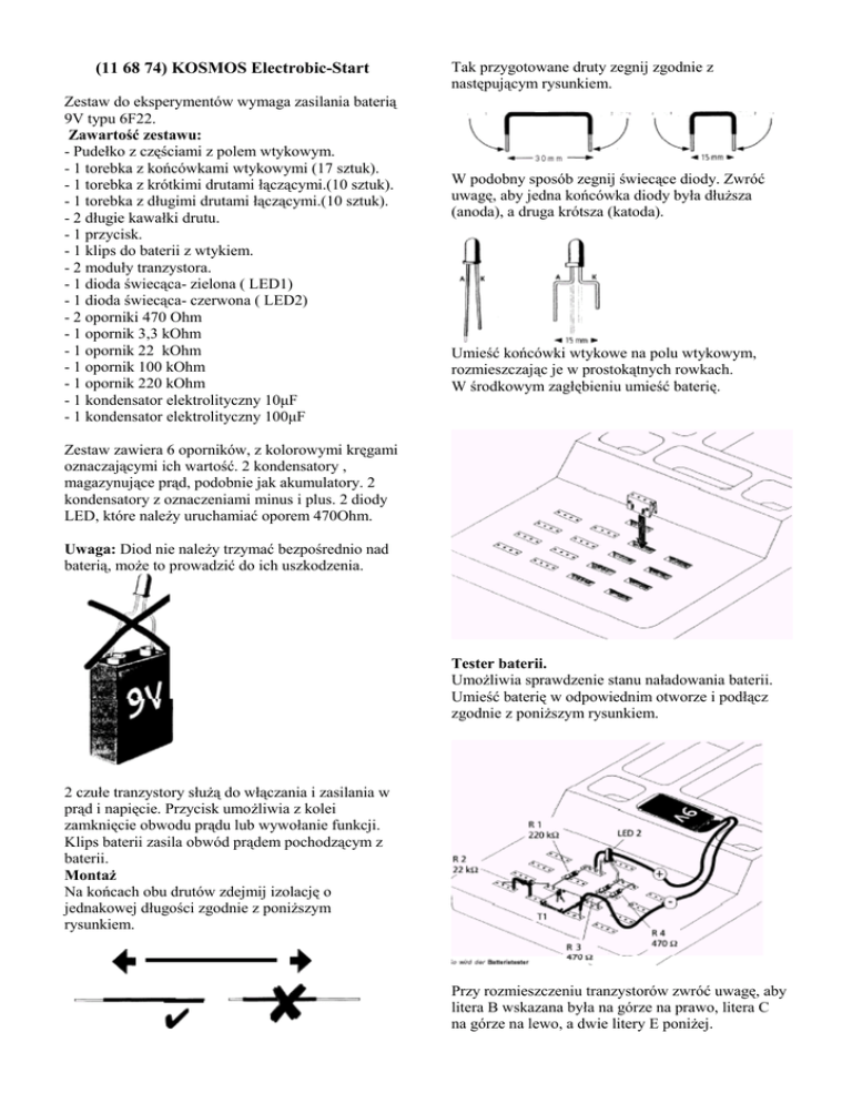 (11 68 74) KOSMOS Electrobic-Start Zestaw do eksperymentów wymaga zasilania baterią 9V typu 6F22. Zawartość zestawu: - Pudełko z częściami z polem wtykowym. - 1 torebka z końcówkami wtykowymi (17 sztuk). - 1 torebka z krótkimi drutami łączącymi.(10 sztuk). - 1 torebka z długimi drutami łączącymi.(10 sztuk). - 2 długie kawałki drutu. - 1 przycisk. - 1 klips do baterii z wtykiem. - 2 moduły tranzystora. - 1 dioda świecąca- zielona ( LED1) - 1 dioda świecąca- czerwona ( LED2) - 2 oporniki 470 Ohm - 1 opornik 3,3 kOhm - 1 opornik 22 kOhm - 1 opornik 100 kOhm - 1 opornik 220 kOhm - 1 kondensator elektrolityczny 10μF - 1 kondensator elektrolityczny 100μF Tak przygotowane druty zegnij zgodnie z następującym rysunkiem. W podobny sposób zegnij świecące diody. Zwróć uwagę, aby jedna końcówka diody była dłuższa (anoda), a druga krótsza (katoda). Umieść końcówki wtykowe na polu wtykowym, rozmieszczając je w prostokątnych rowkach. W środkowym zagłębieniu umieść baterię. Zestaw zawiera 6 oporników, z kolorowymi kręgami oznaczającymi ich wartość. 2 kondensatory , magazynujące prąd, podobnie jak akumulatory. 2 kondensatory z oznaczeniami minus i plus. 2 diody LED, które należy uruchamiać oporem 470Ohm. Uwaga: Diod nie należy trzymać bezpośrednio nad baterią, może to prowadzić do ich uszkodzenia. Tester baterii. Umożliwia sprawdzenie stanu naładowania baterii. Umieść baterię w odpowiednim otworze i podłącz zgodnie z poniższym rysunkiem. 2 czułe tranzystory służą do włączania i zasilania w prąd i napięcie. Przycisk umożliwia z kolei zamknięcie obwodu prądu lub wywołanie funkcji. Klips baterii zasila obwód prądem pochodzącym z baterii. Montaż Na końcach obu drutów zdejmij izolację o jednakowej długości zgodnie z poniższym rysunkiem. Przy rozmieszczeniu tranzystorów zwróć uwagę, aby litera B wskazana była na górze na prawo, litera C na górze na lewo, a dwie litery E poniżej. Czerwoną diodę wetknij w taki sposób, aby krótsze ramie umieści przy oznaczeniu K, a dłuższą przy oznaczeniu A. Klips baterii umieść na baterii zgodnie z poniższym rysunkiem, Uwaga: obydwie końcówki nie mogą do siebie dotykać, może to prowadzić do uszkodzenia baterii. W podobny sposób możesz przygotować sygnalizator deszczu. Owiń końcówki drutów bibułą, jeżeli pochłonie ona wodę, obwód zarejestruje obecność wilgoci i zielona dioda zapali się. Wetknij czerwony kabel klipsa baterii w końcówkę wtykową oznaczoną Plus, czarną – w minus. Jeżeli dioda będzie jasno świeciła, wszystko jest w porządku, bateria jest dobra. Jeżeli dioda świeci się słabo, kolejne obwody nie będą funkcjonowały z tą baterią Jeżeli dioda nie świeci, należy sprawdzić, czy wszystkie połączenia są prawidłowo, w przeciwnym razie bateria jest wyczerpana. Sygnalizator wilgotności. Umożliwia sprawdzenia przewodzenia wody i różnych przedmiotów. Plan połączeń sygnalizatora wilgotności. Umieść dwa druty A i B w szklance z wodą. Zielona dioda powinna zapalić się ,wskazując, że jest odpowiednia ilość wody. Wyjmij jeden drut ze szklanki. Zielona dioda zgaśnie i zapali się czerwona. To samo nastąpi jeżeli woda nie pokryje drutów lub będzie jej za mało. Zestaw ten umożliwia również sprawdzenie przewodzenia dowolnego przedmiotu. Należy zwrócić przy tym uwagę, aby obydwa przewody nie dotykały się. Jeżeli dany przedmiot dobrze przewodzi prąd, zielona doda zaświeci się. Urządzenie można używać również jako „wykrywacza kłamstw”. Jeżeli przymocujesz do ręki przewód, obwód zarejestruje wystąpienie potu, wydzielanego nadmiernie przy mówieniu nieprawdy. Urządzenie alarmowe. Końcówki wtykowe oznaczone A i B połącz długim drutem. Po podłączeniu baterii i naciśnięciu przycisku, czerwona dioda zostanie wyłączona. Zielona nie będzie świeciła przy tym eksperymencie. Odłączając dłuższą końcówkę przewodu, sprawdź działanie alarmu. Czerwona dioda zapali się i alarm zostanie włączony. Ponowne podłączenie drutu nie wyłączy alarmu, należy tego dokonać naciskając przycisk. Jeżeli kilkokrotnie uruchamiasz alarm. Czerwona dioda może nie zapalić się. Oznacza to przeładowanie kondensatora, który należy rozładować, dotykając obydwoma końcówkami do przedmiotu przewodzącego np. nożyczek. Kondensator będzie ponownie gotowy do pracy. Przełącznik czasu. Przełącznik ten służy do włączania, wyłączania i przełączania. Plan połączeń przełącznika czasu. Jeżeli odpowiednio przygotowałeś przełącznik i podłączyłeś baterie, może wystąpić sytuacja, że czerwona dioda będzie się świecić, a zielona będzie wyłączona. Odczekaj chwilę, aż urządzenie będzie gotowe do pracy. Naciśnij przycisk, podświetlenie diod powinno zmienić się. Po upływie czasu włączenia, przełącznik powróci do stanu początkowego. Czas włączenia uzależniony jest od kondensatora i opornika R5. Przełącznik świateł. Po przygotowaniu układu i włożeniu baterii, obydwie diody będą świeciły się na przemian, zmieniając się co 1 –2 sekundy. Długość świecenia możesz zmieniać zmieniając pozycję oporników lub przestawiając kondensatory. Czujnik temperatury. Poniższy eksperyment przedstawia zależność jasności świecenia diody od zmian temperatury Plan Połączeń Zmieniając np. pozycję R1 iR2 jak i C1 i C2, otrzymasz wszystkie możliwe kombinacje świecenia. Elektroniczny czujnik. Przygotuj układ, przy B wetknij pionowo dłuższą końcówkę drutu. Stań na dywanie lub podłodze z tworzywa sztucznego. Z kciuka i palca wskazującego zrób kółko wokół anteny, nie dotykając jej. Potrzyj nogami o podłogę. Dioda zapali się, sygnalizując powstanie statycznej elektryczności. Diody w układzie tym reagują następująco: -Jeżeli podgrzejemy tranzystor T1 ciepłym powietrzem, dioda będzie ciemniejsza. -Jeżeli po