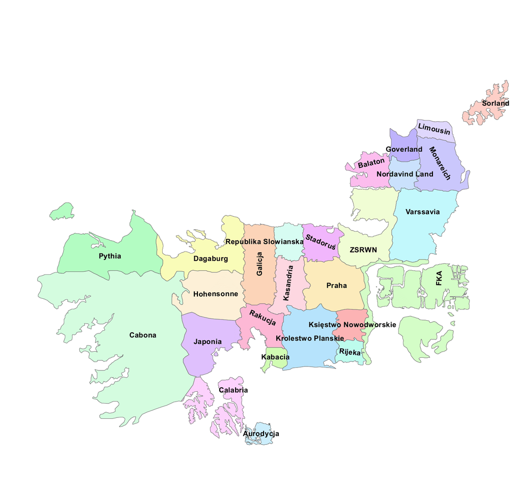 Sorland Lim o u re na on Mo Bala t Goverland s in ich Nordavind Land Varssavia Republika Slowianska Cabona ZSRWN cja Praha Księstwo Nowodworskie Krolestwo Planskie Japonia Kabacia Calabria Aurodycja Rije ka FKA Hohensonne Ra ku or u ś a Galicja Dagaburg Kas an d ri Pythia Sta d