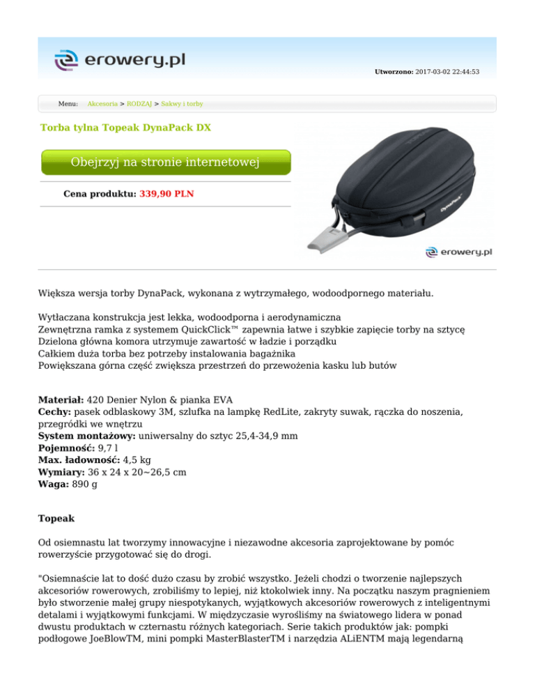 Utworzono: 2017-03-02 22:44:53 Menu: Akcesoria > RODZAJ > Sakwy i torby Torba tylna Topeak DynaPack DX Obejrzyj na stronie internetowej Cena produktu: 339,90 PLN Większa wersja torby DynaPack, wykonana z wytrzymałego, wodoodpornego materiału. Wytłaczana konstrukcja jest lekka, wodoodporna i aerodynamiczna Zewnętrzna ramka z systemem QuickClick™ zapewnia łatwe i szybkie zapięcie torby na sztycę Dzielona główna komora utrzymuje zawartość w ładzie i porządku Całkiem duża torba bez potrzeby instalowania bagażnika Powiększana górna część zwiększa przestrzeń do przewożenia kasku lub butów Materiał: 420 Denier Nylon & pianka EVA Cechy: pasek odblaskowy 3M, szlufka na lampkę RedLite, zakryty suwak, rączka do noszenia, przegródki we wnętrzu System montażowy: uniwersalny do sztyc 25,4-34,9 mm Pojemność: 9,7 l Max. ładowność: 4,5 kg Wymiary: 36 x 24 x 20~26,5 cm Waga: 890 g Topeak Od osiemnastu lat tworzymy innowacyjne i niezawodne akcesoria zaprojektowane by pomóc rowerzyście przygotować się do drogi. "Osiemnaście lat to dość dużo czasu by zrobić wszystko. Jeżeli chodzi o tworzenie najlepszych akcesoriów rowerowych, zrobiliśmy to lepiej, niż ktokolwiek inny. Na początku naszym pragnieniem było stworzenie małej grupy niespotykanych, wyjątkowych akcesoriów rowerowych z inteligentnymi detalami i wyjątkowymi funkcjami. W międzyczasie wyrośliśmy na światowego lidera w ponad dwustu produktach w czternastu różnych kategoriach. Serie takich produktów jak: pompki podłogowe JoeBlowTM, mini pompki MasterBlasterTM i narzędzia ALiENTM mają legendarną reputację i są niedoścignionymi punktami odniesienia dla innych producentów. Przez te lata zdobyliśmy szereg międzynarodowych design’erskich nagród, przyznawanych za nasze unikalne dzieła – to bardzo, bardzo miłe – ale najbardziej dumni jesteśmy z tego, że nasze produkty sprawiają radość ludziom, którzy kochają jeździć. Pewnie... napędzają nas innowacje, ale także nasza pasja do kolarstwa. Przygotój się do jazdy." Zespół Topeak Producent Topeak Opcja fotelika dziecięcego Rodzaj - Przeznaczenie Miejsce montażu Turystyczna Wyprawowa, Miejska Pod siodło Mimo dołożenia wszelkich starań nie gwarantujemy, że publikowane opisy i specyfikacje techniczne niezawierają uchybień lub błędów, które nie mogą jednak być podstawą do roszczeń. W przypadku jakichkolwiek wątpliwości, przed podjęciem decyzji prosimy o kontakt. Adres: www.erowery.pl Telefon: 605 515 185, 34 361 16 71 Email: [email protected]
