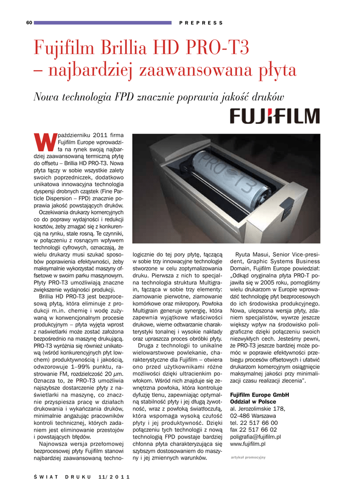 P R E P R E S S 60 Fujifilm Brillia HD PRO-T3 – najbardziej zaawansowana płyta Nowa technologia FPD znacznie poprawia jakość druków W październiku 2011 firma Fujifilm Europe wprowadziła na rynek swoją najbardziej zaawansowaną termiczną płytę do offsetu – Brillia HD PRO-T3. Nowa płyta łączy w sobie wszystkie zalety swoich poprzedniczek, dodatkowo unikatowa innowacyjna technologia dyspersji drobnych cząstek (Fine Particle Dispersion – FPD) znacznie poprawia jakość powstających druków. Oczekiwania drukarzy komercyjnych co do poprawy wydajności i redukcji kosztów, żeby zmagać się z konkurencją na rynku, stale rosną. Te czynniki, w połączeniu z rosnącym wpływem technologii cyfrowych, oznaczają, że wielu drukarzy musi szukać sposobów poprawienia efektywności, żeby maksymalnie wykorzystać maszyny offsetowe w swoim parku maszynowym. Płyty PRO-T3 umożliwiają znaczne zwiększenie wydajności produkcji. Brillia HD PRO-T3 jest bezprocesową płytą, która eliminuje z produkcji m.in. chemię i wodę zużywaną w konwencjonalnym procesie produkcyjnym – płyta wyjęta wprost z naświetlarki może zostać założona bezpośrednio na maszynę drukującą. PRO-T3 wyróżnia się również unikatową (wśród konkurencyjnych płyt lowchem) produktywnością i jakością, odwzorowuje 1–99% punktu, rastrowanie FM, rozdzielczość 20 µm. Oznacza to, że PRO-T3 umożliwia najszybsze dostarczenie płyty z naświetlarki na maszynę, co znacznie przyspiesza pracę w działach drukowania i wykańczania druków, minimalnie angażując pracowników kontroli technicznej, których zadaniem jest eliminowanie przestojów i powstających błędów. Najnowsza wersja przełomowej bezprocesowej płyty Fujifilm stanowi najbardziej zaawansowaną technoś W I A T D R U K U 11/ 2 0 1 1 logicznie do tej pory płytę, łączącą w sobie trzy innowacyjne technologie stworzone w celu zoptymalizowania druku. Pierwsza z nich to specjalna technologia struktura Multigrain, łącząca w sobie trzy elementy: ziarnowanie pierwotne, ziarnowanie komórkowe oraz mikropory. Powłoka Multigrain generuje synergię, która zapewnia wyjątkowe właściwości drukowe, wierne odtwarzanie charakterystyki tonalnej i wysokie nakłady oraz upraszcza proces obróbki płyty. Druga z technologii to unikalne wielowarstwowe powlekanie, charakterystyczne dla Fujifilm – otwiera ono przed użytkownikami różne możliwości dzięki ultracienkim powłokom. Wśród nich znajduje się zewnętrzna powłoka, która kontroluje dyfuzję tlenu, zapewniając optymalną stabilność płyty i jej długą żywotność, wraz z powłoką światłoczułą, która wspomaga wysoką czułość płyty i jej produktywność. Dzięki połączeniu tych technologii z nową technologią FPD powstaje bardziej chłonna płyta charakteryzująca się szybszym dostosowaniem do maszyny i jej zmiennych warunków. Ryuta Masui, Senior Vice-president, Graphic Systems Business Domain, Fujifilm Europe powiedział: „Odkąd oryginalna płyta PRO-T pojawiła się w 2005 roku, pomogliśmy wielu drukarzom w Europie wprowadzić technologię płyt bezprocesowych do ich środowiska produkcyjnego. Nowa, ulepszona wersja płyty, zdaniem specjalistów, wywrze jeszcze większy wpływ na środowisko poligraficzne dzięki połączeniu swoich niezwykłych cech. Jesteśmy pewni, że PRO-T3 jeszcze bardziej może pomóc w poprawie efektywności przebiegu procesów offsetowych i ułatwić drukarzom komercyjnym osiągnięcie maksymalnej jakości przy minimalizacji czasu realizacji zlecenia”. Fujifilm Europe GmbH Oddział w Polsce al. Jerozolimskie 178, 02-486 Warszawa tel. 22 517 66 00 fax 22 517 66 02 [email protected] www.fujifilm.pl artykuł promocyjny
