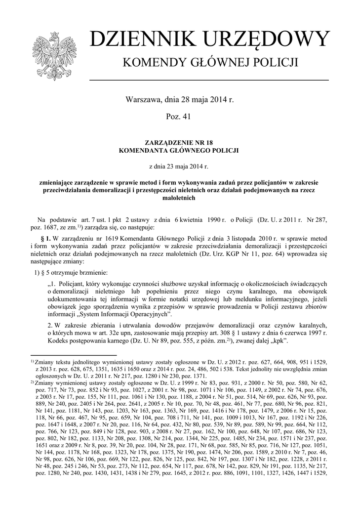 DZIENNIK URZĘDOWY KOMENDY GŁÓWNEJ POLICJI Warszawa, dnia 28 maja 2014 r. Poz. 41 ZARZĄDZENIE NR 18 KOMENDANTA GŁÓWNEGO POLICJI z dnia 23 maja 2014 r. zmieniające zarządzenie w sprawie metod i form wykonywania zadań przez policjantów w zakresie przeciwdziałania demoralizacji i przestępczości nieletnich oraz działań podejmowanych na rzecz małoletnich Na podstawie art. 7 ust. 1 pkt 2 ustawy z dnia 6 kwietnia 1990 r. o Policji (Dz. U. z 2011 r. Nr 287, poz. 1687, ze zm.1)) zarządza się, co następuje: § 1. W zarządzeniu nr 1619 Komendanta Głównego Policji z dnia 3 listopada 2010 r. w sprawie metod i form wykonywania zadań przez policjantów w zakresie przeciwdziałania demoralizacji i przestępczości nieletnich oraz działań podejmowanych na rzecz małoletnich (Dz. Urz. KGP Nr 11, poz. 64) wprowadza się następujące zmiany: 1) § 5 otrzymuje brzmienie: „1. Policjant, który wykonując czynności służbowe uzyskał informację o okolicznościach świadczących o demoralizacji nieletniego lub popełnieniu przez niego czynu karalnego, ma obowiązek udokumentowania tej informacji w formie notatki urzędowej lub meldunku informacyjnego, jeżeli obowiązek jego sporządzenia wynika z przepisów w sprawie prowadzenia w Policji zestawu zbiorów informacji „System Informacji Operacyjnych”. 2. W zakresie zbierania i utrwalania dowodów przejawów demoralizacji oraz czynów karalnych, o których mowa w art. 32e upn, zastosowanie mają przepisy art. 308 § 1 ustawy z dnia 6 czerwca 1997 r. Kodeks postępowania karnego (Dz. U. Nr 89, poz. 555, z późn. zm.2)), zwanej dalej „kpk”. 1) Zmiany tekstu jednolitego wymienionej ustawy zostały ogłoszone w Dz. U. z 2012 r. poz. 627, 664, 908, 951 i 1529, z 2013 r. poz. 628, 675, 1351, 1635 i 1650 oraz z 2014 r. poz. 24, 486, 502 i 538. Tekst jednolity nie uwzględnia zmian ogłoszonych w Dz. U. z 2011 r. Nr 217, poz. 1280 i Nr 230, poz. 1371. 2) Zmiany wymienionej ustawy zostały ogłoszone w Dz. U. z 1999 r. Nr 83, poz. 931, z 2000 r. Nr 50, poz. 580, Nr 62, poz. 717, Nr 73, poz. 852 i Nr 93, poz. 1027, z 2001 r. Nr 98, poz. 1071 i Nr 106, poz. 1149, z 2002 r. Nr 74, poz. 676, z 2003 r. Nr 17, poz. 155, Nr 111, poz. 1061 i Nr 130, poz. 1188, z 2004 r. Nr 51, poz. 514, Nr 69, poz. 626, Nr 93, poz. 889, Nr 240, poz. 2405 i Nr 264, poz. 2641, z 2005 r. Nr 10, poz. 70, Nr 48, poz. 461, Nr 77, poz. 680, Nr 96, poz. 821, Nr 141, poz. 1181, Nr 143, poz. 1203, Nr 163, poz. 1363, Nr 169, poz. 1416 i Nr 178, poz. 1479, z 2006 r. Nr 15, poz. 118, Nr 66, poz. 467, Nr 95, poz. 659, Nr 104, poz. 708 i 711, Nr 141, poz. 1009 i 1013, Nr 167, poz. 1192 i Nr 226, poz. 1647 i 1648, z 2007 r. Nr 20, poz. 116, Nr 64, poz. 432, Nr 80, poz. 539, Nr 89, poz. 589, Nr 99, poz. 664, Nr 112, poz. 766, Nr 123, poz. 849 i Nr 128, poz. 903, z 2008 r. Nr 27, poz. 162, Nr 100, poz. 648, Nr 107, poz. 686, Nr 123, poz. 802, Nr 182, poz. 1133, Nr 208, poz. 1308, Nr 214, poz. 1344, Nr 225, poz. 1485, Nr 234, poz. 1571 i Nr 237, poz. 1651 oraz z 2009 r. Nr 8, poz. 39, Nr 20, poz. 104, Nr 28, poz. 171, Nr 68, poz. 585, Nr 85, poz. 716, Nr 127, poz. 1051, Nr 144, poz. 1178, Nr 168, poz. 1323, Nr 178, poz. 1375, Nr 190, poz. 1474, Nr 206, poz. 1589, z 2010 r. Nr 7, poz. 46, Nr 98, poz. 626, Nr 106, poz. 669, Nr 122, poz. 826, Nr 125, poz. 842, Nr 197, poz. 1307 i Nr 182, poz. 1228, z 2011 r. Nr 48, poz. 245 i 246, Nr 53, poz. 273, Nr 112, poz. 654, Nr 117, poz. 678, Nr 142, poz. 829, Nr 191, poz. 1135, Nr 217, poz. 1280, Nr 240, poz. 1430, 1431, 1438 i Nr 279, poz. 1645, z 2012 r. poz. 886, 1091, 1101, 1327, 1426, 1447 i 1529, Dziennik Urzędowy Komendy Głównej Policji –2– Poz. 41 3. Zebrane w trybie art. 32e § 1 i 2 upn materiały w sprawie nieletniego przekazuje się niezwłocznie właściwemu sądowi rodzinnemu, powiadamiając o tym ujawnionych pokrzywdzonych, osobę zawiadamiającą o popełnieniu przestępstwa lub wykroczenia oraz komórkę do spraw nieletnich i patologii jednostki organizacyjnej Policji, właściwą ze względu na miejsce popełnienia czynu karalnego lub ujawnienia przejawów demoralizacji. 4. Komórka do spraw nieletnich i patologii właściwa ze względu na miejsce popełnienia czynu karalnego lub ujawnienia przejawów demoralizacji niezwłocznie zawiadamia komórkę do spraw nieletnich i patologii jednostki organizacyjnej Policji właściwej ze względu na miejsce zamieszkania nieletniego o popełnieniu czynu karalnego przez tego nieletniego lub ujawnieniu przejawów demoralizacji. 5. Meldunek informacyjny, przekazuje się komórce właściwej do realizacji informacji. 6. Przepisu ust. 3 nie stosuje się w przypadku wszczęcia postępowania przygotowawczego. 7. W sytuacji, o której mowa w ust. 6 materiały sprawy niezwłocznie przekazuje się właściwemu prokuratorowi.”; 2) § 6 otrzymuje brzmienie: „1. Osoby samowolnie przebywające poza schroniskiem dla nieletnich albo poza młodzieżowym ośrodkiem wychowawczym lub zakładem poprawczym umieszcza się w schronisku, ośrodku lub zakładzie, z którego się oddaliły, a jeśli jest to niemożliwe, w policyjnej izbie dziecka. 2. Policjant przekazuje nieletniego dyrektorowi właściwego schroniska, ośrodka, zakładu albo rodzicowi posiadającemu władzę rodzicielską lub opiekunowi, odbierając poświadczenie, którego wzór określa załącznik nr 1 do zarządzenia. 3. Policjant dokonujący zatrzymania nieletniego sporządza protokół zatrzymania nieletniego, którego wzór określa załącznik nr 1a do zarządzenia.”; 3) w § 7 pkt 1 otrzymuje brzmienie: „1) zbierania i utrwalania dowodów przejawów demoralizacji oraz czynów karalnych i wykonywania w tym zakresie czynności wynikających z art. 32e upn oraz art. 308 kpk;”; 4) § 12 otrzymuje brzmienie: „§ 12. Policjanci ujawniają nieletnich sprawców czynów karalnych oraz wykazujących przejawy demoralizacji, a także małoletnich, których dobro jest zagrożone w trakcie wykonywanych czynności służbowych 