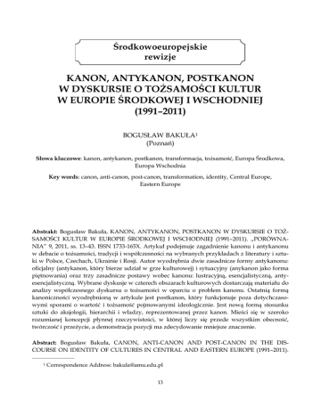 Bogusław Bakuła, Kanon, antykanon, postkanon w dyskursie o tożsamości kultur Środkowoeuropejskie rewizje KANON, ANTYKANON, POSTKANON W DYSKURSIE O TOŻSAMOŚCI KULTUR W EUROPIE ŚRODKOWEJ I WSCHODNIEJ (1991–2011) BOGUSŁAW BAKUŁA1 (Poznań) Słowa kluczowe: kanon, antykanon, postkanon, transformacja, tożsamość, Europa Środkowa, Europa Wschodnia Key words: canon, anti-canon, post-canon, transformation, identity, Central Europe, Eastern Europe Abstrakt: Bogusław Bakuła, KANON, ANTYKANON, POSTKANON W DYSKURSIE O TOŻSAMOŚCI KULTUR W EUROPIE ŚRODKOWEJ I WSCHODNIEJ (1991–2011). „PORÓWNANIA” 9, 2011, ss. 13–43. ISSN 1733-165X. Artykuł podejmuje zagadnienie kanonu i antykanonu w debacie o tożsamości, tradycji i współczesności na wybranych przykładach z literatury i sztuki w Polsce, Czechach, Ukrainie i Rosji. Autor wyodrębnia dwie zasadnicze formy antykanonu: oficjalny (antykanon, który bierze udział w grze kulturowej) i sytuacyjny (anykanon jako forma piętnowania) oraz trzy zasadnicze postawy wobec kanonu: lustracyjną, esencjalistyczną, antyesencjalistyczną. Wybrane dyskusje w czterech obszarach kulturowych dostarczają materiału do analizy współczesnego dyskursu o tożsamości w oparciu o problem kanonu. Ostatnią formą kanoniczności wyodrębnioną w artykule jest postkanon, który funkcjonuje poza dotychczasowymi sporami o wartość i tożsamość pojmowanymi ideologicznie. Jest nową formą stosunku sztuki do aksjologii, hierarchii i władzy, reprezentowanej przez kanon. Mieści się w szeroko rozumianej koncepcji płynnej rzeczywistości, w której liczy się przede wszystkim obecność, twórczość i przeżycie, a demonstracja pozycji ma zdecydowanie mniejsze znaczenie. Abstract: Bogusław Bakuła, CANON, ANTI-CANON AND POST-CANON IN THE DISCOURSE ON IDENTITY OF CULTURES IN CENTRAL AND EASTERN EUROPE (1991–2011). ________________ 1 Correspondence Address: [email protected] 13 PORÓWNANIA 9, 2011 „PORÓWNANIA” 9, 2011, pp. 13–43. ISSN 1733-165X. The article discusses the issues of canon and anti-canon in the debate on identity, tradition and contemporaneity on the basis of chosen examples from literature and arts in Poland, the Czech Republic, Ukraine and Russia. The author distinguishes two basic forms of anti-canon: official (anti-canon which takes part in the culture game) and situational (anti-canon which is a form of harrassment) and three basic attitudes towards the canon: lustrative, essentialist, antiessentialist. The chosen discussion in the four cultural areas provide material for the analysis of the contemporary discourse on identity based on the issue of canon. The last form of canoneity distinguished in the article is the postcanon which functions outside of hitherto undertaken debates on value and identity perceived as ideological. It is a new form of relationship between art and axiology, hierarchy and power, represented by the canon. It is included in the widely understood concept of fluctuating reality, in which the most important aspect is the presence, creativity and experience, whereas the demonstration of position is less valued. Transformacja i kanony W grudniu roku 2011 minie dwadzieścia lat od całkowitego upadku systemu komunistycznego, kojarzonego z pokojowym rozwiązaniem Związku Sowieckiego2. W tym okresie tworzyła się i krzepła odmieniona baza kulturowa niegdysiejszego dominium, każdego kraju i niemal każdego narodu. Byliśmy świadkami licznych i ostrych wewnętrznych sporów światopoglądowych w krajach obszaru postkomunistycznego, a także pomiędzy niektórymi krajami oraz obserwowaliśmy kryzysy ogarniające znaczne połacie ich kultury, w tym zwłaszcza wrażliwy obszar sztuki i edukacji, posiadający znaczny wpływ na kształtowanie kanonów. Widzieliśmy również upadek starych i wzlot nowych autorytetów, niszczenie, przesuwanie, reinterpretacje nie tylko pozycji tekstów, ale także dokonań konkretnych postaci, w tym osób żyjących. Przeżywająca rozmaite kryzysy sztuka tego czasu nie dała się zepchnąć z pola debaty publicznej, przeciwnie, według poznańskiego badacza Piotra Piotrowskiego, demonstruje wyczuloną agorafilię3, wyraża szczególne zainteresowanie istnieniem artystycznej symboliki w sferze publicznej, podejmuje ważne kwestie odnoszące się do sfery narodowej i religijnej, zbiorowej tożsamości, tradycji, a także roli jednostki wobec wskazanych zjawisk. Wszystkie te procesy i świadectwa, zbiegają się i rozbiegają w związku z problemem kultury, który wyrastając z zasadniczych źródeł tożsamości zbiorowej, posiada również ________________ Decyzja o rozwiązaniu Związku Sowieckiego podpisana 8 grudnia roku 1991 wyzwoliła energie społeczne i polityczne dotychczas w Europie Wschodniej tłumione, zainicjowała ruchy emancypacyjne i państwotwórcze na skalę w dziejach rzadko spotykaną, stając się również katalizatorem szybszych przemian w Europie Środkowej. Warto przypomnieć, że rozwiązanie to odbyło się na terenie Białorusi, dzisiaj ostatniego w Europie bastionu sowieckości. 3 Zob. P. Piotrowski, Agorafilia. Sztuka i demokracja w postkomunistycznej Europie. Poznań 2010, s. 297. 2 14 Bogusław Bakuła, Kanon, antykanon, postkanon w dyskursie o tożsamości kultur wyraźne nacechowanie socjologiczne i polityczne. Jest to problem takich ukształtowań kultury i świadomości, które wnosząc określoną hierarchię zdarzeń i wartości, narzucają się i są narzucane przez układ historyczny, a w nim przez konkretne siły społeczne, polityczne, intelektualne, a nawet religijne. Bez wątpienia jednym z tych ukształtowań jest kanon kultury, w Europie Środkowej oraz Wschodniej formułowany najpełniej w literaturze (i współcześnie w jej filmowej, zekranizowanej, formie) oraz w historiografii, ale też aktualizowany przez sztuki plastyczne i szeroką kulturę wizualną. Na ten temat napisano już ogromną liczbę analiz w każdym kraju Eu