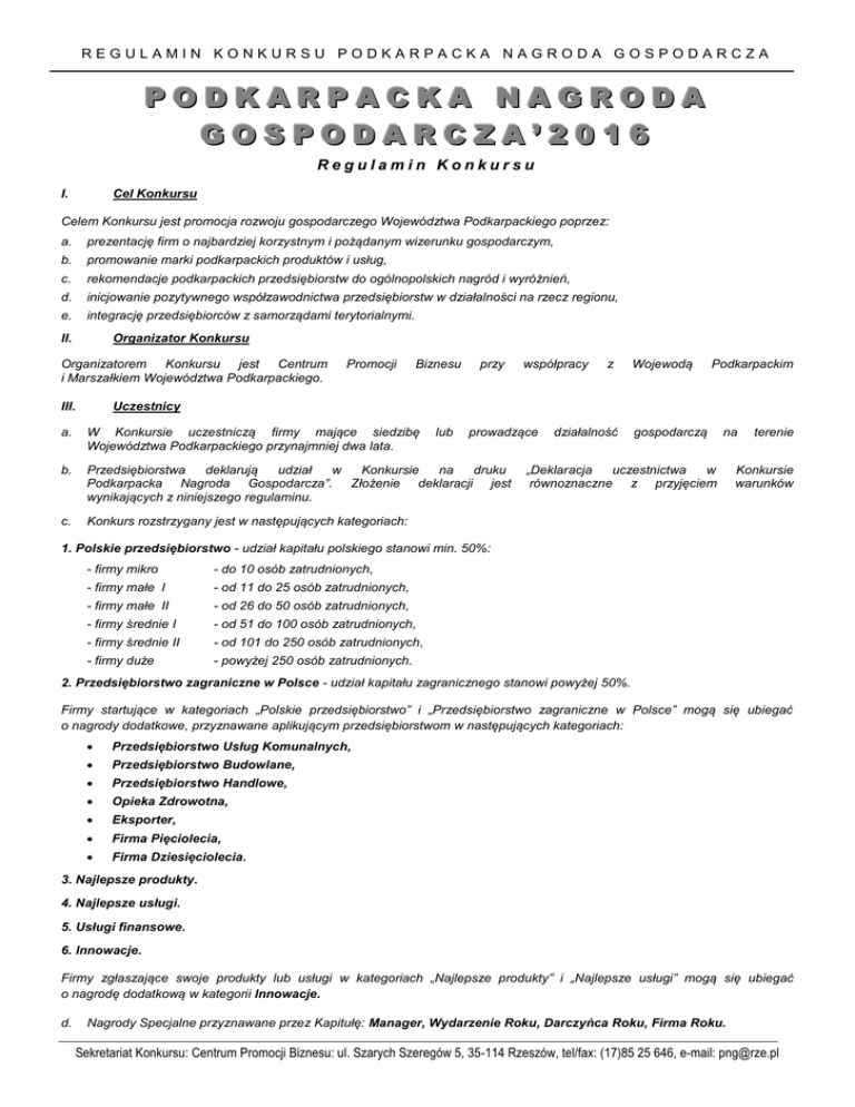 REGULAMIN KONKURSU PODKARPACKA NAGRODA GOSPODARCZA PODKARPACKA NAGRODA GOSPODARCZA’2016 Regulamin Konkursu I. Cel Konkursu Celem Konkursu jest promocja rozwoju gospodarczego Województwa Podkarpackiego poprzez: a. prezentację firm o najbardziej korzystnym i pożądanym wizerunku gospodarczym, b. promowanie marki podkarpackich produktów i usług, c. rekomendacje podkarpackich przedsiębiorstw do ogólnopolskich nagród i wyróżnień, d. inicjowanie pozytywnego współzawodnictwa przedsiębiorstw w działalności na rzecz regionu, e. integrację przedsiębiorców z samorządami terytorialnymi. II. Organizator Konkursu Organizatorem Konkursu jest Centrum i Marszałkiem Województwa Podkarpackiego. III. Promocji Biznesu przy współpracy z Wojewodą Podkarpackim Uczestnicy a. W Konkursie uczestniczą firmy mające siedzibę Województwa Podkarpackiego przynajmniej dwa lata. lub prowadzące b. Przedsiębiorstwa deklarują udział w Konkursie na druku Podkarpacka Nagroda Gospodarcza”. Złożenie deklaracji jest wynikających z niniejszego regulaminu. c. Konkurs rozstrzygany jest w następujących kategoriach: działalność gospodarczą na „Deklaracja uczestnictwa w równoznaczne z przyjęciem terenie Konkursie warunków 1. Polskie przedsiębiorstwo - udział kapitału polskiego stanowi min. 50%: - firmy mikro - do 10 osób zatrudnionych, - firmy małe I - od 11 do 25 osób zatrudnionych, - firmy małe II - od 26 do 50 osób zatrudnionych, - firmy średnie I - od 51 do 100 osób zatrudnionych, - firmy średnie II - od 101 do 250 osób zatrudnionych, - firmy duże - powyżej 250 osób zatrudnionych. 2. Przedsiębiorstwo zagraniczne w Polsce - udział kapitału zagranicznego stanowi powyżej 50%. Firmy startujące w kategoriach „Polskie przedsiębiorstwo” i „Przedsiębiorstwo zagraniczne w Polsce” mogą się ubiegać o nagrody dodatkowe, przyznawane aplikującym przedsiębiorstwom w następujących kategoriach: Przedsiębiorstwo Usług Komunalnych, Przedsiębiorstwo Budowlane, Przedsiębiorstwo Handlowe, Opieka Zdrowotna, Eksporter, Firma Pięciolecia, Firma Dziesięciolecia. 3. Najlepsze produkty. 4. Najlepsze usługi. 5. Usługi finansowe. 6. Innowacje. Firmy zgłaszające swoje produkty lub usługi w kategoriach „Najlepsze produkty” i „Najlepsze usługi” mogą się ubiegać o nagrodę dodatkową w kategorii Innowacje. d. Nagrody Specjalne przyznawane przez Kapitułę: Manager, Wydarzenie Roku, Darczyńca Roku, Firma Roku. Sekretariat Konkursu: Centrum Promocji Biznesu: ul. Szarych Szeregów 5, 35-114 Rzeszów, tel/fax: (17)85 25 646, e-mail: [email protected] REGULAMIN KONKURSU PODKARPACKA NAGRODA GOSPODARCZA Kapituła Podkarpackiej Nagrody Gospodarczej IV. 1. Kapituła Konkursu składa się z osób zaufania publicznego, specjalistów z dziedziny gospodarki zaproszonych przez organizatorów, Wojewodę Podkarpackiego i Marszałka Województwa Podkarpackiego. 2. Kapituła dokonuje oceny firm, produktów i usług biorących udział w Konkursie, kontroluje jego przebieg, wyłania grupy firm nominowanych do oceny finałowej, wskazuje firmy do wizytacji, przyznaje i wręcza nagrody konkursowe oraz opracowuje zmiany regulaminowe kolejnych edycji Konkursu. 3. Kapituła może powoływać dodatkowych ekspertów. 4. Werdykt Kapituły jest ostateczny i nie podlega zaskarżeniu. 5. Dokumenty złożone przez uczestników są objęte tajemnicą i nie będą udostępniane poza procedurami konkursowymi, a dane w nich zawarte będą znane wyłącznie Kapitule Konkursu i audytorom. V. Sekretariat Podkarpackiej Nagrody Gospodarczej Funkcję Sekretariatu Konkursu pełni Centrum Promocji Biznesu w Rzeszowie. Sekretariat administruje Konkursem, poprzez: organizowanie systemu przyjmowania zgłoszeń i obsługi Konkursu, ocenę merytoryczną zgłoszeń i kompletności przedłożonej dokumentacji, stałą obsługę techniczną i finansową firm uczestników Konkursu, prowadzenie prac organizacyjnych całości Konkursu i gali finałowej. VI. Przebieg Konkursu Konkurs jest imprezą cykliczną o edycjach organizowanych raz w roku. Terminy, związane z poszczególnymi etapami każdej edycji, a także wysokość opłat konkursowych wnoszonych przez uczestników określają i podają do wiadomości Organizatorzy i Kapituła Konkursu. Etap 1 - zgłoszenie udziału w Konkursie (do 20 czerwca 2016 r.); Etap 2 - dostarczenie ankiety konkursowej wraz z załącznikami (do 25 czerwca 2016 r.); Etap 3 - weryfikacja dokumentacji konkursowej przez Kapitułę Konkursową; ustalenie nominacji finałowych - (do 20 lipca 2016 r.); Etap 4 - weryfikacja nominacji finałowych, wizytacje nominowanych firm i wybór Laureatów przez Kapitułę Podkarpackiej Nagrody Gospodarczej; - uroczyste ogłoszenie wyników i wręczenie nagród i wyróżnień (wrzesień-listopad 2016 r.). Uwaga: Firma biorąca udział w Konkursie może sobie zastrzec prawo do zwizytowania przez Kapitułę Konkursu bez względu na wynik oceny wstępnej dokonanej na podstawie złożonych ankiet konkursowych. Informacja taka powinna być dostarczona do Sekretariatu Konkursu wraz z ankietą konkursową. VII. Opłaty Konkursowe Aby wziąć udział w Konkursie należy przesłać do Sekretariatu Konkursu formularz zgłoszeniowy. Firmy, które złożą deklarację uczestnictwa w Konkursie zobowiązane są do wniesienia opłaty rejestracyjnej, zależnie od wielkości zatrudnienia w firmie. Opłata rejestracyjna w XV edycji Konkursu zależy od wielkości zatrudnienia w firmie i wynosi odpowiednio: firmy mikro - do 10 osób zatrudnionych : 650 zł + VAT firmy małe I - od 11 do 25 osób zatrudnionych : 950 zł +VAT firmy małe II - od 26 do 50 osób zatrudnionych : 1600 zł +VAT firmy średnie I - od 51 do 100 osób zatrudnionych : 1950 zł +VAT firmy średnie II - od 101 do 250 osób zatrudnionych : 2450 zł +VAT firmy duże - powyżej 250 osób zatrudnionych : 2750 zł +VAT instytucje finansowe – od 2600 zł +VAT Firmy zgłaszające do Konkursu produkty i