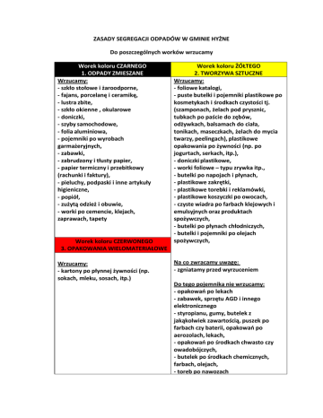 ZASADY SEGREGACJI ODPADÓW W GMINIE HYŻNE Do poszczególnych worków wrzucamy Worek koloru CZARNEGO 1. ODPADY ZMIESZANE Wrzucamy: - szkło stołowe i żaroodporne, - fajans, porcelanę i ceramikę, - lustra zbite, - szkło okienne , okularowe - doniczki, - szyby samochodowe, - folia aluminiowa, - pojemniki po wyrobach garmażeryjnych, - zabawki, - zabrudzony i tłusty papier, - papier termiczny i przebitkowy (rachunki i faktury), - pieluchy, podpaski i inne artykuły higieniczne, - popiół, - zużytą odzież i obuwie, - worki po cemencie, klejach, zaprawach, tapety Worek koloru CZERWONEGO 3. OPAKOWANIA WIELOMATERIAŁOWE Wrzucamy: - kartony po płynnej żywności (np. sokach, mleku, sosach, itp.) Worek koloru ŻÓŁTEGO 2. TWORZYWA SZTUCZNE Wrzucamy: - foliowe katalogi, - puste butelki i pojemniki plastikowe po kosmetykach i środkach czystości tj. (szamponach, żelach pod prysznic, tubkach po paście do zębów, odżywkach, balsamach do ciała, tonikach, maseczkach, żelach do mycia twarzy, peelingach), plastikowe opakowania po żywności (np. po jogurtach, serkach, itp.), - doniczki plastikowe, - worki foliowe – typu zrywka itp., - butelki po napojach i płynach, - plastikowe zakrętki, - plastikowe torebki i reklamówki, - plastikowe koszyczki po owocach, - czyste wiadra po farbach klejowych i emulsyjnych oraz produktach spożywczych, - butelki po płynach chłodniczych, - butelki i pojemniki po olejach spożywczych, Na co zwracamy uwagę: - zgniatamy przed wyrzuceniem Do tego pojemnika nie wrzucamy: - opakowań po lekach - zabawek, sprzętu AGD i innego elektronicznego - styropianu, gumy, butelek z jakąkolwiek zawartością, puszek po farbach czy baterii, opakowań po aerozolach, lekach, - opakowań po środkach chwasto czy owadobójczych, - butelek po środkach chemicznych, farbach, olejach, - toreb po nawozach Worek koloru SZAREGO 4. METAL Wrzucamy: - puszki po napojach i konserwach, - drobny złom żelazny i metale kolorowe, - kapsle z butelek, - naczynia kuchenne np. garnki, misy, - klamki, zamki, klucze, stare narzędzia, karnisze, - metalowe uchwyty meblowe, zawiasy, - rury, armaturę, Worek koloru BRĄZOWEGO 5. BIODPADY Wrzucamy: - odpady, które ulegają biodegradacji np. trawa, liście, chwasty, resztki ugotowanych warzyw i owoców, obierki, mokry papier i tektura Na co zwracamy uwagę: - zgniatamy aluminiowe puszki przed wrzuceniem Do tego pojemnika nie wrzucamy: - sprzętu elektronicznego, - felg, baterii, puszek po aerozolach, - opakowań po farbach i lakierach z resztkami produktów Worek koloru NIEBIESKIEGO 6. PAPIER, TEKTURA Wrzucamy: Gazety, czasopisma, katalogi i prospekty, - papier szkolny i biurowy, - książki i zeszyty, - torebki papierowe i papier pakowy, - kartonowe i tekturowe pudełka, - kartony po proszku do prania, - kartony i tekturę pokrytą folią aluminiową (np. opakowania typu tetra pak po mleku, napojach), - kalki, papier termiczny i faksowy Do tego pojemnika nie wrzucamy: - pieluch, podpasek i innych artykułów higienicznych, - materiałów budowlanych takich jak tapety, worki po gipsie czy cemencie itp. Worek koloru ZIELONEGO 7. SZKŁO Wrzucamy: - szklane butelki po napojach i innych produktach spożywczych, - słoiki, - szklane opakowania po kosmetykach Na co zwracamy uwagę: - wrzucamy tylko szkło, - nie tłuczemy szkła przed wrzuceniem do worka, - wszystkie odpady powinny być czyste Do tego pojemnika nie wrzucamy: - szkła stołowego, porcelany i ceramiki, - szkła okiennego, luster, szyb samochodowych, - doniczek, - szkła żaroodpornego, - wszelkich żarówek, lamp i neonówek, - szkła okularowego ODPADY WIELKOGABARYTOWE, MEBLE, ZUŻYTY SPRZĘT ELEKTRYCZNY I ELEKTRONICZNY, ZUŻYTE OPONY – takie odpady będzie można oddać bez dodatkowej opłaty w ramach tzw. „wystawki” która będzie organizowana raz w roku.