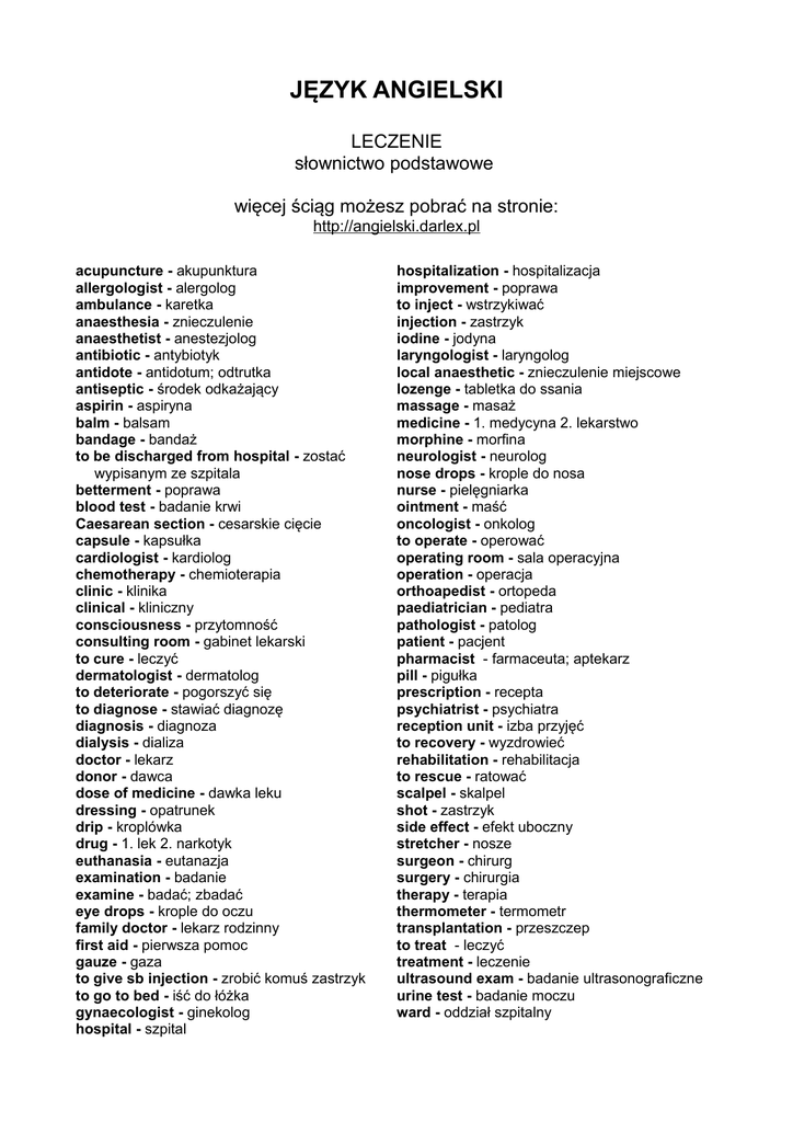 JĘZYK ANGIELSKI LECZENIE słownictwo podstawowe więcej ściąg możesz pobrać na stronie: http://angielski.darlex.pl acupuncture - akupunktura allergologist - alergolog ambulance - karetka anaesthesia - znieczulenie anaesthetist - anestezjolog antibiotic - antybiotyk antidote - antidotum; odtrutka antiseptic - środek odkażający aspirin - aspiryna balm - balsam bandage - bandaż to be discharged from hospital - zostać wypisanym ze szpitala betterment - poprawa blood test - badanie krwi Caesarean section - cesarskie cięcie capsule - kapsułka cardiologist - kardiolog chemotherapy - chemioterapia clinic - klinika clinical - kliniczny consciousness - przytomność consulting room - gabinet lekarski to cure - leczyć dermatologist - dermatolog to deteriorate - pogorszyć się to diagnose - stawiać diagnozę diagnosis - diagnoza dialysis - dializa doctor - lekarz donor - dawca dose of medicine - dawka leku dressing - opatrunek drip - kroplówka drug - 1. lek 2. narkotyk euthanasia - eutanazja examination - badanie examine - badać; zbadać eye drops - krople do oczu family doctor - lekarz rodzinny first aid - pierwsza pomoc gauze - gaza to give sb injection - zrobić komuś zastrzyk to go to bed - iść do łóżka gynaecologist - ginekolog hospital - szpital hospitalization - hospitalizacja improvement - poprawa to inject - wstrzykiwać injection - zastrzyk iodine - jodyna laryngologist - laryngolog local anaesthetic - znieczulenie miejscowe lozenge - tabletka do ssania massage - masaż medicine - 1. medycyna 2. lekarstwo morphine - morfina neurologist - neurolog nose drops - krople do nosa nurse - pielęgniarka ointment - maść oncologist - onkolog to operate - operować operating room - sala operacyjna operation - operacja orthoapedist - ortopeda paediatrician - pediatra pathologist - patolog patient - pacjent pharmacist - farmaceuta; aptekarz pill - pigułka prescription - recepta psychiatrist - psychiatra reception unit - izba przyjęć to recovery - wyzdrowieć rehabilitation - rehabilitacja to rescue - ratować scalpel - skalpel shot - zastrzyk side effect - efekt uboczny stretcher - nosze surgeon - chirurg surgery - chirurgia therapy - terapia thermometer - termometr transplantation - przeszczep to treat - leczyć treatment - leczenie ultrasound exam - badanie ultrasonograficzne urine test - badanie moczu ward - oddział szpitalny