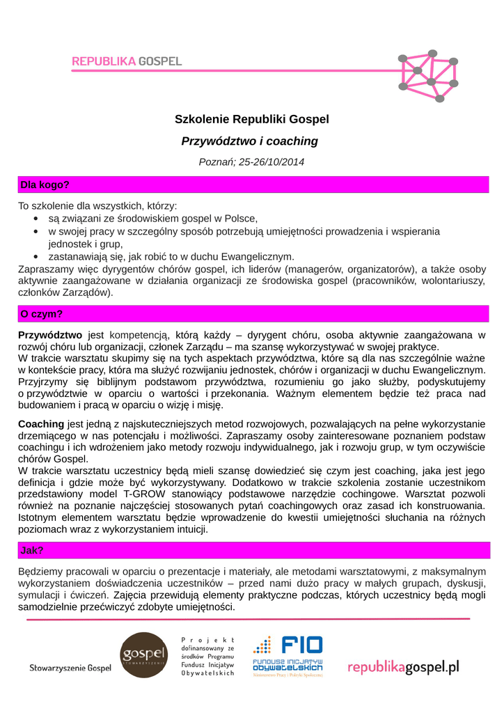 Szkolenie Republiki Gospel Przywództwo i coaching Poznań; 25-26/10/2014 Dla kogo? To szkolenie dla wszystkich, którzy: są związani ze środowiskiem gospel w Polsce, w swojej pracy w szczególny sposób potrzebują umiejętności prowadzenia i wspierania jednostek i grup, zastanawiają się, jak robić to w duchu Ewangelicznym. Zapraszamy więc dyrygentów chórów gospel, ich liderów (managerów, organizatorów), a także osoby aktywnie zaangażowane w działania organizacji ze środowiska gospel (pracowników, wolontariuszy, członków Zarządów). O czym? Przywództwo jest kompetencją, którą każdy – dyrygent chóru, osoba aktywnie zaangażowana w rozwój chóru lub organizacji, członek Zarządu – ma szansę wykorzystywać w swojej praktyce. W trakcie warsztatu skupimy się na tych aspektach przywództwa, które są dla nas szczególnie ważne w kontekście pracy, która ma służyć rozwijaniu jednostek, chórów i organizacji w duchu Ewangelicznym. Przyjrzymy się biblijnym podstawom przywództwa, rozumieniu go jako służby, podyskutujemy o przywództwie w oparciu o wartości i przekonania. Ważnym elementem będzie też praca nad budowaniem i pracą w oparciu o wizję i misję. Coaching jest jedną z najskuteczniejszych metod rozwojowych, pozwalających na pełne wykorzystanie drzemiącego w nas potencjału i możliwości. Zapraszamy osoby zainteresowane poznaniem podstaw coachingu i ich wdrożeniem jako metody rozwoju indywidualnego, jak i rozwoju grup, w tym oczywiście chórów Gospel. W trakcie warsztatu uczestnicy będą mieli szansę dowiedzieć się czym jest coaching, jaka jest jego definicja i gdzie może być wykorzystywany. Dodatkowo w trakcie szkolenia zostanie uczestnikom przedstawiony model T-GROW stanowiący podstawowe narzędzie cochingowe. Warsztat pozwoli również na poznanie najczęściej stosowanych pytań coachingowych oraz zasad ich konstruowania. Istotnym elementem warsztatu będzie wprowadzenie do kwestii umiejętności słuchania na różnych poziomach wraz z wykorzystaniem intuicji. Jak? Będziemy pracowali w oparciu o prezentacje i materiały, ale metodami warsztatowymi, z maksymalnym wykorzystaniem doświadczenia uczestników – przed nami dużo pracy w małych grupach, dyskusji, symulacji i ćwiczeń. Zajęcia przewidują elementy praktyczne podczas, których uczestnicy będą mogli samodzielnie przećwiczyć zdobyte umiejętności. Z kim? Tony Adams - Ma wieloletnie doświadczenie w biznesie, marketingu i szkoleniu liderów, w szczególności chrześcijańskich. Przez wiele lat, jeszcze mieszkając w Stanach Zjednoczonych, odpowiedzialny był za duszpasterstwo młodzieży. Zajmował się organizacją wielu wydarzeń, koncertów i innych przedsięwzięć, również od strony zarządzania, zarówno na poziomie lokalnym, stanowym, jak i ogólnokrajowym. Swoje doświadczenie w trzecim sektorze wykorzystuje współpracując z organizacjami pozarządowymi i innymi organizacjami w Polsce. Tony Adams jest założycielem i przewodniczącym Fundacji Źródło Życia, organizacji pozarządowej działającej w Krakowie od 2011 r., oraz niedawno otwartego w Krakowie The Worship Center. Karol Lisowski - Absolwent Uniwersytetu Ekonomicznego im. K. Adamieckiego w Katowicach, na Wydziale Ekonomii, miedzynarodowy akredytowany coach ICF, w trakcie certyfikacji w ramach projektu Noble Manhattan Coaching, trener umiejętności miękkich. Jako członek zarządu jednej z grup kapitałowych na terenie Śląska, posiada bogate doświadczenie biznesowe w wielu obszarach funkcjonowania przedsiębiorstwa. Założyciel i jednocześnie Prezes Zarządu Śląskiego Stowarzyszenia Gospel (rejestrowany w 2011 r.), w ramach którego realizuje szereg projektów kulturalnych związanych z tematyką gospel. Twórca pierwszej w Polsce Akademii Muzyki Gospel. Program szkolenia: Sobota, 25.10.2014 Godz. 10:00 Warsztat Modlitwa, wprowadzenie do szkolenia i zapoznanie się uczestników (sesja wspólna z wolontariuszami) [Tony Adams, Ela Jakubek] 11:00 11:30 przerwa Definicje: przywództwo, coaching, mentoring. [Tony Adams, Karol Lisowski] Fundamenty biblijne w przywództwie. [Tony Adams] 13:00 14:00 obiad Przywództwo jako służba: wykład i dyskusja [Tony Adams] 15:30 przerwa 16:00 Wprowadzenie do coachingu: [Karol Lisowski] - model T-GROW - pytania coachingowe - ćwiczenia coachingowe 17:30 Podsumowanie dnia 18:00 20:00 kolacja Wydarzenie muzyczne / uwielbienie Niedziela, 26.10.2014 Godz. Warsztat 9:00 Modlitwa (wspólnie z wolontariuszami) 10:00 Wizja i misja [Tony Adams] 11:00 11:30 przerwa Jak wyznaczać wizję i misję [Tony Adams]] Umiejętność dobrego słuchania: 3 poziomy słuchania, różnice i kluczowe zagadnienia. Wykorzystanie intuicji w komunikacji [Tony Adams, Karol Lisowski] 13:00 14:00 obiad Wartości i przekonania [Tony Adams, Karol Lisowski] Ćwiczenia 15:30 przerwa 16:00 Studium przypadku [Tony Adams, Karol Lisowski] 17:00 Ewaluacja szkolenia [Ela Jakubek] 18:00 Kolacja Organizacja i koszty Dzięki dofinansowaniu projektu Republika Gospel ze środków Funduszu Inicjatyw Obywatelskich szkolenie jest nieodpłatne. Uczestnicy nie ponoszą też kosztów zakwaterowania i wyżywienia w czasie szkolenia – zapewniamy: nocleg z soboty na niedzielę, obiad i kolację w sobotę, śniadanie, obiad i kolację w niedzielę, a także przerwy kawowe. Jedyną inwestycją po stronie uczestników jest koszt dojazdu na miejsce szkolenia – w tym przypadku do Poznania. Prosimy o taki wybór środków podróży, aby możliwe było uczestnictwo w całości szkolenia. W przypadku trudności ze znalezieniem połączenia, prosimy o jak najszybszy kontakt – postaramy się pomóc! Dokładne miejsce spotkania zostanie podane osobom, których uczestnictwo potwierdzimy po zakończeniu rekrutacji. Kontakt Skontaktuj się z nami: mailem: [email protected] telefonicznie: +48 690 006 807 Formularz zgłoszeniowy Wypełniony formularz prosimy przesłać do dnia 17/10/2014 na adres [email