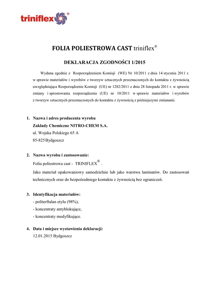 FOLIA POLIESTROWA CAST triniflex® DEKLARACJA ZGODNOŚCI 1/2015 Wydana zgodnie z Rozporządzeniem Komisji (WE) Nr 10/2011 z dnia 14 stycznia 2011 r. w sprawie materiałów i wyrobów z tworzyw sztucznych przeznaczonych do kontaktu z żywnością uwzględniająca Rozporządzenie Komisji (UE) nr 1282/2011 z dnia 28 listopada 2011 r. w sprawie zmiany i sprostowania rozporządzenia (UE) nr 10/2011 w sprawie materiałów i wyrobów z tworzyw sztucznych przeznaczonych do kontaktu z żywnością z późniejszymi zmianami. 1. Nazwa i adres producenta wyrobu Zakłady Chemiczne NITRO-CHEM S.A. ul. Wojska Polskiego 65 A 85-825 Bydgoszcz 2. Nazwa wyrobu i zastosowanie: ® Folia poliestrowa cast - TRINIFLEX . Jako materiał opakowaniowy samodzielnie lub jako warstwa laminatów. Do zastosowań technicznych oraz do bezpośredniego kontaktu z żywnością bez ograniczeń. 3. Identyfikacja materiałów: - politerftalan etylu (98%), - koncentraty antyblokujące, - koncentraty modyfikujące. 4. Data i miejsce wystawienia deklaracji: 12.01.2015 Bydgoszcz 5. Zgodność z wymaganiami: Nieorientowane folie poliestrowe typu CAST, o nazwie handlowej TRINIFLEX ® spełniają wymagania następujących aktów prawnych: - Rozporządzenie Komisji (WE) nr 10/2011 z dnia 14 stycznia 2011 r. w sprawie materiałów i wyrobów z tworzyw sztucznych przeznaczonych do kontaktu z żywnością uwzględniająca Rozporządzenie Komisji (UE) nr 1282/2011 z dnia 28 listopada 2011 r. w sprawie zmiany i sprostowania rozporządzenia (UE) nr 10/2011 w sprawie materiałów i wyrobów z tworzyw sztucznych przeznaczonych do kontaktu z żywnością. - Rozporządzenie (WE) nr 1935/2004 Parlamentu Europejskiego i Rady z dnia 27 października 2004 r. w sprawie materiałów i wyrobów z tworzyw sztucznych przeznaczonych do kontaktu z żywnością oraz uchylającym dyrektywy 80/590/EWG i 89/109/EWG. - Dyrektywa 94/62/WE Parlamentu Europejskiego i Rady z dnia 20 grudnia 1994 r. w sprawie opakowań i odpadów opakowaniowych, z późniejszymi zmianami, w zakresie zawartości ołowiu, kadmu, rtęci i chromu (VI). Suma stężeń ołowiu, kadmu, rtęci i chromu (VI) w opakowaniach nie powinna przekraczać 100 ppm (mg/kg) wagowo. - Rozporządzenie (WE) nr 2023/2006 Komisji z dnia 22 grudnia 2006 r. w sprawie dobrej praktyki produkcyjnej w odniesieniu do materiałów przeznaczonych do kontaktu z żywnością. - Rozporządzenie (WE) Nr 852/2004 Parlamentu Europejskiego i Rady z dnia 29.04.2004 w sprawie higieny środków spożywczych. - Dyrektywa Komisji 2008/60/WE z dnia 17 czerwca 2008 r. ustanawiająca szczególne kryteria czystości dotyczące substancji słodzących stosowanych w środkach spożywczych. - Dyrektywa Komisji 95/45/WE z dnia 26 lipca 1995 r. ustanawiająca szczególne kryteria czystości dotyczące barwników stosowanych w środkach spożywczych. - Dyrektywa Komisji 2008/84/WE z dnia 27 sierpnia 2008 r. ustanawiająca szczególne kryteria czystości dla dodatków do środków spożywczych innych niż barwniki i substancje słodzące. - Rozporządzenie Komisji nr 1895/2005 z dnia 18 listopada 2005 r. w sprawie ograniczenia wykorzystania niektórych pochodnych epoksydowych w materiałach i wyrobach przeznaczonych do kontaktu z żywnością. - Rozporządzenie Komisji (WE) nr 282/2008 z dnia 27 marca 2008 r. w sprawie materiałów i wyrobów z tworzyw sztucznych pochodzących z recyklingu przeznaczonych do kontaktu z żywnością oraz zmieniające rozporządzenie (WE) nr 2020/2008. - Rozporządzenie Komisji nr 450/2009 z dnia 29 maja 2009 r. w sprawie aktywnych i inteligentnych materiałów i wyrobów przeznaczonych do kontaktu z żywnością. - Rozporządzenie wykonawcze Komisji (UE) nr 321/2011 z dnia 1 kwietnia 2011 r. zmieniające rozporządzenie (UE) nr 10/2011 w odniesieniu do ograniczenia stosowania bisfenolu A w butelkach z tworzyw sztucznych do karmienia niemowląt. - Rozporządzenie Komisji (UE) nr 1282/2011 z dnia 28 listopada 2011 r. w sprawie zmiany i sprostowania rozporządzenia (UE) nr 10/2011 w sprawie materiałów i wyrobów z tworzyw sztucznych przeznaczonych do kontaktu z żywnością. - Rozporządzenie Komisji (UE) nr 1183/2012 z dnia 30 listopada 2012 r. w sprawie zmiany i sprostowania rozporządzenia (UE) nr 10/2011 w sprawie materiałów i wyrobów z tworzyw sztucznych przeznaczonych do kontaktu z żywnością. - Rozporządzenie Ministra Zdrowia z dnia 15 stycznia 2008 r. w sprawie wykazu substancji, których stosowanie jest dozwolone w procesie wytwarzania lub przetwarzania materiałów i wyrobów z innych tworzyw niż tworzywa sztuczne przeznaczonych do kontaktu z żywnością (Dz. U. Nr. 17, poz. 113) - Dyrektywa Komisji 2002/72/EC z dnia 6 sierpnia 2002 r. dotycząca materiałów i wyrobów z tworzyw sztucznych przeznaczonych do kontaktu ze środkami spożywczymi. - Rozporządzenie Komisji (UE) nr 202/2014 z dnia 3 marca 2014 r. zmieniające rozporządzenie (UE) nr 10/2011 w sprawie materiałów i wyrobów z tworzyw sztucznych przeznaczonych do kontaktu z żywnością - Rozporządzenie Ministra Zdrowia z dnia 15 października 2013 r. w sprawie wykazu substancji, których stosowanie jest dozwolone w procesie wytwarzania lub przetwarzania materiałów i wyrobów z tworzyw sztucznych, a także sposobu sprawdzania zgodności tych materiałów i wyrobów z ustalonymi limitami (Dz. U. poz. 1343) 6. W oparciu o deklaracje producentów surowców, informujemy, iż do produkcji folii wykorzystywane są substancje o działaniu antyblokingowym, antystatycznym i antyfogowym, dla których w przepisach określono dozwolony limit migracji specyficznej (SML): Nr substancji Nr ref. Nr CAS Ograniczenia Dual Use 176 11710 0000096-33-3 6 mg/kg no 234 19960 0000108-31-6 30 mg/kg no 323 11470 0000140-88-5 6 mg/kg no 785 24910 0000100-21-0 7,5 mg/kg no 263 15760 0000111-46-4 30 mg/kg no i 227 i 16990 0000107-21-1 291 19150 0000121-91-5 5 mg/kg no 398 35760 0001309-64-4 0,04 mg/kg no FCM E338 yes 7. Wyniki badania migracji globalnej, o