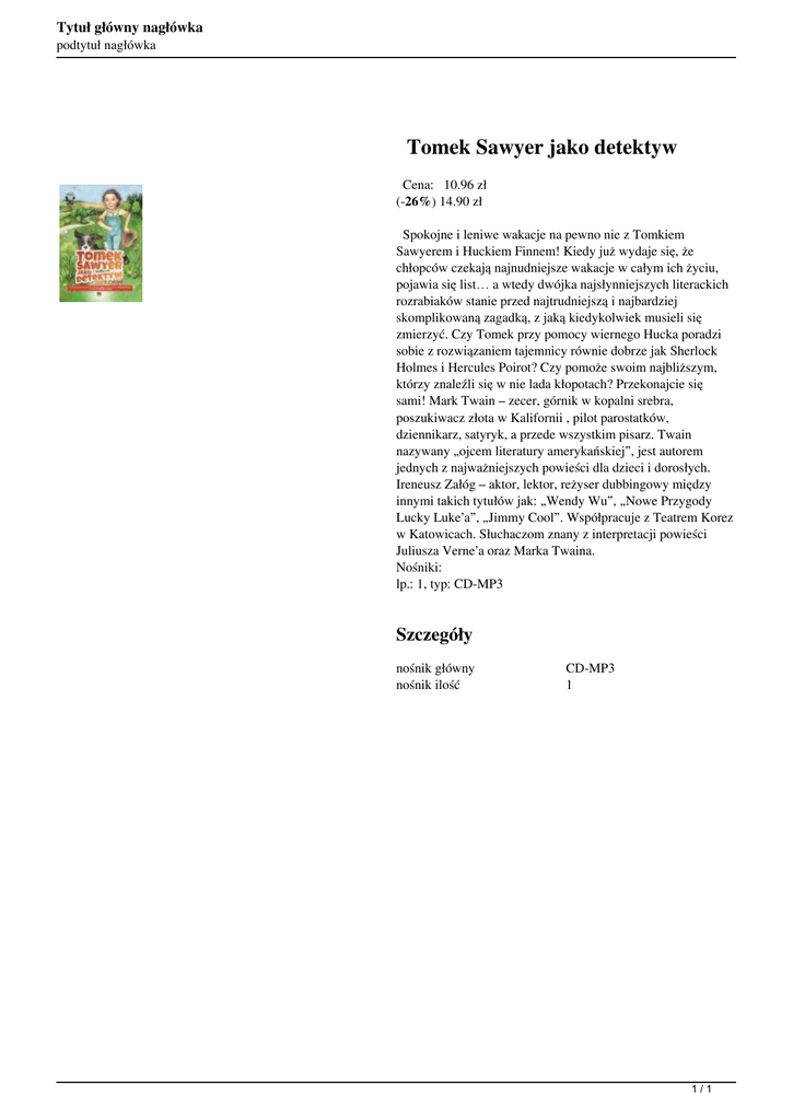 Tytuł główny nagłówka podtytuł nagłówka Tomek Sawyer jako detektyw Cena: 10.96 zł (-26%) 14.90 zł Spokojne i leniwe wakacje na pewno nie z Tomkiem Sawyerem i Huckiem Finnem! Kiedy już wydaje się, że chłopców czekają najnudniejsze wakacje w całym ich życiu, pojawia się list… a wtedy dwójka najsłynniejszych literackich rozrabiaków stanie przed najtrudniejszą i najbardziej skomplikowaną zagadką, z jaką kiedykolwiek musieli się zmierzyć. Czy Tomek przy pomocy wiernego Hucka poradzi sobie z rozwiązaniem tajemnicy równie dobrze jak Sherlock Holmes i Hercules Poirot? Czy pomoże swoim najbliższym, którzy znaleźli się w nie lada kłopotach? Przekonajcie się sami! Mark Twain – zecer, górnik w kopalni srebra, poszukiwacz złota w Kalifornii , pilot parostatków, dziennikarz, satyryk, a przede wszystkim pisarz. Twain nazywany „ojcem literatury amerykańskiej”, jest autorem jednych z najważniejszych powieści dla dzieci i dorosłych. Ireneusz Załóg – aktor, lektor, reżyser dubbingowy między innymi takich tytułów jak: „Wendy Wu”, „Nowe Przygody Lucky Luke’a”, „Jimmy Cool”. Współpracuje z Teatrem Korez w Katowicach. Słuchaczom znany z interpretacji powieści Juliusza Verne’a oraz Marka Twaina. Nośniki: lp.: 1, typ: CD-MP3 Szczegóły nośnik główny nośnik ilość CD-MP3 1 1/1 Powered by TCPDF (www.tcpdf.org)