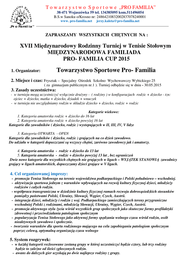 T o w a r z y s t w o S p o r t o w e „PRO FAMILIA” 38-471 Wojaszówka 59 tel. 134385095 kom.511496054 B.S.w Sanoku o/Krosno nr: 24864210832002837078240001 www. pro-familia.net [email protected] „Pr o Famil ia” ZAPRASZAMY WSZYSTKICH CHĘTNYCH NA : XVII Międzynarodowy Rodzinny Turniej w Tenisie Stołowym MIĘDZYNARODOWA FAMILIADA PRO- FAMILIA CUP 2015 Towarzystwo Sportowe Pro- Familia 1. Organizator: 2. Miejsce i czas: Frysztak – Specjalny Ośrodek Szkolno Wychowawczy Wybickiego 25 ( za gimnazjum publicznym nr.1 ). Turniej odbędzie się w dniu - 30.05.2015 3. Zasady uczestnictwa: - w turnieju mogą uczestniczyć wyłącznie drużyny - ( rodziny ) w konfiguracjach rodzic + dziecko - tzn: ojciec + dziecko, matka + dziecko, dziadek + wnuczek - w turnieju nie uwzględniamy rodzin w składzie dziecko + dziecko, rodzic + rodzic Kategorie wiekowe: 1. Kategoria amatorska rodzic + dziecko do 16 lat 2. Kategoria amatorska rodzic + dziecko powyżej 16 lat Kategorie dla zawodników ( dziecko, rodzic ) wystepujących w II, III, IV, V lidze 3. Kategoria OTWARTA - OPEN Kategorie dla zawodników ( dziecko, rodzic ) grających na co dzień zawodowo. Do udziału w kategorii dopuszczani są wszyscy chętni, zarówno zawodowcy jak i amatorzy. 4. Kategoria amatorska - rodzic + dziecko do 13 lat 5. Kategoria amatorska - rodzic + dziecko powyżej 13 lat , bez ograniczeń Dwie nowe kategorie dla wszystkich chętnych nie grających w ligach – WYJĄTEK STANOWIĄ zawodnicy grający w ligach amatorskich, dopuszczamy dzieci grające w V ligach. 4. Cel organizowanej imprezy: - promocja Tenisa Stołowego na terenie województwa podkarpackiego i Polski południowo – wschodniej. - aktywizacja sportowa jednym z warunków wpływających na rozwój kultury fizycznej dzieci, młodzieży rodziców i całych rodzin. - współpraca transgraniczna w dziedzinie kultury fizycznej ramach rozwoju dobrosąsiedzkich stosunków pomiędzy państwami Polski, Ukrainy, Słowacji, Węgier, Czech, Austrii. - integracja dzieci, młodzieży i rodzin z woj. Podkarpackiego zamieszkujących tereny przygraniczne wschodniej Polski z rodzinami, młodzieżą Słowacji, Ukrainy, Węgier, Czech, Austrii. - promocja aktywnego stylu życia wśród wszystkich grup społecznych jako skuteczne formy profilaktyki zdrowotnej i przeciwdziałania patologiom społecznym - popularyzacja Tenisa Stołowego jako aktywnej formy spędzania wolnego czasu wśród rodzin, osób nieaktywnych zawodowo i społecznie. - tworzenie warunków dla sportu rodzinnego mającego na celu zapobieganiu patologiom społecznym poprzez celową, optymalną organizacją czasu wolnego 5. System rozgrywek: - w każdej kategorii rozlosowane zostaną grupy w której uczestniczyć będzie cztery, lub trzy rodziny będzie to zależne od ilości zgłoszonych rodzin. - awans do dalszych gier uzyskają po dwie najlepsze rodziny z grupy. - po rozgrywkach grupowych turniej zostanie przeprowadzony systemem pucharowym. wszystkie mecze będą rozgrywane do dwóch wygranych setów. drużyny zajmujące trzecie, czwarte miejsca w grupach kończą udział w zawodach. mecze główne - finałowe w każdej kategorii do trzech wygranych setów. organizator zastrzega sobie zmianę systemu rozgrywek ( w przypadku póżnego rozgrywania meczy finałowych możliwość zmiany, do dwóch wygranych setów. - w zawodach obowiązują przepisy PZTS i POZTS – szczególna uwaga dotyczy sprzętu sportowego deski, okładziny, strój sportowy. - w spornych kwestiach ostateczną decyzję podejmuje Sędzia Główny zawodów. - Sędzia Główny i Organizatorzy są uprawnieni do sprawdzania tożsamości uczestników zawodów 6. Harmonogram: - zapisy drużyn - rodzin do turnieju prosimy zgłaszać najpóźniej do 15. 05. 2015 celem przygotowania rozstawienia, losowania, zamówienia obiadów - nie przewidujemy możliwości zapisów w dniu zawodów, wyjątek stanowić będą drużyny zagraniczne. - rodziny zagraniczne przyjazd w dniu 30.05.2015 do godz. 20.00 – zakwaterowanie możliwość kwaterunku dla rodzin z Polski – woj. śląskie, małopolskie - koszty noclegów pokrywa organizator turnieju. Program zawodów: - godz. 8.00 – 9.00 – sprawdzanie zgłoszeń, wydanie napojów, kart żywieniowych – obiad opłaty wpisowego, losowanie w grupach. - godz. 9.00 – 9.30 – otwarcie turnieju, wystąpienia gości - godz. 9.30 – 13.00 – gry eliminacyjne w grupach i pierwsze mecze pucharowe. - godz. 13.00 – 14.00 – obiad dla wszystkich uczestników - godz. 14.00 – 16.00 – mecze ćwierćfinałowe, półfinałowe i finały - godz. 16.00 – 17.00 – zakończenie turnieju i wręczenie nagród 7. NAGRODY w poszczególnych kategoriach od 1 do 4 miejsca: Kategoria otwarta- OPEN 1.miejsce 2. miejsce 3. miejsce 4. miejsce - okładziny tenisowe – komp.2 szt. – Batterfly Tenergy 25Fx, grawerowany puchar, dyplom - okładziny tenisowe – komp.2 szt.- Andro Resant Turbo, grawerowany puchar szklany, dyplom - deska tenisowa – Batterfly, grawerowany puchar szklany, dyplom - grawerowany puchar szklany, dyplom 1. miejsce 2. miejsce 3. miejsce 4. miejsce - okładziny tenisowe - komp. 2 szt. – Andro Resant Turbo, grawerowany puchar szklany, dyplom - deska tenisowa – Appelgren All Play, grawerowany puchar szklany, dyplom - deska tenisowa, grawerowany puchar szklany, dyplom - grawerowany puchar szklany, dyplom Kategoria I amatorska rodzic + dziecko do 16 lat, Kategoria II amatorska rodzic + dziecko powyżej 16 lat: 1. miejsce 2. miejsce 3. miejsce 4. miejsce - okładziny tenisowe - komp.2 szt. - Andro Resant Turbo, grawerowany puchar szklany, dyplom - okładziny tenisowe – 1 szt. – Donic Outro Formula, grawerowany puchar szklany, dyplom - deska tenisowa – Appelgre All Play, grawerowany puchar szklany, dyplom - grawerowany puchar szklany, dyplom Możliwość ufundowana nagrody specjalnej dla najlepszej drużyny z woj. podkarpackiego – kategoria amatorska powyżej 16 lat przez Europosła 4- dniowy pobyt w B