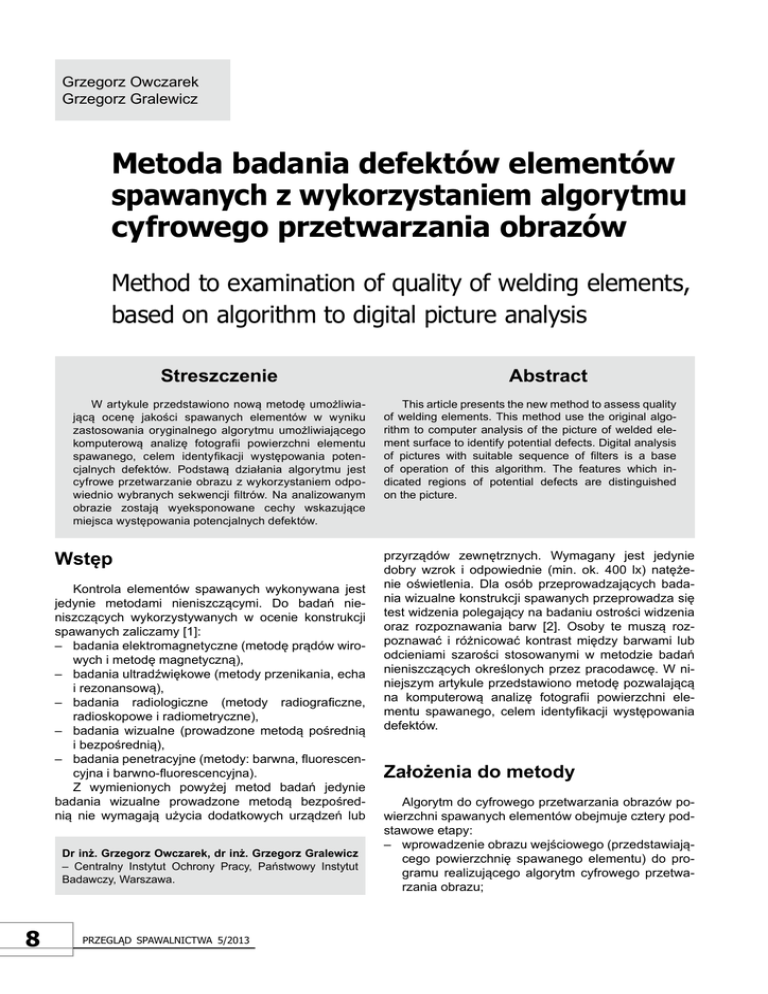 Grzegorz Owczarek Grzegorz Gralewicz Metoda badania defektów elementów spawanych z wykorzystaniem algorytmu cyfrowego przetwarzania obrazów Method to examination of quality of welding elements, based on algorithm to digital picture analysis Streszczenie W artykule przedstawiono nową metodę umożliwiającą ocenę jakości spawanych elementów w wyniku zastosowania oryginalnego algorytmu umożliwiającego komputerową analizę fotografii powierzchni elementu spawanego, celem identyfikacji występowania potencjalnych defektów. Podstawą działania algorytmu jest cyfrowe przetwarzanie obrazu z wykorzystaniem odpowiednio wybranych sekwencji filtrów. na analizowanym obrazie zostają wyeksponowane cechy wskazujące miejsca występowania potencjalnych defektów. Wstęp Kontrola elementów spawanych wykonywana jest jedynie metodami nieniszczącymi. Do badań nieniszczących wykorzystywanych w ocenie konstrukcji spawanych zaliczamy [1]: – badania elektromagnetyczne (metodę prądów wirowych i metodę magnetyczną), – badania ultradźwiękowe (metody przenikania, echa i rezonansową), – badania radiologiczne (metody radiograficzne, radioskopowe i radiometryczne), – badania wizualne (prowadzone metodą pośrednią i bezpośrednią), – badania penetracyjne (metody: barwna, fluorescencyjna i barwno-fluorescencyjna). Z wymienionych powyżej metod badań jedynie badania wizualne prowadzone metodą bezpośrednią nie wymagają użycia dodatkowych urządzeń lub Dr inż. Grzegorz Owczarek, dr inż. Grzegorz Gralewicz – Centralny Instytut Ochrony Pracy, Państwowy Instytut Badawczy, Warszawa. 8 Przegląd sPawalnictwa 5/2013 abstract This article presents the new method to assess quality of welding elements. This method use the original algorithm to computer analysis of the picture of welded element surface to identify potential defects. Digital analysis of pictures with suitable sequence of filters is a base of operation of this algorithm. The features which indicated regions of potential defects are distinguished on the picture. przyrządów zewnętrznych. Wymagany jest jedynie dobry wzrok i odpowiednie (min. ok. 400 lx) natężenie oświetlenia. Dla osób przeprowadzających badania wizualne konstrukcji spawanych przeprowadza się test widzenia polegający na badaniu ostrości widzenia oraz rozpoznawania barw [2]. Osoby te muszą rozpoznawać i różnicować kontrast między barwami lub odcieniami szarości stosowanymi w metodzie badań nieniszczących określonych przez pracodawcę. W niniejszym artykule przedstawiono metodę pozwalającą na komputerową analizę fotografii powierzchni elementu spawanego, celem identyfikacji występowania defektów. Założenia do metody Algorytm do cyfrowego przetwarzania obrazów powierzchni spawanych elementów obejmuje cztery podstawowe etapy: – wprowadzenie obrazu wejściowego (przedstawiającego powierzchnię spawanego elementu) do programu realizującego algorytm cyfrowego przetwarzania obrazu; Rys. 1. Schemat przeprowadzenia analizy defektoskopowej: 1 – próbka elementu spawanego, UV – źródło promieniowania UV do oświetlenia badanej próbki, 2 – kamera, 3 – obserwacja wzrokowa, 4 – zdjęcie elementu spawanego, PC – komputer, 5 – program do wykrywania defektów elementów spawanych Fig. 1. Diagram of defectoscopy analysis 1 – sample of welding element, UV – UV radiation source to expose tested sample 2 – camera, 3 – eyes analysis, 4 – picture of welded element, PC – computer, 5 – software to detect defects test of welded elements – cyfrowe przetwarzanie obrazu; – wskazanie na analizowanym obrazie miejsc wystąpienia potencjalnych defektów; – archiwizację danych. Oprogramowanie jest przeznaczone do analizy obrazów otrzymanych z kamery cyfrowej dla określenia miejsca, poddanych analizie defektoskopowej przeprowadzonej np. metodą penetracyjną, zgodnie ze schematem przedstawionym na rysunku 1. Ujawnienie obszaru występowania wady może być realizowane na dwa zasadnicze sposoby. Pierwsze miejsce, w którym występuje wada, można określić znacznikiem np. w postaci okręgu o średnicy odpowiadającej wielkości uszkodzonego miejsca. Drugi sposób polega na wypełnieniu pola zdefektowanego obszaru kolorem. Oba sposoby umożliwiają wskazanie uszkodzonego miejsca za pomocą znacznika graficznego. W trakcie opracowania oprogramowania analizowano Rys. 2. Schematyczne przedstawienie zadania, jakie spełnia algorytm do wykrywania defektów elementów spawanych: (A) – obraz przed zastosowaniem algorytmu, (B) – obraz po zastosowaniu algorytmu Fig. 2. Diagram of the task of algorithm for detect defects of welded elements: (A) – the picture before analysis, (B) – the picture after analysis argumenty za i przeciw wprowadzeniu jednego z przedstawionych powyżej sposobów miejsca występowania defektu. Wynik tej analizy przedstawiono w tablicy I. W oprogramowaniu do określania cech obrazu w układzie defektoskopu zaimplementowano znacznik wypełniający pole. Schemat działania algorytmu do badania defektów elementów spawanych przedstawiono na rysunku 2. Oprogramowanie do badania defektów elementów spawanych Oprogramowanie do badania defektów elementów spawanych opracowano z wykorzystaniem następujących filtrów [2÷4]: – wyostrzanie, – desaturacja, – filtr gradientowy z programowaną maską, – progowanie, – sumowanie obrazu wynikowego z obrazem otrzymanym w wyniku przetwarzania. tablica I. Sposoby wprowadzenia znacznika graficznego do analizowanego obrazu table I. Method of implementation of graphic sign to analyzed picture Rodzaj znacznika Znacznik w postaci okręgu Znacznik wypełniający pole Za Przeciw Wprowadzenie dużej ilości obszarów w przypadku pojawiania się artefaktów; Pozostawienie niezmienionego obrazu Przesłonięcie innych, nieobjętych defektem, elementów miejsc zdefektowanych (brak ich wypełobrazu konturami znacznika; nienia) Konieczność wyliczenia promienia 