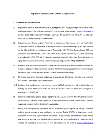 Regulamin Konkursu Radia WAWA „Szczęśliwa 13” 1. 1.1 POSTANOWIENIA OGÓLNE Regulamin określa warunki konkursu: „Szczęśliwa 13” rozgrywanego na antenie Radia WAWA w audycji „Szczęśliwa trzynastka” oraz stronie internetowej www.radiowawa.pl zgodnie z art. 921 Kodeksu Cywilnego - ustawy z dn. 23.04.1964 r. (Dz.U.Nr 16, poz. 93 z późn. zm.) – dalej zwanego „Konkursem” 1.2 Organizatorem Konkursu jest Time S.A. z siedzibą w Warszawie, przy ul. Jubilerskiej 10, zarejestrowana w Rejestrze przedsiębiorców KRS prowadzonego przez Sąd Rejonowy dla Miasta Stołecznego Warszawy w Warszawie, XIII Wydział Gospodarczy KRS, pod numerem KRS 0000295857, NIP: 526-10-04-620, kapitał zakładowy w całości wpłacony w wysokości 25.070.000,00 zł (słownie: dwadzieścia pięć milionów siedemdziesiąt tysięcy złotych), zwana w dalszej części niniejszego regulaminu "Organizatorem". 1.3 Konkurs jest organizowany przez Organizatora na terenie Rzeczpospolitej Polskiej dla osób posiadających obywatelstwo polskie. Konkurs ma zasięg ograniczony technicznymi możliwościami odbioru Radia WAWA i strony www.radiowawa.pl. 1.4 Niniejszy regulamin stanowi podstawę prowadzenia Konkursu i określa jego warunki oraz prawa i obowiązki jego uczestników. 1.5 Konkurs jest realizowany na antenie radia WAWA codziennie od poniedziałku do soboty od dnia 29.08.2016 roku do dnia 30.06.2017 roku w dziennych edycjach w godzinach 19.00-20.00. 1.6 Konkurs podzielony jest na edycje zgodnie z pkt. 3.2. W każdym dniu trwania Konkursu odbędzie się 1 (jedna) edycja podczas której wyłoniony zostanie minimalnie 1 (jeden) zwycięzca a maksymalnie 8 (ośmiu) zwycięzców. 1.7 Każdy uczestnik poprzez zgłoszenie się do Konkursu wyraża zgodę na emisję i reemisje wejścia konkursowego z jego udziałem na antenie Radia WAWA w dowolnym czasie, publiczne ujawnienie jego imienia, nazwiska i miejscowości zamieszkania oraz emisję jego głosu na antenie oraz upublicznienie wizerunku podczas Konkursu i jego promocji, a także na publiczne ujawnienie, w tym zamieszczenie na stronie www.radiowawa.pl 1 jego imienia, nazwiska i miejscowości zamieszkania podczas trwania Konkursu, jego promocji, ogłaszania wyników. 1.8 Przystąpienie do Konkursu (wysłanie zgłoszenia, o którym mowa w pkt. 3.3 jest równoznaczne z akceptacją przez uczestnika niniejszego regulaminu w całości. Uczestnik zobowiązuje się do przestrzegania określonych w niniejszym regulaminie zasad, jak również potwierdza, iż spełnia wszystkie warunki, które uprawniają go do udziału w Konkursie. Uczestnik, który nie spełni warunków określonych w regulaminie lub naruszy jakąkolwiek zasadę w nim określoną może być w każdym czasie wykluczony z udziału w Konkursie oraz traci prawo do ewentualnej wygranej. 1.9 Adres e-mail Organizatora, pod którym można uzyskać informacje na temat organizacji Konkursu: [email protected] lub [email protected]. 2. Nagrody 2.1 Zwycięzca każdej edycji Konkursu otrzyma główną nagrodę rzeczową o wartości nieprzekraczającej 100 zł (słownie: sto złotych). Nagroda główna prezentowana jest w programie Radia Wawa w audycji „Szczęśliwa 13”, w zwiastunach/ zapowiedziach promocyjnych Konkursu/ audycji „Szczęśliwa 13” emitowanych na antenie Radia WAWA oraz na stronie internetowej www.radiawawa.pl. 2.2 Organizator zastrzega, że w trakcie trwania Konkursu może zostać przez niego ufundowana nagroda pocieszenia w postaci wybranej przez niego płyty lub gadżetu o wartości nieprzekraczającej 30 zł (słownie: trzydzieści złotych)– przyznanie każdej takiej nagrody oraz ich liczba i uczestnicy, którym będzie ona przyznana zależy od decyzji Komisji Konkursowej. Na zasady rozdania ewentualnych nagród pocieszenia każdy z uczestników przystępując do Konkursu, wyraża zgodę. 2.3 Zwycięzca Konkursu zobowiązany jest do podania wszystkich danych osobowych i teleadresowych niezbędnych do odbioru/wysyłki nagrody. 2.4 Nagrody, o których mowa w ust. 2.1 i 2.2 będą przesyłane przez Organizatora kurierem lub pocztą w terminie 7 dni od dnia wygranej w Konkursie. Uczestnik, który zgłosi chęć odbioru osobistego nagrody, będzie mógł ją odebrać w siedzibie Organizatora najpóźniej do 30 dni od dnia wygranej. 2 2.5 Uczestnik, który nie odbierze nagrody w terminie określonym w pkt. 2.4 traci prawo do tej nagrody. Nieodebrane nagrody pozostają własnością Organizatora. 2.6 Organizator nie ponosi odpowiedzialności za niemożność odbioru lub nieodebranie którejkolwiek nagrody z przyczyny leżącej po stronie nagrodzonego uczestnika. 2.7 Organizator nie ponosi odpowiedzialności za zmianę miejsca zamieszkania i/lub podanego przez uczestnika Konkursu adresu lub zmianę innych danych – uniemożliwiające kontakt z tym uczestnikiem lub odebranie przez niego zestawu nagród/nagrody. 2.8 O szczegółach odbioru i realizacji nagród zwycięzca każdej edycji Konkursu zostanie poinformowany przez Organizatora drogą mailową lub za pośrednictwem rozmowy telefonicznej. 3. Zasady uczestnictwa w Konkursie 3.1 Ogólne zasady Konkursu podawane są w programie Radia WAWA i w zwiastunach promocyjnych Konkursu emitowanych na antenie Radia WAWA oraz na stronie internetowej WWW.radiowawa.pl, zakładka Konkursy. 3.2 W tygodniu trwania Konkursu odbędzie się 6 (sześć) edycji Konkursu – zostaną one rozegrane od poniedziałku do soboty w godzinach: 19.00-20.00. w programie „Szczęśliwa 13”. W każdej edycji Konkursu odbywają się antenowe wejścia konkursowe z uczestnikami Konkursu emitowane na antenie Radia WAWA. Podczas każdej edycji Konkursu wyłonionych zostaje od 1 (jednego) do maksymalnie 8 (ośmiu) zwycięzców. 3.3 W celu wzięcia udziału w Konkursie należy w czasie trwania danej edycji konkursu dokonać zgłoszenia do Konkursu za pośrednictwem formularza na stronie internetowej www.radiowawa.pl. Zgłoszenie powinno zawierać: Dane zgłoszeniowe: imię, n