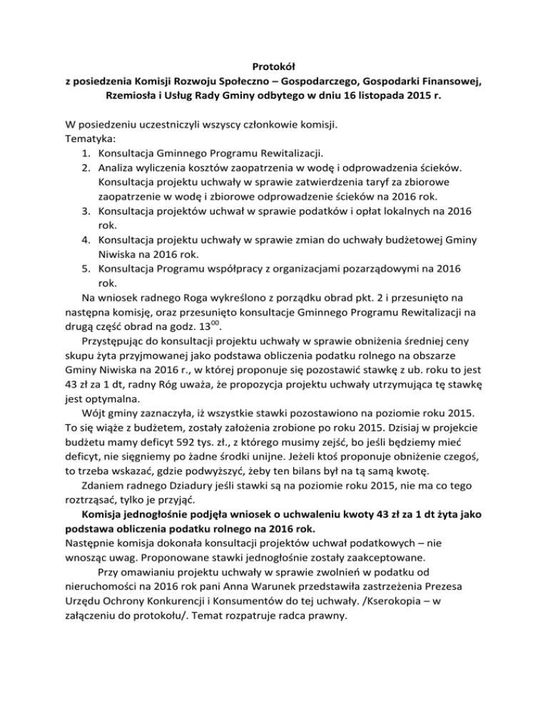 Protokół z posiedzenia Komisji Rozwoju Społeczno – Gospodarczego, Gospodarki Finansowej, Rzemiosła i Usług Rady Gminy odbytego w dniu 16 listopada 2015 r. W posiedzeniu uczestniczyli wszyscy członkowie komisji. Tematyka: 1. Konsultacja Gminnego Programu Rewitalizacji. 2. Analiza wyliczenia kosztów zaopatrzenia w wodę i odprowadzenia ścieków. Konsultacja projektu uchwały w sprawie zatwierdzenia taryf za zbiorowe zaopatrzenie w wodę i zbiorowe odprowadzenie ścieków na 2016 rok. 3. Konsultacja projektów uchwał w sprawie podatków i opłat lokalnych na 2016 rok. 4. Konsultacja projektu uchwały w sprawie zmian do uchwały budżetowej Gminy Niwiska na 2016 rok. 5. Konsultacja Programu współpracy z organizacjami pozarządowymi na 2016 rok. Na wniosek radnego Roga wykreślono z porządku obrad pkt. 2 i przesunięto na następna komisję, oraz przesunięto konsultacje Gminnego Programu Rewitalizacji na drugą część obrad na godz. 1300. Przystępując do konsultacji projektu uchwały w sprawie obniżenia średniej ceny skupu żyta przyjmowanej jako podstawa obliczenia podatku rolnego na obszarze Gminy Niwiska na 2016 r., w której proponuje się pozostawić stawkę z ub. roku to jest 43 zł za 1 dt, radny Róg uważa, że propozycja projektu uchwały utrzymująca tę stawkę jest optymalna. Wójt gminy zaznaczyła, iż wszystkie stawki pozostawiono na poziomie roku 2015. To się wiąże z budżetem, zostały założenia zrobione po roku 2015. Dzisiaj w projekcie budżetu mamy deficyt 592 tys. zł., z którego musimy zejść, bo jeśli będziemy mieć deficyt, nie sięgniemy po żadne środki unijne. Jeżeli ktoś proponuje obniżenie czegoś, to trzeba wskazać, gdzie podwyższyć, żeby ten bilans był na tą samą kwotę. Zdaniem radnego Dziadury jeśli stawki są na poziomie roku 2015, nie ma co tego roztrząsać, tylko je przyjąć. Komisja jednogłośnie podjęła wniosek o uchwaleniu kwoty 43 zł za 1 dt żyta jako podstawa obliczenia podatku rolnego na 2016 rok. Następnie komisja dokonała konsultacji projektów uchwał podatkowych – nie wnosząc uwag. Proponowane stawki jednogłośnie zostały zaakceptowane. Przy omawianiu projektu uchwały w sprawie zwolnień w podatku od nieruchomości na 2016 rok pani Anna Warunek przedstawiła zastrzeżenia Prezesa Urzędu Ochrony Konkurencji i Konsumentów do tej uchwały. /Kserokopia – w załączeniu do protokołu/. Temat rozpatruje radca prawny. Następnie pani Wróbel szczegółowo omówiła projekt uchwały w sprawie wprowadzenia zmian do budżetu gminy na 2015 rok. Skarbnik gminy Jolanta Łagowska natomiast uzasadniła konieczność zmiany Wieloletniej Prognozy Finansowej. Została sporządzona z tego względu, że zwiększa się deficyt o kwotę 379 826,71 zł. Ponieważ te środki mają wpłynąć w przyszłym roku, jest zasada taka, że jeżeli wpłyną do 90 dni po zakończeniu projektu, podlegają wyłączeniu ze spłat. Poddano pod konsultację projekt programu współpracy z organizacjami pozarządowymi. Pani wójt zaznaczyła, że nasz program jest bardzo szeroki, który daje możliwości wywiązywać się z ustawy i prowadzić działalność z podmiotami – organizacjami pozarządowymi, wolontariatem, Kościołem, fundacjami, stowarzyszeniami. Jest dużo możliwości doradczych, wsparcia, pomocy, przygotowania dokumentów. W kolejnym roku kalendarzowym wójt składa sprawozdanie z realizacji programu współpracy. Sport to jest największa gałąź, która idzie przez współpracę z organizacjami pozarządowymi. Była też świetlica w Przyłęku oraz nieduże dofinansowanie Stowarzyszenia Kół Gospodyń Wiejskich. Wójt Elżbieta Wróbel odczytała pismo wystosowane przez firmę Deloitte do Urzędu Gminy Niwiska w związku z orzeczeniem Trybunału Sprawiedliwości UE który orzekł, że jednostki budżetowe nie mogą być uznane za odrębne od gmin podmioty dla celów VAT. Dodatkowo, 26 października 2015 r. Naczelny Sąd Administracyjny podjął uchwałę w składzie 7 sędziów, zgodnie z którą zakłady budżetowe również nie mogą być uznane za odrębne od gmin podmioty dla celów VAT. Kolejne pismo wystosowane od Związku Pracodawców Kompania Opera Polska Towarzystwo Dzieł, które planuje wybudowanie i użytkowanie parku fotowoltaicznego o mocy około 1 MW. Stąd prośba o informację o możliwości wykupienia działki od 1 ha do 2 ha z możliwością zainstalowania przez 5 podmiotów reprezentowanych przez towarzystwo paneli fotowoltaicznych. W dalszej części obrad odbyła się konsultacja Gminnego Programu Rewitalizacji. Na wstępie wójt gminy poinformowała, iż prace nad tym tematem rozpoczęły się wcześnie, w m – cach maj i czerwiec odbywały się konsultacje. Zawarto umowę z firmą INTERcharrette z Tarnowa, toczyły się prace i nadal się toczą. „Były spotkania w terenie, zebrania wiejskie, spotkania z radnymi, sołtysami, organizacjami pożytku publicznego, proboszczami parafii. „Na dzień dzisiejszy jesteśmy na etapie przedłożenia projektu GPR Gminy Niwiska firmy INTERcharrette, ale jesteśmy na stopie ostrej, ponieważ firma nie wywiązała się z umowy. Mimo wielokrotnego wezwania, mimo przedkładania wachlarzu doświadczeń to niestety …. dzisiaj gdy mamy już założenia – wytyczne ministerstwa do rewitalizacji, a myśmy to jako projekt tych wytycznych widzieli wcześniej, w umowie zostały zawarte założenia tych wytycznych, firma z tego się nie wywiązała i podejrzewam, że się już nie wywiąże. Dlatego żeby uratować tą naszą wielką pracę, którą jeżeli zamkniemy w dniu jutrzejszym uchwałą rady, to nie będziemy od nowa robić z dużo większym wymogiem i kosztami, które stawia przed nami ustawą, którą ustawodawca jeszcze pod koniec kadencji uchwalił, a wchodzi w życie 18 listopada. Jeżeli na jutrzejszej sesji Rada Gminy przyjmie program rewitalizacji, który został w tej chwili dopracowany przez panią Aleksandrę Czyżewską w ramac
