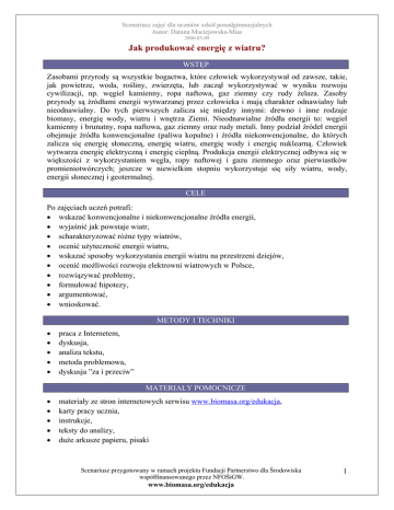 Scenariusz zajęć dla uczniów szkół ponadgimnazjalnych Autor: Danuta Maciejowska-Mias 2006-03-09 Jak produkować energię z wiatru? WSTĘP Zasobami przyrody są wszystkie bogactwa, które człowiek wykorzystywał od zawsze, takie, jak powietrze, woda, rośliny, zwierzęta, lub zaczął wykorzystywać w wyniku rozwoju cywilizacji, np. węgiel kamienny, ropa naftowa, gaz ziemny czy rudy żelaza. Zasoby przyrody są źródłami energii wytwarzanej przez człowieka i mają charakter odnawialny lub nieodnawialny. Do tych pierwszych zalicza się między innymi: drewno i inne rodzaje biomasy, energię wody, wiatru i wnętrza Ziemi. Nieodnawialne źródła energii to: węgiel kamienny i brunatny, ropa naftowa, gaz ziemny oraz rudy metali. Inny podział źródeł energii obejmuje źródła konwencjonalne (paliwa kopalne) i źródła niekonwencjonalne, do których zalicza się energię słoneczną, energię wiatru, energię wody i energię nuklearną. Człowiek wytwarza energię elektryczną i energię cieplną. Produkcja energii elektrycznej odbywa się w większości z wykorzystaniem węgla, ropy naftowej i gazu ziemnego oraz pierwiastków promieniotwórczych; jeszcze w niewielkim stopniu wykorzystuje się siły wiatru, wody, energii słonecznej i geotermalnej. CELE Po zajęciach uczeń potrafi: • wskazać konwencjonalne i niekonwencjonalne źródła energii, • wyjaśnić jak powstaje wiatr, • scharakteryzować różne typy wiatrów, • ocenić użyteczność energii wiatru, • wskazać sposoby wykorzystania energii wiatru na przestrzeni dziejów, • ocenić możliwości rozwoju elektrowni wiatrowych w Polsce, • rozwiązywać problemy, • formułować hipotezy, • argumentować, • wnioskować. METODY I TECHNIKI • • • • • praca z Internetem, dyskusja, analiza tekstu, metoda problemowa, dyskusja ”za i przeciw” MATERIAŁY POMOCNICZE • • • • • materiały ze stron internetowych serwisu www.biomasa.org/edukacja, karty pracy ucznia, instrukcje, teksty do analizy, duże arkusze papieru, pisaki Scenariusz przygotowany w ramach projektu Fundacji Partnerstwo dla Środowiska współfinansowanego przez NFOŚiGW. www.biomasa.org/edukacja 1 Scenariusz zajęć dla uczniów szkół ponadgimnazjalnych Autor: Danuta Maciejowska-Mias 2006-03-09 PRZEBIEG ZAJĘĆ 1. Proponuje się rozpocząć zajęcia od przedstawienia tematu i krótkiego wprowadzenia do zagadnienia (patrz wstęp). 2. Następnie uczniowie podzieleni na cztery grupy przygotowują się do dyskusji na temat zagadnień dotyczących energii wiatru według instrukcji przedstawionych w załącznikach nr 1, 2, 3, 4. 3. Efektem pracy grupowej powinna być moderowana przez nauczyciela dyskusja dotycząca: • zapotrzebowania na energię, • konwencjonalnych i niekonwencjonalnych źródeł energii, • powstawania i rodzajów wiatru, • wykorzystywania energii wiatru jako źródła energii dawniej i dziś. Dyskusja powinna być zakończona konkretnymi wnioskami, które nauczyciel zapisuje na dużym arkuszu papieru. 4. W dalszej kolejności uczniowie w grupach rozwiązują problem: „Czy na terenie Polski powinny powstawać ”farmy wiatrowe”? W rozwiązaniu problemu uczniowie wykorzystają karty pracy (załącznik nr 5) i odpowiednie teksty zamieszczone na stronach internetowych. 5. Po zakończeniu pracy uczniowie prezentują jej wyniki. 6. W przypadku zróżnicowania wniosków wskazane jest przeprowadzenie „dyskusji za i przeciw”. 7. Proponuje się zakończyć zajęcia krótkim wykładem na temat innych alternatywnych źródeł energii. BIBLIOGRAFIA • • • Roth G. D. – Pogoda i klimat. Prószyński i S – ka , Warszawa 1998 Soliński I. – Aspekty ekonomiczne wykorzystania energii wiatru w południowo – wschodnim rejonie Polski. Ogólnopolskie Forum „Mała Energetyka” 97, Konferencja Naukowo – Techniczna, Zakopane 1997 Soliński I. – Efekty energetyczne i ekonomiczne wykorzystania energii wiatrowej. Wydawnictwo Instytutu GSMiE PAN, Kraków 1999 Scenariusz przygotowany w ramach projektu Fundacji Partnerstwo dla Środowiska współfinansowanego przez NFOŚiGW. www.biomasa.org/edukacja 2 Scenariusz zajęć dla uczniów szkół ponadgimnazjalnych Autor: Danuta Maciejowska-Mias 2006-03-09 ZAŁĄCZNIKI Załącznik nr 1 Instrukcja Przygotujcie się do dyskusji na temat energii wiatru. W tym celu wykorzystajcie odpowiednie fragmenty tekstów zamieszczonych na stronach internetowych serwisu www.biomasa.org/edukacja dotyczące powstawania wiatru. Załącznik nr 2 Instrukcja Przygotujcie się do dyskusji na temat energii wiatru. W tym celu wykorzystajcie odpowiednie fragmenty tekstów zamieszczonych na stronach internetowych serwisu www.biomasa.org/edukacja dotyczące rodzajów wiatrów z uwzględnieniem wiatrów lokalnych. Załącznik nr 3 Instrukcja Przygotujcie się do dyskusji na temat energii wiatru. W tym celu wykorzystajcie odpowiednie fragmenty tekstów zamieszczonych na stronach internetowych serwisu www.biomasa.org/edukacja dotyczące wykorzystywania siły wiatru przez człowieka na przestrzeni dziejów. Załącznik nr 4 Instrukcja Przygotujcie się do dyskusji na temat energii wiatru. W tym celu wykorzystajcie odpowiednie fragmenty tekstów zamieszczonych na stronach internetowych serwisu www.biomasa.org/edukacja dotyczące wykorzystywania siły wiatru przez człowieka w czasach współczesnych. Załącznik nr 5 Karta pracy Problem: Czy na terenie Polski powinny powstawać ”farmy wiatrowe”? A) Na podstawie przeprowadzonej wcześniej dyskusji i posiadanej wiedzy ustalcie i zapiszcie hipotezę: Hipoteza: ………………………………………………………………………………………………… ………………………………………………………………………………………………… ………………………………………………………………………………………………… ………………………………………………