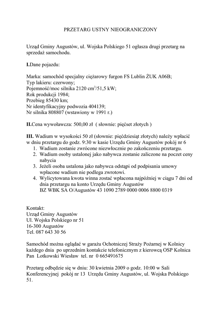 PRZETARG USTNY NIEOGRANICZONY Urząd Gminy Augustów, ul. Wojska Polskiego 51 ogłasza drugi przetarg na sprzedaż samochodu. I.Dane pojazdu: Marka: samochód specjalny ciężarowy furgon FS Lublin ŻUK A06B; Typ lakieru: czerwony; Pojemność/moc silnika 2120 cm3/51,5 kW; Rok produkcji 1984; Przebieg 85430 km; Nr identyfikacyjny podwozia 404139; Nr silnika 808807 (wstawiony w 1991 r.) II.Cena wywoławcza: 500,00 zł ( słownie: pięćset złotych ) III. Wadium w wysokości 50 zł (słownie: pięćdziesiąt złotych) należy wpłacić w dniu przetargu do godz. 9:30 w kasie Urzędu Gminy Augustów pokój nr 6 1. Wadium zostanie zwrócone niezwłocznie po zakończeniu przetargu. 2. Wadium osoby ustalonej jako nabywca zostanie zaliczone na poczet ceny nabycia 3. Jeżeli osoba ustalona jako nabywca odstąpi od podpisania umowy wpłacone wadium nie podlega zwrotowi. 4. Wylicytowana kwota winna zostać wpłacona najpóźniej w ciągu 7 dni od dnia przetargu na konto Urzędu Gminy Augustów BZ WBK SA O/Augustów 43 1090 2789 0000 0006 8800 0319 Kontakt: Urząd Gminy Augustów Ul. Wojska Polskiego nr 51 16-300 Augustów Tel. 087 643 30 56 Samochód można oglądać w garażu Ochotniczej Straży Pożarnej w Kolnicy każdego dnia po uprzednim kontakcie telefonicznym z kierowcą OSP Kolnica Pan Lotkowski Wiesław tel. nr 0 665491675 Przetarg odbędzie się w dniu: 30 kwietnia 2009 o godz. 10:00 w Sali Konferencyjnej pokój nr 13 Urzędu Gminy Augustów, ul. Wojska Polskiego 51.