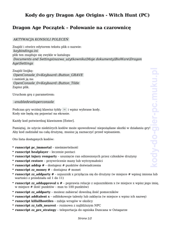 Kody do gry Dragon Age Origins - Witch Hunt (PC) Dragon Age Początek – Polowanie na czarownicę AKTYWACJA KONSOLI POLECEŃ Znajdź i otwórz edytorem tekstu plik o nazwie: keybindings.ini plik ten znajduje się zwykle w katalogu Znajdź linijkę: OpenConsole_0=Keyboard::Button_GRAVE i zamień ją na: OpenConsole_0=Keyboard::Button_Tilde Zapisz plik. Uruchom grę z parametrem: –enabledeveloperconsole Podczas gry wciśnij klawisz tyldy ~ i wpisz wybrane kody. Kody nie będą się pojawiać na ekranie. Każdy kod potwierdzaj klawiszem [Enter]. kody-do-gier-pc.muku.pl Documents and Settings\nazwa_użytkownika\Moje dokumenty\BioWare\Dragon Age\Settings Pamiętaj, że użycie niektórych kodów może spowodować niepożądane skutki w działaniu gry! Aby kod zadziałał na całą drużynę, musisz ją zaznaczyć przed wpisaniem. Oto lista dostępnych kodów: ● runscript pc_immortal – nieśmiertelność ● runscript healplayer – leczenie postaci ● runscript injury remparty – usunięcie ran odniesionych przez członków drużyny ● runscript restore – przywrócenie many lub wytrzymałości ● runscript addxp # – dostajesz # punktów doświadczenia ● runscript zz_money # – dostajesz # monet ● ● runscript zz_addparty # – sojusznik x przyłącza się do drużyny (w miejsce # wpisuj imiona lub wartości z przedziału od 1 do 11) runscript zz_addapproval x # – poprawia relacje z sojusznikiem x (w miejsce x wpisz jego imię, w miejsce # ilość punktów – max to 100 punktów) ● runscript zz_addparty – możesz zabierać dowolną ilość pomocników ● runscript addtalent x – odblokowuje talenty lub zaklęcia (w miejsce x wpisz ich nazwę) ● runscript killallhostiles – zabija wrogów w okolicy ● runscript zz_talk_nearest – rozmowa z najbliższym NPC ● runscript zz_pre_strategy – teleportacja do ogniska Duncana w Ostagarze Strona 1/2 runscript zz_pre_demo2 – teleportacja do Ostagaru ● runscript ai off – zmniejsza inteligencję przeciwników ● runscript wizard – zmiana klasy postaci na maga ● runscript rogue – zmiana klasy postaci na łotrzyka ● runscript warrior – zmiana klasy postaci na wojownika ● runscript zz_party_addgifts – przekazanie prezentów członkom drużyny ● runscript zz_reveal_map – odsłania mapę świata ● runscript chargen – ekran pochodzenia ● runscript selectparty – ekran wyboru drużyny ● runscript zz_dropparty – usuwa drużynę kody-do-gier-pc.muku.pl ● Strona 2/2