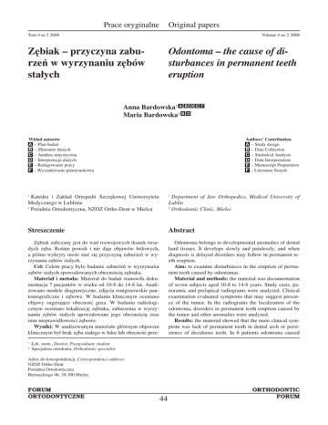 Prace oryginalne Original papers Tom 4 nr 2 2008 Volume 4 no 2 2008 Zębiak – przyczyna zaburzeń w wyrzynaniu zębów stałych Odontoma – the cause of disturbances in permanent teeth eruption Anna Bardowska1 A B D Maria Bardowska2 B D Wkład autorów A – Plan badań B – Zbieranie danych C – Analiza statystyczna D – Interpretacja danych E – Redagowanie pracy F – Wyszukiwanie piśmiennictwa E F Authors’ Contribution A – Study design B – Data Collection C – Statistical Analysis D – Data Interpretation E – Manuscript Preparation F – Literature Search 1 Katedra i Zakład Ortopedii Szczękowej Uniwersytetu Medycznego w Lublinie 2 Poradnia Ortodontyczna, NZOZ Ortho-Dent w Mielcu Department of Jaw Orthopedics, Medical University of Lublin 2 Orthodontic Clinic, Mielec Streszczenie Abstract Zębiak zaliczany jest do wad rozwojowych tkanek twardych zęba. Rośnie powoli i nie daje objawów bólowych, a póżno wykryty może stać się przyczyną zaburzeń w wyrzynaniu zębów stałych. Cel: Celem pracy było badanie zaburzeń w wyrzynaniu zębów stałych spowodowanych obecnością zębiaka. Materiał i metoda: Materiał do badań stanowiła dokumentacja 7 pacjentów w wieku od 10-8 do 14-6 lat. Analizowano modele diagnostyczne, zdjęcia rentgenowskie pantomograficzne i zębowe. W badaniu klinicznym oceniano objawy sugerujące obecność guza. W badaniu radiologicznym oceniano lokalizację zębiaka, zaburzenia w wyrzynaniu zębów stałych spowodowane jego obecnością oraz inne nieprawidłowości zębowe. Wyniki: W analizowanym materiale głównym objawem klinicznym był brak zęba stałego w łuku lub obecność prze- Odontoma belongs to developmental anomalies of dental hard tissues. It develops slowly and painlessly, and when diagnosis is delayed disorders may follow in permanent teeth eruption. Aim: to examine disturbances in the eruption of permanent teeth caused by odontomas. Material and methods: the material was documentation of seven subjects aged 10-8 to 14-6 years. Study casts, panoramic and periapical radiograms were analyzed. Clinical examination evaluated symptoms that may suggest presence of the tumor. In the radiograms the localization of the odontoma, disorders in permanent teeth eruption caused by the tumor and other anomalies were analyzed. Results: the material showed that the main clinical symptom was lack of permanent tooth in dental arch or persistence of deciduous teeth. In 6 patients odontoma caused 1 2 1 Lek. stom., Dentist, Postgraduate student Specjalista ortodonta, Orthodontic specialist Adres do korespondencji, Correspondence address: NZOZ Ortho-Dent Poradnia Ortodontyczna Biernackiego 4b, 39-300 Mielec FORUM ORTODONTYCZNE 44 ORTHODONTIC FORUM Prace oryginalne Original papers Tom 4 nr 2 2008 Volume 4 no 2 2008 trwałych zębów mlecznych. U 6 pacjentów zębiak był przyczyną zatrzymania zębów stałych. W 2 przypadkach zaobserwowano samoistne wyrzynanie się zębów po usunięciu guza. U 2 pacjentów stwierdzono hipodoncję oraz lokalizację zębiaka w miejscu brakującego zęba stałego typowego. Wszyscy pacjenci z retencją zębów leczeni byli poprzez chirurgiczne odsłonięcie korony zęba zatrzymanego, naklejenie zaczepu i wprowadzenie go do łuku za pomocą aparatu stałego. Wnioski: Zębiak może powodować zaburzenia w wyrzynaniu zębów stałych, dlatego najczęściej wykrywany jest w okresie wymiany uzębienia. Opisane w pracy przypadki lokalizacji zębiaka w miejscu brakującego zęba stałego potwierdzają przypuszczenia, że może on powstawać w wyniku nadczynności listewki zębowej lub chaotycznego podziału zawiązka zęba typowego na liczne twory zębopodobne. Wykonywanie pantomogramów jako zdjęć przeglądowych pozwala na wczesne wykrycie zębiaka i powinno być postępowaniem rutynowym w stomatologii. (Forum Ortod. 2008; 4: 44 - 50). Nadesłano: 10.03.2008. Przyjęto do druku: 31.03.2008. impaction of permanent teeth. In two cases removal of the tumor resulted in spontaneous eruption. In two patients with hypodontia odontoma was localized in place of missing typical permanent tooth. Surgical exposure of impacted tooth crown, bonding an attachment and bringing it into the arch by a fixed appliance was the applied procedure. Conclusions: Odontoma may cause disturbances in permanent teeth eruption so it is usually diagnosed in the transitional stage of dentition. The cases of odontoma located in place of missing permanent tooth described in the paper confirm the opinion that it may develop due to hyperactivity of dental lamina or chaotic division of typical dental bud into numerous denticles. Panoramic radiograms help early detection of odontomas and should be a routine procedure in dentistry. (Orthod. Forum 2008; 4: 44 -50). Received: 10.03.2008. Accepted: 31.03.2008. Key words: dental lamina disorder impacted permanent teeth odontoma permanent tooth eruption disturbances persistence of deciduous teeth Słowa kluczowe: przetrwałe zęby mleczne zaburzenia listewki zębowej zaburzenia w wyrzynaniu zębów stałych zatrzymane zęby stałe zębiak Wstęp Introduction Zębiak zaliczany jest do wad rozwojowych tkanek twardych zęba (1). Stanowi od 50.4% do 67% wszystkich guzów zębopochodnych (2). Mała dynamika wzrostu guza sprawia, że często rozwija się on bezobjawowo. Najczęściej wykrywany jest przypadkowo podczas badania radiologicznego (3). Ze względu na budowę wyróżnia się zębiaki mieszane i złożone (4, 5). Guz może być zlokalizowany śródkostnie, na brzegu wyrostka zębodołowego lub wyrzynać się do jamy ustnej (5). Najczęściej występują zębiaki śródkostne w przednim odcinku szczęki oraz w okolicy trzonowców żuchwy. W szczęce są to głównie zębiaki złożone zawierajace w swojej masie od kilku do kilkudziesięciu małych tworów zbliżonych budową do zębów. W żuchwie natomiast częściej występują zębiaki mieszane o bezkształtnej strukturze składającej się z chaotycznie