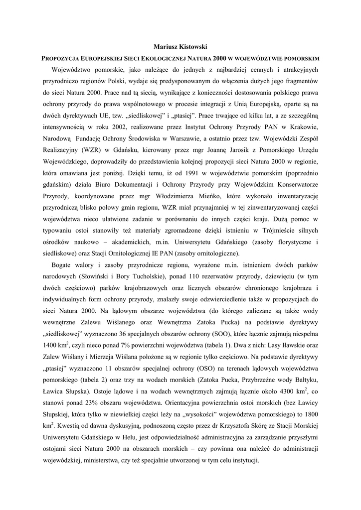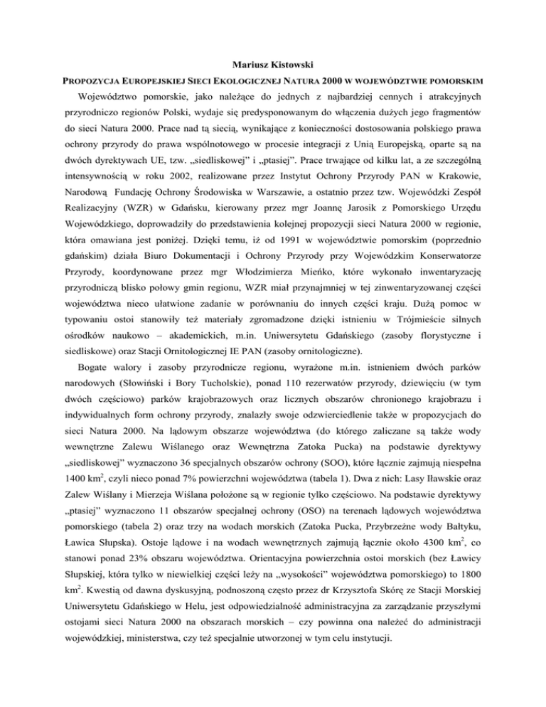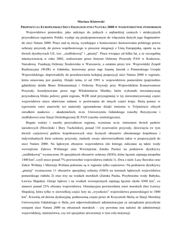 Mariusz Kistowski PROPOZYCJA EUROPEJSKIEJ SIECI EKOLOGICZNEJ NATURA 2000 W WOJEWÓDZTWIE POMORSKIM Województwo pomorskie, jako należące do jednych z najbardziej cennych i atrakcyjnych przyrodniczo regionów Polski, wydaje się predysponowanym do włączenia dużych jego fragmentów do sieci Natura 2000. Prace nad tą siecią, wynikające z konieczności dostosowania polskiego prawa ochrony przyrody do prawa wspólnotowego w procesie integracji z Unią Europejską, oparte są na dwóch dyrektywach UE, tzw. „siedliskowej” i „ptasiej”. Prace trwające od kilku lat, a ze szczególną intensywnością w roku 2002, realizowane przez Instytut Ochrony Przyrody PAN w Krakowie, Narodową Fundację Ochrony Środowiska w Warszawie, a ostatnio przez tzw. Wojewódzki Zespół Realizacyjny (WZR) w Gdańsku, kierowany przez mgr Joannę Jarosik z Pomorskiego Urzędu Wojewódzkiego, doprowadziły do przedstawienia kolejnej propozycji sieci Natura 2000 w regionie, która omawiana jest poniżej. Dzięki temu, iż od 1991 w województwie pomorskim (poprzednio gdańskim) działa Biuro Dokumentacji i Ochrony Przyrody przy Wojewódzkim Konserwatorze Przyrody, koordynowane przez mgr Włodzimierza Mieńko, które wykonało inwentaryzację przyrodniczą blisko połowy gmin regionu, WZR miał przynajmniej w tej zinwentaryzowanej części województwa nieco ułatwione zadanie w porównaniu do innych części kraju. Dużą pomoc w typowaniu ostoi stanowiły też materiały zgromadzone dzięki istnieniu w Trójmieście silnych ośrodków naukowo – akademickich, m.in. Uniwersytetu Gdańskiego (zasoby florystyczne i siedliskowe) oraz Stacji Ornitologicznej IE PAN (zasoby ornitologiczne). Bogate walory i zasoby przyrodnicze regionu, wyrażone m.in. istnieniem dwóch parków narodowych (Słowiński i Bory Tucholskie), ponad 110 rezerwatów przyrody, dziewięciu (w tym dwóch częściowo) parków krajobrazowych oraz licznych obszarów chronionego krajobrazu i indywidualnych form ochrony przyrody, znalazły swoje odzwierciedlenie także w propozycjach do sieci Natura 2000. Na lądowym obszarze województwa (do którego zaliczane są także wody wewnętrzne Zalewu Wiślanego oraz Wewnętrzna Zatoka Pucka) na podstawie dyrektywy „siedliskowej” wyznaczono 36 specjalnych obszarów ochrony (SOO), które łącznie zajmują niespełna 1400 km2, czyli nieco ponad 7% powierzchni województwa (tabela 1). Dwa z nich: Lasy Iławskie oraz Zalew Wiślany i Mierzeja Wiślana położone są w regionie tylko częściowo. Na podstawie dyrektywy „ptasiej” wyznaczono 11 obszarów specjalnej ochrony (OSO) na terenach lądowych województwa pomorskiego (tabela 2) oraz trzy na wodach morskich (Zatoka Pucka, Przybrzeżne wody Bałtyku, Ławica Słupska). Ostoje lądowe i na wodach wewnętrznych zajmują łącznie około 4300 km2, co stanowi ponad 23% obszaru województwa. Orientacyjna powierzchnia ostoi morskich (bez Ławicy Słupskiej, która tylko w niewielkiej części leży na „wysokości” województwa pomorskiego) to 1800 km2. Kwestią od dawna dyskusyjną, podnoszoną często przez dr Krzysztofa Skórę ze Stacji Morskiej Uniwersytetu Gdańskiego w Helu, jest odpowiedzialność administracyjna za zarządzanie przyszłymi ostojami sieci Natura 2000 na obszarach morskich – czy powinna ona należeć do administracji wojewódzkiej, ministerstwa, czy też specjalnie utworzonej w tym celu instytucji. Tabela 1. Charakterystyka proponowanych ostoi „siedliskowych” (SOO) sieci Natura 2000 Nr na mapie Nazwa 1 Bagna Izbickie 2 Białe Błoto 3 Białogóra 4 Brzezianek 5 6 7 8 9 10 11 12 13 Dolina Dolnej Wisły Dolina Górnej Łeby Dolina Kłodawy Dolina Reknicy Dolina Słupi Dolina środkowej Wietcisy Jar Rzeki Raduni Jeziora Raduńsko-Ostrzyckie Jeziora Wdzydzkie 14 15 16 17 18 19 20 21 22 23 24 25 26 27 Jeziorka Chośnickie Jezioro Krasne Jezioro Piasek Kurze Grzędy Mawra – Bagno Biała Mechowiska Sulęczyńskie Mierzeja Sarbska Młosino Orle Paraszyńskie Buczyny Pełcznica Piaśnickie Łąki Pływające wyspy Rekowa Przymorskie Błota 28 Sandr Brdy (i Dolina Kulawy) 29 30 31 32 33 34 35 Słowiński Park Narodowy Staniszewskie Błoto Studzienickie Torfowiska Trzy Młyny Wda koło Krępek Zatoka Pucka i Płw. Helski Zalew Wiślany i Mierzeja Wiślana 43 Lasy Iławskie Powierzchnia (ha) Główne walory 920 Wrzosowiska atlantyckie, bory,brzeziny bagienne, torfowiska 11 Torfowisko kotłowe z cennymi zbiorowiskami roślinnymi 1018 Bory bażynowe, brzeziny bagienne, lasy dębowo-brzozowe i bukowo-dębowe, torfowiska 494 Jeziorka dystroficzne, torfowiska przejściowe, grąd subkontynentalny, ostoja bobra 8572 Zarośla wierzbowe, lasy łęgowe, grądy, murawy napiaskowe 2109 Wilgotne łąki, łęgi, wiszące torfowiska, wysięki, żródliska 10 Grądy, cyrki źródliskowe 66 Rzeka pstrągowa, łęgi, wysięki 37195 Jeziora rynnowe i lobeliowe, łęgi olszowo-jesionowe 357 Wilgotne łąki, lasy łęgowe i grądowe, wysięki zboczowe 84 Przełom rzeczny, łąki, grądy, cenna flora 5040 Jeziora rynnowe,torfowiska,nakredowa buczyna storczykowa 10354 Mezotroficzne i lobeliowe jeziora, torfowiska wysokie i przejściowe, w tym nakredowe 214 Torfowisko wysokie, jeziora dystroficzne, bór bagienny 95 Jezioro lobeliowe, brzezina bagienna, torfowisko przejściowe 82 Jezioro lobeliowe, pło torfowcowe, kwaśna buczyna 1394 Zbiorowiska torfowiskowe, reliktowe gatunki flory 301 Buczyna pomorska, grądy, łęgi, torfowiska wysokie 65 Torfowisko nawapienne 1026 Bory bażynowe, olsy,brzeziny bagienne, torfy śródwydmowe 733 8 jezior lobeliowych i dystroficznych, torfowiska wysokie 261 Nawapienny kompleks łąkowo-torfowiskowy 3136 Kwaśne i żyzne buczyny, łęg jesionowo-olchowy, źródliska 442 Jeziora lobeliowe, torfowiska 80 Zmiennowilgotne łąki i szuwary, lasy brzozowo-dębowe 82 Torfowiska mszarne, kwaśna buczyna,dąbrowa, bór bagienny 1586 Szuwary trzcinowe i turzycowe, olsy, acidofilne dąbrowy, torfowiska wysokie i przejściowe