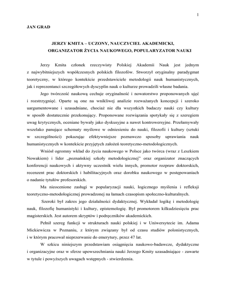 1 JAN GRAD JERZY KMITA – UCZONY, NAUCZYCIEL AKADEMICKI, ORGANIZATOR ŻYCIA NAUKOWEGO, POPULARYZATOR NAUKI Jerzy Kmita członek rzeczywisty Polskiej Akademii Nauk jest jednym z najwybitniejszych współczesnych polskich filozofów. Stworzył oryginalny paradygmat teoretyczny, w którego kontekście przedstawiciele metodologii nauk humanistycznych, jak i reprezentanci szczegółowych dyscyplin nauk o kulturze prowadzili własne badania. Jego twórczość naukową cechuje oryginalność i nowatorstwo proponowanych ujęć i rozstrzygnięć. Oparte są one na wnikliwej analizie rozważanych koncepcji i szeroko uargumentowane i uzasadniane, chociaż nie dla wszystkich badaczy nauki czy kultury w sposób dostatecznie przekonujący. Proponowane rozwiązania spotykały się z szeregiem uwag krytycznych, oceniane bywały jako dyskusyjne a nawet kontrowersyjne. Przełamywały wszelako panujące schematy myślowe w odniesieniu do nauki, filozofii i kultury (sztuki w szczególności) pokazując efektywniejsze poznawczo sposoby uprawiania nauk humanistycznych w kontekście przyjętych założeń teoretyczno-metodologicznych. Wniósł ogromny wkład do życia naukowego w Polsce jako twórca (wraz z Leszkiem Nowakiem) i lider „poznańskiej szkoły metodologicznej” oraz organizator znaczących konferencji naukowych i aktywny uczestnik wielu innych, promotor rozpraw doktorskich, recenzent prac doktorskich i habilitacyjnych oraz dorobku naukowego w postępowaniach o nadanie tytułów profesorskich. Ma nieocenione zasługi w popularyzacji nauki, logicznego myślenia i refleksji teoretyczno-metodologicznej prowadzonej na łamach czasopism społeczno-kulturalnych. Szeroki był zakres jego działalności dydaktycznej. Wykładał logikę i metodologię nauk, filozofię humanistyki i kultury, epistemologię. Był promotorem kilkudziesięciu prac magisterskich. Jest autorem skryptów i podręczników akademickich. Pełnił szereg funkcji w strukturach nauki polskiej i w Uniwersytecie im. Adama Mickiewicza w Poznaniu, z którym związany był od czasu studiów polonistycznych, i w którym pracował nieprzerwanie do emerytury, przez 47 lat. W szkicu niniejszym przedstawiam osiągnięcia naukowo-badawcze, dydaktyczne i organizacyjne oraz w sferze upowszechniania nauki Jerzego Kmity uzasadniające - zawarte w tytule i powyższych uwagach wstępnych - stwierdzenia. 2 Jerzy Kmita urodził się 26 grudnia 1931 roku w Rajsku koło Kalisza, w rodzinie inteligenckiej. Jego rodzice: ojciec Stanisław i matka Janina z d. Chrzanowska byli nauczycielami zatrudnionymi w miejscowej szkole powszechnej, w której siedmioletni Jerzy rozpoczął naukę 1 września 1938 roku. Przerwał ją wybuch II wojny światowej. W 1940 roku zmarł jego ojciec i utrzymanie rodziny dwóch synów i córki spadło na barki matki, która nie mogąc pracować w zawodzie nauczycielskim, znalazła zatrudnienie jako urzędniczka w niemieckim urzędzie Kasy Chorych (Krankenkasse) w Kaliszu. Pozbawieni przez władze okupacyjne mieszkania w miejscowym Domu Nauczyciela zamienionym na szkołę dla niemieckiej organizacji młodzieżowej Hitlerjugend przez okres wojny zmieniają kilkakrotnie miejsce zamieszkania, przez krótszy lub dłuższy czas przebywając w kilku podkaliskich miejscowościach, by na koniec wojny zamieszkać we wsi Agnieszkowo. Po wojnie rodzina Kmitów przenosi się do Kalisza, gdzie matka podjęła pracę w Państwowej Szkole Podstawowej nr 13. Edukacja szkolna W czasie okupacji nauczaniem dzieci w zakresie szkoły powszechnej zajęła się matka. Dzięki jej i własnemu wysiłkowi edukacyjnemu mógł Jerzy po zakończeniu wojny, po zdaniu egzaminu wstępnego, rozpocząć we wrześniu 1945 roku naukę w Państwowym Gimnazjum i Liceum im. Adama Asnyka w Kaliszu (przekształconym w 1948 roku w Liceum Ogólnokształcące im. A. Asnyka), którą ukończył złożeniem egzaminu dojrzałości w maju 1951 roku. W okresie edukacji gimnazjalno-licealnej ujawniły się jego zdolności w kierunku nauk humanistycznych, w szczególności specjalne zdolności w kierunku literatury (pisze wiersze, był redaktorem gazetki ściennej) - jak stwierdzono w wystawionej mu przez Szkolną Komisję Rekrutacyjną opinii, kiedy ubiegał się przyjęcie na studia. W jego charakterystyce napisano również, że posiada „przygotowanie ogólne dobre, uzdolnienie dobre, zainteresowanie nauką poważne, pilność dobra”, zaś Powiatowa Komisja Rekrutacyjna stwierdziła ogólnie, iż wyróżnił się w pracy szkolnej i społecznej. Uspołeczniony i w stosunku do rzeczywistości obecnej – pozytywny. Uczeń Kmita poświęcał swój czas wolny na ponadobowiązkową lekturę humanistycznych tekstów naukowych uzyskując w tym zakresie dużą erudycję. Na jego oczytanie w zakresie literatury i nauki o literaturze zwrócono uwagę w ocenie jego pisemnej pracy egzaminacyjnej na studia polonistyczne napisanej na temat Jak walczymy o nowe oblicze literatury polskiej, w której, poza różnymi utworami prozatorskimi tzw. realizmu 3 socjalistycznego, odwoływał się do krytycznych i literaturoznawczych opracowań Henryka Markiewicza i Stefana Żółkiewskiego, swobodnie posługując się pojęciami literaturoznawczymi. Notabene już w tej pracy egzaminacyjnej dają się zauważyć pewne charakterystyczne cechy późniejszego ukształtowanego już stylu pisarstwa naukowego J. Kmity i sposobu argumentowania. W okresie edukacji szkolnej zaczęły kształtować się jego zainteresowania problematyką literaturoznawczą i filozoficzną oraz logiczną teorią języka („Logika” była przedmiotem nauczania w programie liceum ogólnokształcącego), które znalazły swoje odzwierciedlenie w późniejszych badaniach naukowych Jerzego Kmity. Na zainteresowania logiką i metodologią nauk wpłynęła lektura prac Kazimierza Ajdukiewicza1 i Jana Salamuchy2. Zapoznał się też wówczas nie tylko z podstawową dla filozoficznej edukacji Historią filozofii Władysława Tatarkiew