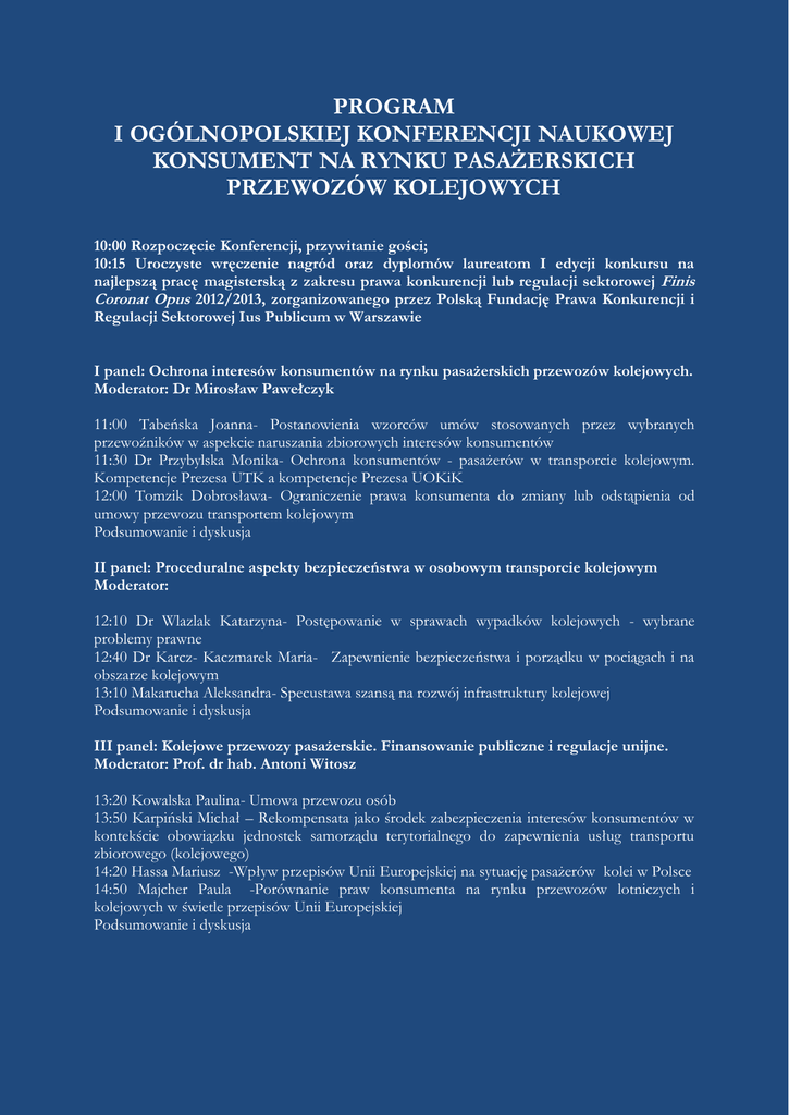 PROGRAM I OGÓLNOPOLSKIEJ KONFERENCJI NAUKOWEJ KONSUMENT NA RYNKU PASAŻERSKICH PRZEWOZÓW KOLEJOWYCH 10:00 Rozpoczęcie Konferencji, przywitanie gości; 10:15 Uroczyste wręczenie nagród oraz dyplomów laureatom I edycji konkursu na najlepszą pracę magisterską z zakresu prawa konkurencji lub regulacji sektorowej Finis Coronat Opus 2012/2013, zorganizowanego przez Polską Fundację Prawa Konkurencji i Regulacji Sektorowej Ius Publicum w Warszawie I panel: Ochrona interesów konsumentów na rynku pasażerskich przewozów kolejowych. Moderator: Dr Mirosław Pawełczyk 11:00 Tabeńska Joanna- Postanowienia wzorców umów stosowanych przez wybranych przewoźników w aspekcie naruszania zbiorowych interesów konsumentów 11:30 Dr Przybylska Monika- Ochrona konsumentów - pasażerów w transporcie kolejowym. Kompetencje Prezesa UTK a kompetencje Prezesa UOKiK 12:00 Tomzik Dobrosława- Ograniczenie prawa konsumenta do zmiany lub odstąpienia od umowy przewozu transportem kolejowym Podsumowanie i dyskusja II panel: Proceduralne aspekty bezpieczeństwa w osobowym transporcie kolejowym Moderator: 12:10 Dr Wlazlak Katarzyna- Postępowanie w sprawach wypadków kolejowych - wybrane problemy prawne 12:40 Dr Karcz- Kaczmarek Maria- Zapewnienie bezpieczeństwa i porządku w pociągach i na obszarze kolejowym 13:10 Makarucha Aleksandra- Specustawa szansą na rozwój infrastruktury kolejowej Podsumowanie i dyskusja III panel: Kolejowe przewozy pasażerskie. Finansowanie publiczne i regulacje unijne. Moderator: Prof. dr hab. Antoni Witosz 13:20 Kowalska Paulina- Umowa przewozu osób 13:50 Karpiński Michał – Rekompensata jako środek zabezpieczenia interesów konsumentów w kontekście obowiązku jednostek samorządu terytorialnego do zapewnienia usług transportu zbiorowego (kolejowego) 14:20 Hassa Mariusz -Wpływ przepisów Unii Europejskiej na sytuację pasażerów kolei w Polsce 14:50 Majcher Paula -Porównanie praw konsumenta na rynku przewozów lotniczych i kolejowych w świetle przepisów Unii Europejskiej Podsumowanie i dyskusja