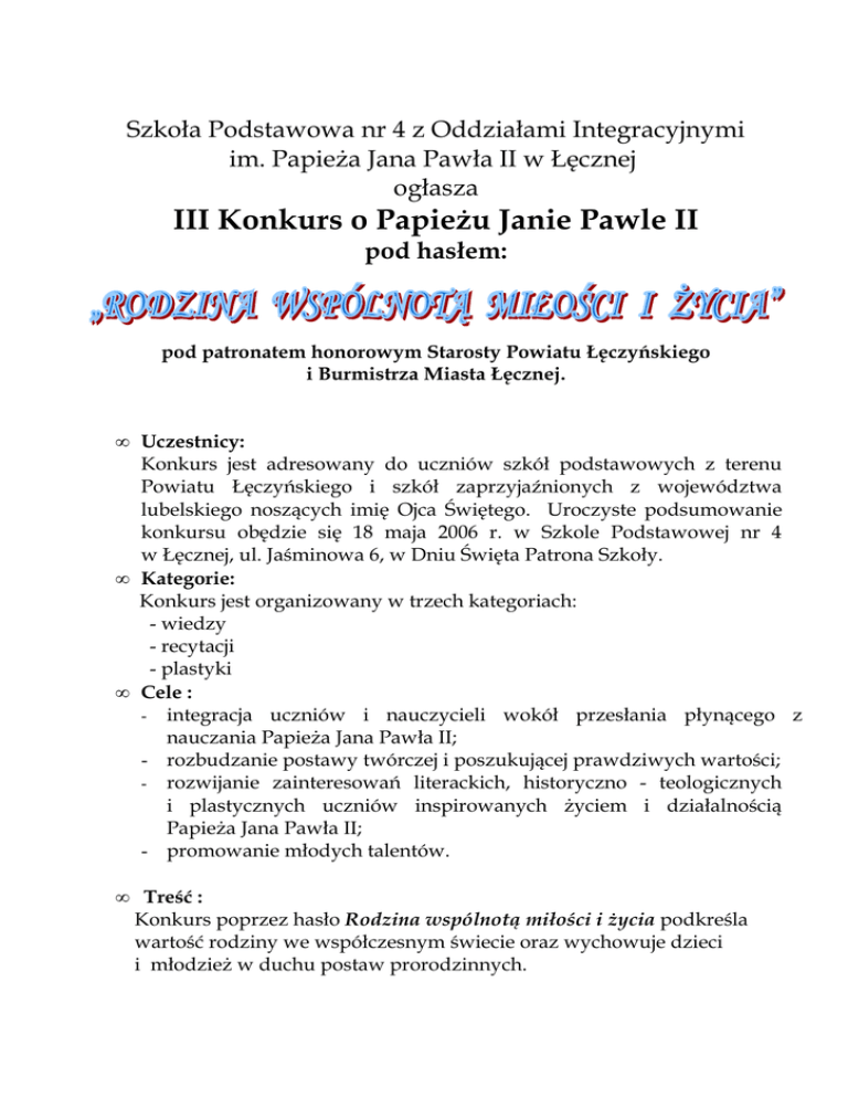 Szkoła Podstawowa nr 4 z Oddziałami Integracyjnymi im. Papieża Jana Pawła II w Łęcznej ogłasza III Konkurs o Papieżu Janie Pawle II pod hasłem: pod patronatem honorowym Starosty Powiatu Łęczyńskiego i Burmistrza Miasta Łęcznej. • Uczestnicy: Konkurs jest adresowany do uczniów szkół podstawowych z terenu Powiatu Łęczyńskiego i szkół zaprzyjaźnionych z województwa lubelskiego noszących imię Ojca Świętego. Uroczyste podsumowanie konkursu obędzie się 18 maja 2006 r. w Szkole Podstawowej nr 4 w Łęcznej, ul. Jaśminowa 6, w Dniu Święta Patrona Szkoły. • Kategorie: Konkurs jest organizowany w trzech kategoriach: - wiedzy - recytacji - plastyki • Cele : - integracja uczniów i nauczycieli wokół przesłania płynącego z nauczania Papieża Jana Pawła II; - rozbudzanie postawy twórczej i poszukującej prawdziwych wartości; - rozwijanie zainteresowań literackich, historyczno - teologicznych i plastycznych uczniów inspirowanych życiem i działalnością Papieża Jana Pawła II; - promowanie młodych talentów. • Treść : Konkurs poprzez hasło Rodzina wspólnotą miłości i życia podkreśla wartość rodziny we współczesnym świecie oraz wychowuje dzieci i młodzież w duchu postaw prorodzinnych. REGULAMIN KONKURSU I KATEGORIA – KONKURS WIEDZY 1. Konkurs wiedzy skierowany jest do uczniów klas III-VI szkoły podstawowej. 2. Każda placówka typuje od jednego do trzech uczestników wyłonionych drogą eliminacji szkolnych. 3. Finał konkursu odbędzie się 18 V 2006 r. w godz. 900- 1400 w Szkole Podstawowej nr 4 z Oddziałami Integracyjnymi im. Papieża Jana Pawła II w Łęcznej. 4. Uczniowie podzieleni na dwie kategorie wiekowe III-IV i V-VI otrzymają test z zadaniami do rozwiązania sprawdzający znajomość następujących zagadnień: biografia Papieża (zwłaszcza okres dzieciństwa, np.: sytuacja rodzinna, informacje o najbliższych – rodzicach, rodzeństwie); Wadowice jako miasto rodzinne Papieża (najważniejsze miejsca, zabytki, związek Jana Pawła II z Wadowicami); nasz Patron o rodzinie (problemy zawarte w książkach i publikacjach). 5. Test składający się z zadań różnego typu uczniowie będą rozwiązywać indywidualnie. Zostanie on opracowany przez powołaną komisję w oparciu o podaną poniżej bibliografię. 6. Czas trwania testu: 60 min. 7. Zgłoszenia potwierdzające udział w turnieju wiedzy należy przesłać do 15 IV 2006 r. na adres: Szkoła Podstawowa nr 4 z Oddziałami Integracyjnymi im. Papieża Jana Pawła II w Łęcznej; ul. Jaśminowa 6; 21-010 Łęczna z dopiskiem III Konkurs o Papieżu Janie Pawle II. KARTA ZGŁOSZENIA /kat. wiedza/ ........................................................................................................................... (imię i nazwisko uczestnika, klasa) ............................................................................................................................ (nazwa i adres szkoły, tel.) ............................................................................................................................ (imię i nazwisko nauczyciela przygotowującego) Literatura podstawowa: 1. Ks. Mieczysław Maliński, Przyjaciel Ludzi, Wrocław 2002. 2. Joanna Krzyżanek, Jan Paweł II, czyli jak Karolek został papieżem, Sandomierz 2005. 3. Ks. Mieczysław Maliński, Polski Papież. Karol Wojtyła, Kraków 1999, t. I, ss. 35-52. Literatura uzupełniająca: 1. Paweł Zuchniewicz, Papież rodzin, Kraków 2002. II KATEGORIA - KONKURS RECYTATORSKI 1. W konkursie mogą wziąć udział uczniowie klas IV – VI szkoły podstawowej. 2. Każda szkoła może wytypować do trzech uczestników wyłonionych drogą eliminacji szkolnych. 3. Konkursu odbędzie się w Szkole Podstawowej nr 4 w Łęcznej w dniu 18 V 2006 r. w godzinach 900 - 1400. 4. Każdy uczestnik konkursu powinien przygotować do recytacji jeden utwór do wyboru: wiersz albo fragment prozy autorstwa Karola Wojtyły bądź dowolnie wybranego autora, tematyką nawiązujący do hasła konkursu. 5. Czas recytacji utworu przez jednego uczestnika nie może być dłuższy niż 5 minut. 6. Istnieje możliwość wykorzystania podkładu muzycznego. 7. Do dnia 15 IV 2006 r. należy przesłać kartę zgłoszenia na adres Szkoły Podstawowej nr 4 w Łęcznej z dopiskiem na kopercie III Konkurs o Papieżu Janie Pawle II. KARTA ZGŁOSZENIA /kat. recytacja/ ......................................................................................................................... (imię i nazwisko uczestnika, klasa) ......................................................................................................................... (nazwa i adres szkoły, tel.) ......................................................................................................................... (imię i nazwisko nauczyciela przygotowującego) ......................................................................................................................... (tytuł i autor wybranego utworu) III KATEGORIA - KONKURS PLASTYCZNY 1. W konkursie mogą wziąć udział uczniowie klas I – VI szkoły podstawowej. 2. Prace powinny być wykonane następującą techniką: grafika – (wymiar dowolny), malarstwo, rysunek, collage, wydzieranka, wyklejanka. 3. Liczba i wymiar prac: 1 praca jednego autora o wymiarach nie większych niż A3. Prace powinny być zabezpieczone przed zniszczeniem i zawierać informacje: imię i nazwisko autora, wiek, szkoła, imię i nazwisko nauczyciela pod kierunkiem którego praca została wykonana. 4. Prace zbiorowe i zniszczone nie będą brane pod uwagę. 5. Prace należy składać w terminie do 15 kwietnia 2006 r. na adres: Szkoła Podstawowa Nr 4; ul. Jaśminowa 6; 21 – 010 Łęczna; z załączoną kartą zgłoszenia oraz z dopiskiem III Konkurs o Papieżu Janie Pawle II. 6. Komisja powołana przez organizatorów konkursu zdecyduje o: zakwalifikowaniu prac do konkursu, zakwalifikowaniu prac na wystaw