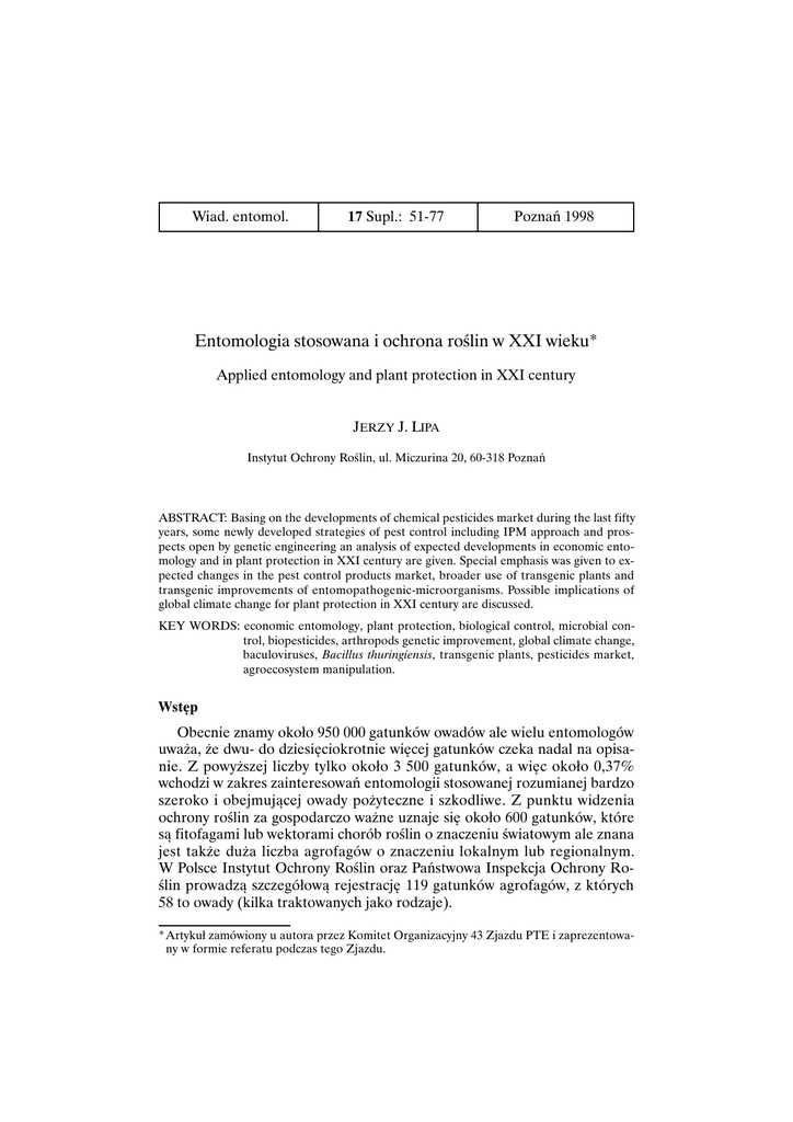 Wiad. entomol. 17 Supl.: 51-77 Poznań 1998 Entomologia stosowana i ochrona roślin w XXI wieku* Applied entomology and plant protection in XXI century JERZY J. LIPA Instytut Ochrony Roślin, ul. Miczurina 20, 60-318 Poznań ABSTRACT: Basing on the developments of chemical pesticides market during the last fifty years, some newly developed strategies of pest control including IPM approach and prospects open by genetic engineering an analysis of expected developments in economic entomology and in plant protection in XXI century are given. Special emphasis was given to expected changes in the pest control products market, broader use of transgenic plants and transgenic improvements of entomopathogenic-microorganisms. Possible implications of global climate change for plant protection in XXI century are discussed. KEY WORDS: economic entomology, plant protection, biological control, microbial control, biopesticides, arthropods genetic improvement, global climate change, baculoviruses, Bacillus thuringiensis, transgenic plants, pesticides market, agroecosystem manipulation. Wstęp Obecnie znamy około 950 000 gatunków owadów ale wielu entomologów uważa, że dwu- do dziesięciokrotnie więcej gatunków czeka nadal na opisanie. Z powyższej liczby tylko około 3 500 gatunków, a więc około 0,37% wchodzi w zakres zainteresowań entomologii stosowanej rozumianej bardzo szeroko i obejmującej owady pożyteczne i szkodliwe. Z punktu widzenia ochrony roślin za gospodarczo ważne uznaje się około 600 gatunków, które są fitofagami lub wektorami chorób roślin o znaczeniu światowym ale znana jest także duża liczba agrofagów o znaczeniu lokalnym lub regionalnym. W Polsce Instytut Ochrony Roślin oraz Państwowa Inspekcja Ochrony Roślin prowadzą szczegółową rejestrację 119 gatunków agrofagów, z których 58 to owady (kilka traktowanych jako rodzaje). * Artykuł zamówiony u autora przez Komitet Organizacyjny 43 Zjazdu PTE i zaprezentowany w formie referatu podczas tego Zjazdu. 52 J. J. LIPA Liczba gatunków owadów pożytecznych jest wielokrotnie większa ale ich rola w przyrodzie jest poważnie niedoceniana. Przeciętny mieszkaniec miasta patrzy na świat owadów tylko przez pryzmat kłującego go komara lub muchy siadającej na bułce z miodem. Natomiast rolnik wprawdzie rozumie rolę pszczoły miodnej w zapylaniu roślin ale koncentruje swą uwagę na stosowaniu środków chemicznych przeciw stonce na ziemniakach lub przeciw słodyszkowi na rzepaku. Przed trzema laty na XLII Zjeździe PTE w Poznaniu BANASZAK (1996) mówiąc o entomologii stosowanej skoncentrował się na apidologii, która zajmuje się pożyteczną rolą pszczół, trzmieli i innych błonkówek. Natomiast na obecnym XLIII Zjeździe PTE chcę omówić kilka działów entomologii stosowanej, które stanowią moje zainteresowania naukowe i dotyczą ochrony roślin oraz pokazać postęp w tych tematach, które przedstawiałem w plenarnej części XXIX Zjazdu Polskiego Związku Entomologicznego, który odbył się we wrześniu 1963 r. w Lublinie (LIPA, 1965). Owady jako szkodniki roślin w wyniku rozwoju rolnictwa Rośliny pojawiły się na ziemi na około 100 mln lat przed owadami, które były pierwszymi małymi zwierzętami na suchym lądzie. W okresie karbonu (350 mln lat temu) obok ogromnych gadów i płazów na ziemi żyły ważkopodobne owady o rozpiętości skrzydeł do 75 cm i można sobie wyobrazić jaki hałas robiły podczas lotu i jakie ilości pokarmu roślinnego konsumowały. W okresie permu (280 mln lat temu) owady wykształciły swe podstawowe obecne cechy tj. metamorfozę oraz zdolność składania skrzydeł wzdłuż ciała co dało im możność przemieszczania się między roślinami lub kopać chodniki w ziemi. Pod koniec ery paleozoicznej (220 mln lat temu) główne rzędy owadów m.in. chrząszcze (Coleoptera) i prostoskrzydłe (Orthoptera) występowały już bardzo licznie. W miarę kolejnych epok geologicznych owady opanowały wszystkie środowiska lądowe oraz rozwinęły sposoby żerowania na roślinach, różnych zwierzętach (w tym także drapieżnictwo i pasożytnictwo na innych owadach), a także odżywianie się butwiejącymi organicznymi substancjami. Owady pasożytowały także na małpach oraz na przodkach człowieka, z których pchły i wszy przeszły na Homo sapiens L. gdy pojawił się na Ziemi. Praludzie i pierwsi ludzie odżywiali się orzechami, owocami, pędami roślin i bez wątpienia owadami z uwagi na łatwość ich zbierania. Świadectwem tego jest fakt, że wiele plemion aborygenów w krajach tropikalnych (Afryka i Ameryka Środkowa oraz Południowa) do dzisiaj odżywia się owadami jako pożywieniem podstawowym lub delikatesowym. ENTOMOLOGIA STOSOWANA I OCHRONA ROŚLIN W XXI WIEKU 53 Był okres, gdy plemiona i grupy ludzkie bazowały na myślistwie co przyczyniło się do rozwoju języka, gdyż było konieczne komunikowanie się przy zbiorowych polowaniach. Jednakże 20000–50000 lat temu liczebność dużych roślinożernych zwierząt zmniejszyła się w takim stopniu, że pierwotni ludzie ponownie przeszli na wielożerność ze znacznym udziałem w pożywieniu materiału roślinnego, którego przydatność pokarmowa rosła w miarę rozwoju technologii przerobu: rozdrabniania, gotowania lub fermentowania liści, nasion i owoców roślin. Nowe sposoby odżywiania się wywołały duże zapotrzebowanie na materiał roślinny a można było to osiągnąć tylko przez uprawę roślin używanych także jako pasza dla udomowionych gatunków zwierząt. Konsekwencją tego było modyfikowanie przez człowieka środowiska w kierunku powstania zwartych łanów monokultur sprzyjających masowemu rozmnażaniu się roślinożernych owadów. A więc wskutek swej rolniczej działalności pierwotny człowiek „stworzył” szkodniki roślin, z którymi walczył od zarania dziejów i kontynuujemy to obecnie. Potrzeba ochrony roślin i zmiana roli insektycydów w ostatnim półwieczu 