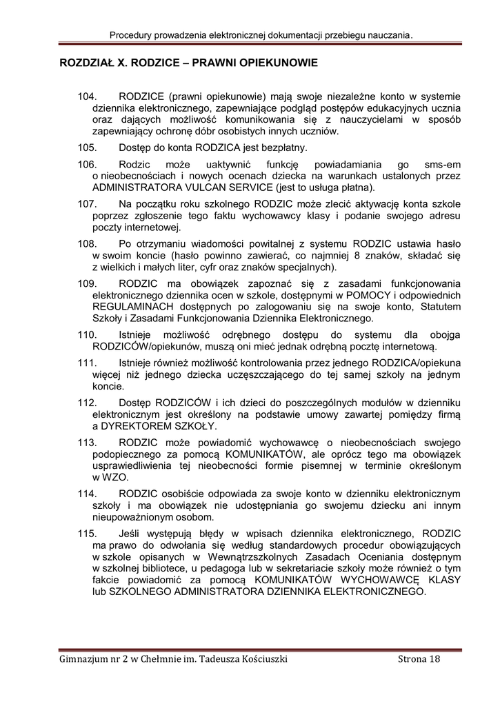 Procedury prowadzenia elektronicznej dokumentacji przebiegu nauczania. ROZDZIAŁ X. RODZICE – PRAWNI OPIEKUNOWIE 104. RODZICE (prawni opiekunowie) mają swoje niezależne konto w systemie dziennika elektronicznego, zapewniające podgląd postępów edukacyjnych ucznia oraz dających możliwość komunikowania się z nauczycielami w sposób zapewniający ochronę dóbr osobistych innych uczniów. 105. Dostęp do konta RODZICA jest bezpłatny. 106. Rodzic może uaktywnić funkcję powiadamiania go sms-em o nieobecnościach i nowych ocenach dziecka na warunkach ustalonych przez ADMINISTRATORA VULCAN SERVICE (jest to usługa płatna). 107. Na początku roku szkolnego RODZIC może zlecić aktywację konta szkole poprzez zgłoszenie tego faktu wychowawcy klasy i podanie swojego adresu poczty internetowej. 108. Po otrzymaniu wiadomości powitalnej z systemu RODZIC ustawia hasło w swoim koncie (hasło powinno zawierać, co najmniej 8 znaków, składać się z wielkich i małych liter, cyfr oraz znaków specjalnych). 109. RODZIC ma obowiązek zapoznać się z zasadami funkcjonowania elektronicznego dziennika ocen w szkole, dostępnymi w POMOCY i odpowiednich REGULAMINACH dostępnych po zalogowaniu się na swoje konto, Statutem Szkoły i Zasadami Funkcjonowania Dziennika Elektronicznego. 110. Istnieje możliwość odrębnego dostępu do systemu dla obojga RODZICÓW/opiekunów, muszą oni mieć jednak odrębną pocztę internetową. 111. Istnieje również możliwość kontrolowania przez jednego RODZICA/opiekuna więcej niż jednego dziecka uczęszczającego do tej samej szkoły na jednym koncie. 112. Dostęp RODZICÓW i ich dzieci do poszczególnych modułów w dzienniku elektronicznym jest określony na podstawie umowy zawartej pomiędzy firmą a DYREKTOREM SZKOŁY. 113. RODZIC może powiadomić wychowawcę o nieobecnościach swojego podopiecznego za pomocą KOMUNIKATÓW, ale oprócz tego ma obowiązek usprawiedliwienia tej nieobecności formie pisemnej w terminie określonym w WZO. 114. RODZIC osobiście odpowiada za swoje konto w dzienniku elektronicznym szkoły i ma obowiązek nie udostępniania go swojemu dziecku ani innym nieupoważnionym osobom. 115. Jeśli występują błędy w wpisach dziennika elektronicznego, RODZIC ma prawo do odwołania się według standardowych procedur obowiązujących w szkole opisanych w Wewnątrzszkolnych Zasadach Oceniania dostępnym w szkolnej bibliotece, u pedagoga lub w sekretariacie szkoły może również o tym fakcie powiadomić za pomocą KOMUNIKATÓW WYCHOWAWCĘ KLASY lub SZKOLNEGO ADMINISTRATORA DZIENNIKA ELEKTRONICZNEGO. Gimnazjum nr 2 w Chełmnie im. Tadeusza Kościuszki Strona 18 Procedury prowadzenia elektronicznej dokumentacji przebiegu nauczania. ROZDZIAŁ XI. UCZEŃ 116. Na początkowych godzinach wychowawczych i lekcjach informatyki UCZNIOWIE będą zapoznani przez nauczyciela z zasadami funkcjonowania dziennika elektronicznego w szkole. 117. UCZEŃ ma obowiązek zapoznać się z zasadami funkcjonowania elektronicznego dziennika ocen w szkole dostępnymi w POMOCY(opcje dziennika elektronicznego) i odpowiednich regulaminach dostępnych po zalogowaniu się na swoje konto (https://uonet.vulcan.net.pl/006476). 118. Dla UCZNIA, któremu ustalono indywidualny tok nauczania lub okresu specjalnej edukacji mającej na celu przywrócenie do prawidłowego funkcjonowania, tworzy się osobną klasę przydzielając nauczycieli według takich samych zasad jak dla każdej klasy. 119. UCZEŃ PRZY OBSŁUDZE SWOJEGO KONTA W DZIENNIKU ELEKTRONICZNYM, MA TAKIE SAME PRAWA, OBOWIĄZKI i uprawnienia jak rodzic na swoim koncie. 120. Jeśli z przyczyn technicznych, nie ma możliwości wprowadzenia danych do systemu: 1) Po usunięciu awarii Nauczyciele niezwłocznie wprowadzają dane do systemu ze swoich notatek. 121. Postępowanie Nauczyciela w czasie awarii. 1) NAUCZYCIELE mają obowiązek odnotowania frekwencji osiągnięć uczniów w swoich notesach. 2) Wszystkie awarie sprzętu komputerowego, oprogramowania czy sieci komputerowych, mają być zgłaszane osobiście w dniu zaistnienia jednej z wymienionych osób: A) SZKOLNEMU ADMINISTRATOROWI SIECI KOMPUTEROWEJ. B) SZKOLNEMU ELEKTRONICZNEGO. ADMINISTRATOROWI DZIENNIKA C) Pracownikowi SEKRETARIATU szkoły. Gimnazjum nr 2 w Chełmnie im. Tadeusza Kościuszki Strona 19