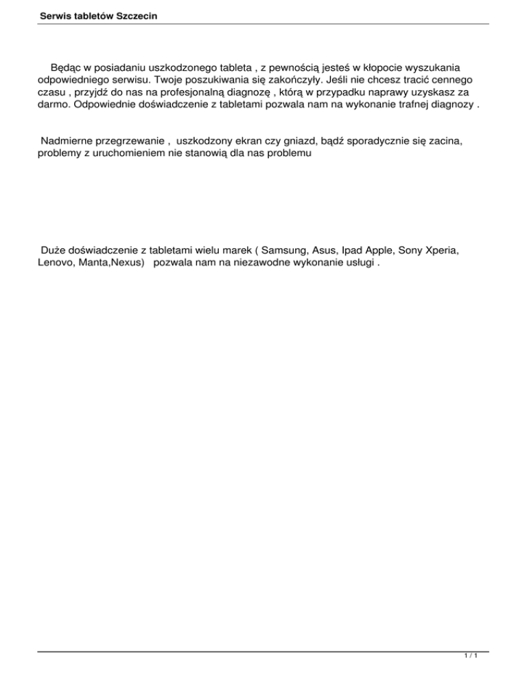 Serwis tabletów Szczecin Będąc w posiadaniu uszkodzonego tableta , z pewnością jesteś w kłopocie wyszukania odpowiedniego serwisu. Twoje poszukiwania się zakończyły. Jeśli nie chcesz tracić cennego czasu , przyjdź do nas na profesjonalną diagnozę , którą w przypadku naprawy uzyskasz za darmo. Odpowiednie doświadczenie z tabletami pozwala nam na wykonanie trafnej diagnozy . Nadmierne przegrzewanie , uszkodzony ekran czy gniazd, bądź sporadycznie się zacina, problemy z uruchomieniem nie stanowią dla nas problemu Duże doświadczenie z tabletami wielu marek ( Samsung, Asus, Ipad Apple, Sony Xperia, Lenovo, Manta,Nexus) pozwala nam na niezawodne wykonanie usługi . 1/1