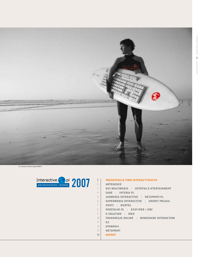 marketing w praktyce wrzesień 2007 © Lawrence Manning/CORBIS 2 2 3 4 5 6 7 8 9 10 11 12 13 14 Prezentacja firm interaktywnych Artegence OS3 multimedia | Ostryga e-ntertainment sare | interia pl janmedia interactive | netsprint.pl supermedia interactive | uninet polska venti | webtel widzialni.pl | easy.web | hbz e-solution | ideo transmisje online | MindShare Interaction k2 efabrika netsprint raport spis treści Prezentacja firm interaktywnych Artegence rok powstania 1995 liczba współpracowników 47 marketing w praktyce zakres działania: ul. Bukowińska 22b 02-703 Warszawa tel. (022) 380 13 13 fax (022) 380 13 14 Pełna obsługa w zakresie e-marketingu oraz e-commerce. wrzesień 2007 adres specjalizacja: Web 2.0. Budujemy społeczności. Od 1995. klienci: m.in.: AIG PTE, AXA, Bank BPH, Bank Zachodni WBK, Commercial Union, Europejski Fundusz Leasingowy, Ericsson, Filmweb.pl, Herbapol Lublin, Hewlett-Packard, Hortex, Kompania Piwowarska, Kraft Foods, Media Regionalne, Pekao SA, Play, Polkomtel, PTC, Raiffeisen Bank Polska S.A., Siemens, Sony, Telewizja Polska, Unilever Polska, Wyborowa SA. osoby zarządzające lub kontaktowe Artur Gortych prezes zarządu [email protected] Bartłomiej Wyszyński dyrektor ds. strategii [email protected] Michał Stefański kierownik ds. rozwoju biznesu [email protected] Magdalena Górak kierownik PR [email protected] spis treści e-mail [email protected] web www.artegence.com spis treści Prezentacja firm interaktywnych OS3 multimedia rok powstania 1996 liczba pracowników 46 marketing w praktyce Agencja interaktywna OS3 multimedia specjalizuje się w tworzeniu strategii, budowaniu wizerunku klienta oraz kształtowaniu trwałych więzi z otoczeniem poprzez internet i nowe media. specjalizacja: » serwisy internetowe (firmowe, produktowe, społecznościowe, eksperckie) » budowa wortali » internetowe kampanie reklamowe » bannery » pop-upy » e-mail marketing » prezentacje multimedialne » aplikacje biznesowe » gry online » gadżety multimedialne » kioski multimedialne » systemy zarządzania treścią » e-konsulting adres ul. Niedźwiedzia 2c 02-737 Warszawa tel. (022) 852 28 54 fax (022) 853 08 54 e-mail [email protected] web www.os3.pl klienci: Tissot, Tchibo, Era, Sony, 7Days, Philip Morris, Bols, Danone, Lexus, Tally Weijl, Reporter, Mieszko, PLL LOT, ING Bank Śląski, TelePizza, US Pharmacia, Agros Nova, Black Red White. osoby zarządzające lub kontaktowe: Marcin Maj dyrektor zarządzający [email protected] Ostryga e-ntertainment zakres działania: rok powstania 2006 liczba pracowników 10 Ostryga e-ntertainment specjalizuje się w budowaniu wizerunku firm poprzez rozrywkę w internecie. Oferta Ostrygi obejmuje tworzenie gier reklamowych w technologii Flash, Shockwave, product placement w grach pudełkowych oraz prowadzenie niestandardowych akcji i produkcji marketingu wirusowego. adres specjalizacja: » gry w technologii Flash i Shockwave » gry na telefony komórkowe » product placement w grach » produkcja filmów wirusowych » prowadzenie akcji marketingu szeptanego w internecie » wsparcie i działania ePR » niestandardowe formy promocji w internecie » działania promocyjne wykorzystujące narzędzia rozrywkowe w internecie klienci: Ostryga pracuje dla takich marek, jak: Agora, Aster, Bella, Getzzz, Cinema City, ING, Mieszko, miniclip.com, Expander, Amnesty International oraz dla agencji interaktywnych i domów mediowych. osoby zarządzające lub kontaktowe: Jacek Jankowski dyrektor zarządzający [email protected] spis treści ul.Niedźwiedzia 2c 02-737 Warszawa tel. (022) 852 28 60 fax (022) 853 08 54 e-mail [email protected] web www.ostryga.pl wrzesień 2007 zakres działania: spis treści Prezentacja firm interaktywnych SARE marketing w praktyce zakres działania: wrzesień 2007 rok powstania 2005 liczba pracowników 10 SARE to pierwsza polska firma specjalizująca się w e-mail marketingu. Dostarcza narzędzie umożliwiające samodzielne stworzenie mailingu, zarządzanie bazą adresową i obserwację wyników poszczególnych kampanii. System SARE wykorzystywany jest m.in. do obsługi newsletterów, kampanii reklamowych i informacyjnych, konkursów, programów lojalnościowych, komunikacji wewnętrznej i relacji inwestorskich. specjalizacja: » e-mail marketing » budowa i zarządzanie bazami adresowymi » przygotowanie i wysyłka newsletterów » kampanie e-mailingowe » konsulting klienci: Z systemu SARE korzysta już ponad 170 klientów, co daje firmie pozycję lidera rynku. Wśród nich znajdują się takie marki, jak: Media Markt, Siemens, Premiumclub, DPD, Bauer, Grupa Wydawnicza Infor, Reader’s Digest, Gruner+Jahr, PLL LOT, Netsprint, Jobs.pl, Bankier.pl, Mediarun.pl, Grupa Hotelowa Orbis, Oriflame, Saturn, Lexus, Fiat, Danone, Pysio, Jupi, Tele2, Reporter, Getin Holding, ING Bank Śląski i Commercial Union. osoby zarządzające lub kontaktowe: Krzysztof Dębowski dyrektor zarządzający [email protected] 507 039 710 adres ul. Niedźwiedzia 2c 02-737 Warszawa tel. (022) 852 28 59 fax (022) 853 08 54 e-mail [email protected] web www.sare.pl spis treści Prezentacja firm interaktywnych Janmedia Interactive Sp. z o.o. 2002 liczba pracowników 33 adres ul. Wybickiego 1 51-144 Wrocław tel. (071) 325 12 02 fax (071) 325 00 20 specjalizacja: Janmedia Interactive jest agencją interaktywną, która powstała w Stanach Zjednoczonych w 2002 roku. Obecnie posiadamy 2 oddziały w USA oraz 1 w Polsce. Obsługujemy dużych i wymagających klientów na rynku europejskim i amerykańskim. Nasza siłą jest User-Centered Design (projektowanie zorientowane na użytkownika). To projekty są dla użytkowników, a nie użytkownicy dla projektów. Takie podejście gwarantuje sukces w momencie uruchomienia projektu i wysoki poziom jego realizacji. Posiadamy unikalną w Polsce wiedzę z zakresu użyteczności i architektury informacji, dzięki której szybko zwiększamy efektywność serwisów WWW i eCommerce. Oferujemy kompleksowe podejści