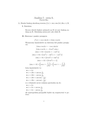 Analiza I - seria 6. Patryk Hes 1. Zbadać funkcję określoną wzorem f (x) = sin x sin (2x) dla x ∈ R. I. Dziedzina Iloczyn dwóch funkcji zadanych na R też jest funkcją zadaną na R. Dziedziną zatem jest cały zbiór R. II. Ekstrema i punkty przegięcia f 0 (x) = cos x sin 2x + 2 sin x cos 2x Wyznaczmy kandydatów na ekstrema lub punkty przegięcia: 2 sin x cos 2x = − cos x sin 2x 2 sin x cos 2x = −2 cos2 x sin x (sin x = 0) ∨ cos 2x = − cos2 x (sin x = 0) ∨ cos2 x − sin2 x = − cos2 x (sin x = 0) ∨ 2 cos2 x = sin2 x (sin x = 0) ∨ 3 cos2 x = 1 1 1 (sin x = 0) ∨ cos x = √ ∨ cos x = − √ 3 3 Lista kandydatów to: • x = kπ • x = 2kπ + arccos √13 • x = 2kπ − arccos √13 • x = 2kπ + arccos(− √13 ) • x = 2kπ − arccos(− √13 ) co z własności arcus cosinusa sprowadza się do: • x = kπ • x = kπ + arccos √13 • x = kπ − arccos √13 ale najwygodniej przypadki będzie się rozpatrywać w postaci: 1 • x = 2kπ • x = (2k + 1)π • x = 2kπ + arccos √13 • x = (2k + 1)π + arccos √13 • x = 2kπ − arccos √13 • x = (2k + 1)π − arccos √13 Rozważmy teraz drugą pochodną: f 00 (x) = 4 cos x cos 2x − 5 sin x sin 2x • Dla x = 2kπ: sin(x) = 0 cos(x) = 1 sin(2x) = 0 cos(2x) = 1 f 00 (x) = 4 · 1 · 1 = 4 czyli x = 2kπ to minima. • Dla x = (2k + 1)π: cos(x) = −1 sin(x) = 0 sin(2x) = 0 cos(2x) = 1 f 00 (x) = 4 · (−1) · 1 = −4 czyli x = (2k + 1)π to maksima. • Dla x = 2kπ + arccos √13 : √ 1 2 2 1 sin(x) = sin(2x) = cos(2x) = − 3 3 3 √ 24 3 f 00 (x) = − 9 1 czyli x = 2kπ + arccos √3 to maksima. r 2 cos(x) = 3 r • Dla x = (2k + 1)π + arccos √13 : r sin(x) = − r √ 2 1 2 2 1 cos(x) = − sin(2x) = cos(2x) = − 3 3 3 3 2 √ 24 3 f (x) = 9 1 czyli x = (2k + 1)π + arccos √3 to minima. 00 • Dla x = 2kπ − arccos √13 : √ 1 2 2 1 sin(x) = − sin(2x) = − cos(2x) = − 3 3 3 √ 16 3 f 00 (x) = − 9 1 czyli x = 2kπ − arccos √3 to maksima. r 2 cos(x) = 3 r • Dla x = (2k + 1)π − arccos √13 : √ 2 2 1 1 sin(x) = sin(2x) = − cos(2x) = − 3 3 3 √ 16 3 00 f (x) = 9 1 czyli x = (2k + 1)π − arccos √3 to minima. r 2 cos(x) = − 3 r III. Asymptoty poziome f (x) nie posiada asymptot poziomych, ponieważ jest funkcją okresową. Jeśli potrzeba silniejszego argumentu, można to pokazać z definicji Cauchy’ego granicy w nieskończoności (nie może być to granica niewłaściwa, bo f (x) jest ograniczone). IV. Asymptoty pionowe f (x) jest iloczynem dwóch funkcji ograniczonych, więc sama też jest ograniczona - nie ma zatem asymptot pionowych. 3 f(x) = sin(x)sin(2x) 1 sin(x)*sin(2*x) 0.5 0 −0.5 −1 0 2 4 6 8 Rysunek 1: Szkic wykresu 4 10 12 2. Wykazać następującą nierówność dla x > 0: sin x < x − x3 x5 + 3! 5! Rozwiążmy nierówność: sin x − x + 3 x3 x5 − <0 3! 5! 5 Oznaczmy f (x) = sin x−x+ x3! − x5! . Dla x = 0 mamy f (x) = 0. Zastanówmy się gdzie na przedziale (0, ∞) f (x) ma ekstrema? Może je mieć tam, gdzie f 0 (x) ma pierwiastki. f 0 (x) = cos x − 1 + x 2 x4 − 2! 4! Załóżmy, że istnieje co najmniej jeden taki x0 > 0, że f 0 (x0 ) = 0. Zauważmy, że: f 000 (x) = −f 0 (x) − x4 4! zatem f 000 (x0 ) = − x40 <0 4! Każdy x0 to punkt przegięcia f (x), a zarazem maksimum f 0 (x). Skoro f 0 (x) dla x ∈ (0, ∞) osiąga maksymalnie 0, to poza miejscami zerowymi przyjmuje wartości ujemne. To oznacza, że f (x) jest malejąca na całym przedziale (0, ∞). 5