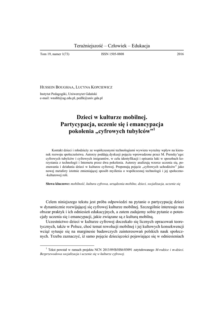 Teraźniejszość – Człowiek – Edukacja Tom 19, numer 1(73) ISSN 1505-8808 2016 HUSSEIN BOUGSIAA, LUCYNA KOPCIEWICZ Instytut Pedagogiki, Uniwersytet Gdański e-mail: [email protected], [email protected] Dzieci w kulturze mobilnej. Partycypacja, uczenie się i emancypacja pokolenia „cyfrowych tubylców”1 Kontakt dzieci i młodzieży ze współczesnymi technologiami wywiera wyraźny wpływ na kierunek rozwoju społeczeństwa. Autorzy poddają dyskusji pojęcia wprowadzone przez M. Prensky’ego: cyfrowych tubylców i cyfrowych imigrantów, w celu identyfikacji i opisania luki w sposobach korzystania z technologii i Internetu przez dwa pokolenia. Autorzy analizują wzorce uczenia się, poznawania i działania dzieci w kulturze cyfrowej. Proponują pojęcie „cyfrowych uchodźców” jako nowej metafory istotnie zmieniającej sposób myślenia o współczesnej technologii i jej społeczno-kulturowej roli. Słowa kluczowe: mobilność, kultura cyfrowa, urządzenia mobilne, dzieci, socjalizacja, uczenie się Celem niniejszego tekstu jest próba odpowiedzi na pytanie o partycypację dzieci w dynamicznie rozwijającej się cyfrowej kulturze mobilnej. Szczególnie interesuje nas obszar praktyk i ich odniesień edukacyjnych, a zatem zadajemy sobie pytanie o potencjały uczenia się i emancypacji, jakie związane są z kulturą mobilną. Uczestnictwo dzieci w kulturze cyfrowej doczekało się licznych opracowań teoretycznych, także w Polsce, choć temat rewolucji mobilnej i jej kultowych konsekwencji wciąż sytuuje się na marginesie badawczych zainteresowań polskich nauk społecznych. Trzeba zaznaczyć, iż samo pojęcie dziecięcości pojawiające się w odniesieniach 1 Tekst powstał w ramach projektu NCN 2013/09/B/HS6/03091 zatytułowanego M-rodzice i m-dzieci. Bezprzewodowa socjalizacja i uczenie się w kulturze cyfrowej. 140 Hussein BOUGSIAA, Lucyna KOPCIEWICZ technologicznych, wydaje się niezwykle pojemne, obejmując zróżnicowaną wiekowo populację. Nie brakuje badawczych odniesień dotyczących niemowląt, mnóstwo prac badawczych poświęconych jest grupie nastolatków oraz oczywiście młodzieży. Zastanawiając się nad potencjalnymi przyczynami tego osobliwego rozciągnięcia dziecięcości, przychodzi nam na myśl dominujący kulturowy sposób definiowania współczesnych technologii i jej roli w społeczeństwach zachodnich – jako urządzeń komunikacyjnych, które wyposażone są w coraz liczniejsze funkcje wypełniające i umilające ludziom (w różnym wieku) ich wolny czas: oferując dostęp do muzyki i coraz bogatszej oferty gier, umożliwiając fotografowanie i nagrywanie filmów, zapewniając niemal natychmiastowy dostęp do ludzi i treści, z którymi kontakt wydaje się im niezbędny. Wskazane typy aktywności są jednak klasyfikowane jako wybitnie zabawowe i skonstruowane jako przeciwieństwo „dorosłego” świata poważnych działań. Zatem obok właściwości przypisywanych współczesnym technologiom informacyjnym takich tak dehumanizacja (Postman), emancypacja (Katz), stymulowanie zmian w sposobach organizacji wiedzy i uczeniu się (Prenky) trzeba również wziąć pod uwagę ich potencjał udziecinniania jednostek, od których – w pewnych kontekstach społecznych – oczekuje się porzucania atrybutów dziecięcości. Do tego wątku powrócimy w ostatniej części artykułu. Społeczeństwo mobilne? J. Urry już ponad dekadę temu zaproponował, by dynamiczne przemiany społeczne ery globalizacji opisywać przez pryzmat kategorii mobilności (Urry 2009)2. Pojęcie mobilności pojawia się w jego pracach w wielu kontekstach i odniesieniach: turystyki, rozwoju nowych technologii komunikacyjnych, praktyk konsumenckich, metod badawczych socjologii itp. Dla J. Urry’ego mobilność jest metaforą ruchu oraz przepływu. Za pomocą tego pojęcia autor opisuje permanentne procesy, którym podlega świat w globalnej skali, a które odnoszą się do ruchu osób, towarów, idei, usług oraz informacji. Przepływ tych ostatnich jest szczególnie istotny, o czym przekonują choćby wydarzenia tzw. Arabskiej Wiosny, kiedy to okazało się, że dynamika tamtejszych zmian społecznych była wprost związana z dynamiką przepływu informacji za pośrednictwem Internetu (a dokładniej, serwisów społecznościowych). Z punktu widzenia problematyki niniejszego tekstu skoncentrujemy się na wybranych postaciach mobilności wywołanych rozwojem technologicznym, a zwłaszcza technologii komunikacyjnych. Współczesne technologie komunikacyjne powodują 2 W Wielkiej Brytanii praca tego autora została opublikowana w 2000 roku pod tytułem Sociology beyond Societies. Mobilities for the twenty-first century. Dzieci w kulturze mobilnej. Partycypacja, uczenie się i emancypacja... 141 wzrost znaczenia wizualności, „dziania się” wydarzeń na coraz liczniej otaczających nas ekranach (odbiornika telewizyjnego, komputera, tabletu czy smartfona) oraz natychmiastowości wydarzeń dostępnych głównie jako obrazy „tu i teraz” (Urry 2009, s. 131). Zdaniem J. Urry, w związku z rozwojem infrastruktury mobilnej młodsze pokolenia wypracowały wiele umiejętności, które są konsekwencjami permanentnego przepływu informacji w „multiekranowym trybie” i potrafią jednocześnie oglądać i przyswajać przekazy pochodzące z kilku źródeł, równolegle śledząc wiele wątków narracyjnych. Ten repertuar umiejętności młodszych pokoleń wskazuje na kolejną bardzo istotną właściwość współczesności, jaką jest tak zwany czas momentalny, w którym priorytetem są nanosekundy i jednoczesność dziania się i przeżywania rzeczywistości: Nigdy przedtem czas nie toczył się z taką szybkością, która jest poza możliwym zasięgiem ludzkiej świadomości. Historie z różnych miejsc i środowisk występują obok siebie w często chaotyczny i dowolny sposób, wyrywając zdarzenia z kontekstu i narracji (tamże, s. 176). Z paradygmatem mobilnym związane są r