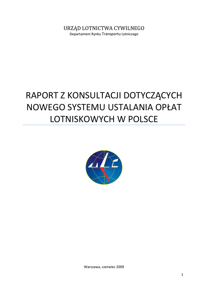 URZĄD LOTNICTWA CYWILNEGO Departament Rynku Transportu Lotniczego RAPORT Z KONSULTACJI DOTYCZĄCYCH NOWEGO SYSTEMU USTALANIA OPŁAT LOTNISKOWYCH W POLSCE Warszawa, czerwiec 2009 1 Spis treści Streszczenie ............................................................................................................................................. 3 1. Wstęp .............................................................................................................................................. 6 2. Opinie konsultantów społecznych ................................................................................................... 9 2.1 Zarządzający lotniskami ................................................................................................................. 9 2.2. Przewoźnicy lotniczy ................................................................................................................... 13 3. Wnioski .......................................................................................................................................... 17 Załączniki .................................................................................................................................................. I Załącznik 1. Lista podmiotów, od których otrzymano wypełniony kwestionariusz. ........................... II Załącznik 2. Kwestionariusz stanowiący podstawę konsultacji. ......................................................... III 2 Streszczenie W okresie kwiecień‐maj 2009 r. Urząd Lotnictwa Cywilnego, w oparciu o przygotowany w tym celu kwestionariusz, przeprowadził konsultacje dotyczące nowego systemu ustalania opłat lotniskowych w Polsce. Konieczność zmiany przepisów w tym zakresie wynika w szczególności z obowiązku implementacji przepisów dyrektywy Parlamentu Europejskiego i Rady 2009/12/WE z dnia 11 marca 2009 r. w sprawie opłat lotniskowych. Celem przedmiotowych konsultacji było poznanie opinii podmiotów rynku dotyczących pożądanego kształtu tego systemu, w tym w zakresie ewentualnego rozszerzenia lub uzupełnienia postanowień wspomnianej dyrektywy. W konsultacjach udział wzięli zarządzający lotniskami oraz przewoźnicy lotniczy, od których łącznie otrzymano 9 odpowiedzi. W grupie zarządzających lotniskami większość respondentów opowiedziała się przeciwko rozszerzaniu zakresu – zarówno podmiotowego, jak i przedmiotowego – postanowień dyrektywy 2009/12/WE. Zdania zarządzających były podzielone w odniesieniu do zasadności wprowadzenia możliwości zastosowania wspólnego systemu opłat dla sieci portów lotniczych oraz lotnisk obsługujących to samo miasto/konurbację. Brak było jednomyślności zarządzających lotniskami także w odniesieniu do wprowadzenia w Polsce dodatkowych środków regulacyjnych, przy czym w grupie respondentów opowiadających się za wprowadzeniem takich środków widoczne było dążenie do ograniczenia tych środków do lotnisk objętych zakresem dyrektywy 2009/12/WE, przy uwzględnieniu pozycji konkurencyjnej lotniska. W zakresie sposobu wykonywania przedmiotowego nadzoru wskazywano na zatwierdzanie ex‐ante określonych elementów taryfy opłat lotniskowych albo na nadzór ex‐post w zakresie zasad wynikających z dyrektywy 2009/12/WE. Większość otrzymanych odpowiedzi wskazywała również na brak potrzeby zmian art. 75 ustawy Prawo lotnicze. W zakresie zasadności zmiany katalogu zwolnień od opłat lotniskowych określonego w art. 76 ustawy zdania respondentów były podzielone, przy czym propozycje zmian wskazywały na zasadność rozszerzenia tego katalogu o loty wykonywane w celu przewozu głowy państwa, szefa rządu oraz loty państwowych (polskich i obcych) statków powietrznych. Jednomyślność zarządzających była natomiast widoczna w pytaniu dotyczącym zasadności objęcia tych zwolnień refundacją – wszystkie odpowiedzi wskazywały na potrzebę wprowadzenia zasady zwrotu kosztów w tym zakresie. W odniesieniu do systemu kalkulacji kosztów dla celów opłat lotniskowych wskazano na system dual‐till jako rozwiązanie preferowane. W grupie przewoźników lotniczych natomiast większość odpowiedzi wskazywała na zasadność rozszerzenia zakresu – zarówno podmiotowego, jak i przedmiotowego – postanowień dyrektywy 2009/12/WE, przy czym w szczególności w odniesieniu do zakresu podmiotowego jej stosowania do portów lotniczych o ruchu poniżej 5 mln pasażerów rocznie opinie przewoźników były podzielone (jako próg objęcia portu lotniczego zasadami dyrektywy wskazywano 1,5 mln albo 2 mln pasażerów rocznie, udział w rynku pasażerskim co najmniej 5%, a także pojawiła się propozycja objęcia tymi zasadami wszystkich lotnisk użytku publicznego w Polsce). W odniesieniu do zakresu przedmiotowego wskazywano przede wszystkim na potrzebę uzupełnienia przepisów dotyczących konsultacji oraz określenie dopuszczalnych systemów zniżek od opłat. Podobnie jak w przypadku 3 zarządzających lotniskami, zdania przewoźników były podzielone w odniesieniu do zasadności wprowadzenia możliwości zastosowania przez zarządzających lotniskami wspólnego systemu opłat dla sieci portów lotniczych oraz lotnisk obsługujących to samo miasto/konurbację. Jednomyślność przewoźników była natomiast widoczna w odniesieniu do wprowadzenia w Polsce dodatkowych środków regulacyjnych, gdzie wszystkie odpowiedzi wskazywały na zasadność zatwierdzania pewnych elementów taryfy opłat lotniskowych przed jej wejściem w życie, przy czym zakres informacji podlegających zatwierdzeniu był zróżnicowany. Podzielone natomiast były zdania przewoźników lotniczych w zakresie zróżnicowania zasad nadzoru pomiędzy lotniskami. Większość otrzymanych od przedstawicieli tej grupy odpowiedzi wskazywała na brak potrzeby zmian art. 75 i art. 76 ustawy Prawo lotnicze. Opinie przewoźników były podzielone natomiast w odniesieniu do zasadności o