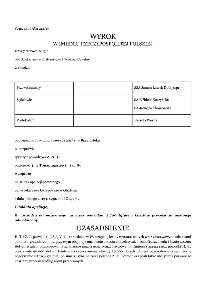 Sygn. akt I ACa 214/13 WYROK W IMIENIU RZECZYPOSPOLITEJ POLSKIEJ Dnia 7 czerwca 2013 r. Sąd Apelacyjny w Białymstoku I Wydział Cywilny w składzie: Przewodniczący : SSA Janusz Leszek Dubij (spr.) Sędziowie : SA Elżbieta Kuczyńska SA Jadwiga Chojnowska Protokolant : Urszula Westfal po rozpoznaniu w dniu 7 czerwca 2013 r. w Białymstoku na rozprawie sprawy z powództwa Z. H. T. przeciwko (...) Towarzystwo (...) w W. o zapłatę na skutek apelacji pozwanego od wyroku Sądu Okręgowego w Olsztynie z dnia 5 lutego 2013 r. sygn. akt I C 292/12 I. oddala apelację; II. zasądza od pozwanego na rzecz powodów 2.700 tytułem kosztów procesu za instancję odwoławczą. UZASADNIENIE H. T. i Z. T. pozwali (...) S.A. V. (...) z siedzibą w W. o zapłatę kwoty 270.000 złotych wraz z ustawowymi odsetkami od dnia 1 grudnia 2009 r., przy czym obejmuje ona kwotę 90.000 złotych tytułem zadośćuczynienia i kwotę 40.000 złotych tytułem odszkodowania za znaczne pogorszenie sytuacji życiowej po śmierci syna na rzecz powódki H. T., oraz kwotę 90.000 złotych tytułem zadośćuczynienia i kwotę 50.000 złotych tytułem odszkodowania za znaczne pogorszenie sytuacji życiowej po śmierci syna na rzecz powoda Z. T.. Powodowi żądali także obciążenia pozwanego kosztami procesu według norm przepisanych. (...) S.A. V. (...) z siedzibą w W. wniósł o oddalenie powództwa w całości oraz o zasądzenie na jego rzecz kosztów procesu według norm przepisanych. Sąd Okręgowy w Olsztynie wyrokiem z dnia 5 lutego 2013 r. zasądził od pozwanego na rzecz powodów: H. T. kwotę 70.000 zł wraz z ustawowymi odsetkami od dnia 2 grudnia 2009 r. oraz na rzecz Z. T. kwotę 80.000 zł wraz z ustawowymi odsetkami od dnia 2 grudnia 2009r. (pkt I), a w pozostałym zakresie powództwo oddalił (pkt II). Ponadto zasądził od pozwanego na rzecz powodów: H. T. kwotę 3.774,95 zł, zaś na rzecz Z. T. kwotę 4.542,62 zł tytułem zwrotu kosztów procesu (pkt III). Powyższe rozstrzygnięcie zostało oparte o następujące ustalenia faktyczne i ocenę prawną. W dniu (...) syn powodów Z. i H. T., A. T. (1) jechał jako pasażer samochodem osobowym marki S. (...) o nr rej. (...), którym kierowała A. T. (2). Wjeżdżając od strony K. na drogę K-7, A. T. (2) nie zachowała należytej ostrożności i nie udzieliła pierwszeństwa przejazdu jadącemu na wprost od strony W. w kierunku M. kierującemu pojazdem osobowym marki V. (...) o nr rej. (...), wskutek czego doszło do zderzenia się pojazdów. W następstwie wypadku A. T. (2) oraz jadący z nią pasażerowie – M. T. i A. T. (1) ponieśli śmierć na miejscu zdarzenia. W toku prowadzonego śledztwa ustalono, że sprawcą wypadku drogowego była kierująca pojazdem osobowym marki S. (...), A. T. (2), jednak ze względu na jej śmierć postanowieniem z dnia 23 września 2009 r. Prokurator Prokuratury Rejonowej w Elblągu umorzył postępowanie na podstawie art. 17 § 1 pkt 5 k.p.k. Zmarły A. T. (1) był pierwszym dzieckiem powodów i od najmłodszych lat pomagał ojcu w pracach na gospodarstwie rolnym. Na przełomie 2001 i 2002r. ukończył Technikum (...) w K. w zawodzie technik mechanizacji rolnictwa – naprawa maszyn i urządzeń rolniczych. W okresie od 4 września 2000r. do 18 stycznia 2001 r. A. T. (1) był słuchaczem kursu dotyczącego obsługi kombajnu, który ukończył z wynikiem dobrym. Uczestniczył także w (...) 2002-2003 w ramach którego w okresie od 21 sierpnia do 3 grudnia 2002r. przebywał wraz z innymi uczestnikami w Kanadzie, a następnie od 4 grudnia 2002r. do 19 marca 2003r. w Polsce, gdzie przez trzy dni w tygodniu pracował jako wolontariusz w przedsiębiorstwach, służbach socjalnych i administracji lokalnej, a przez pozostałe dwa dni brał udział w zajęciach szkoleniowych, m.in. z zakresu przygotowania do sprostania wymogom nowoczesnego rynku pracy. Po zakończeniu wymiany wyjechał do Anglii, gdzie pracował na różnych gospodarstwach rolnych, na których prowadzona była hodowla bydła mlecznego. Uczył się także języka angielskiego. W dniach 11 i 14 kwietnia 2008 r. A. T. (1) uczestniczył w szkoleniu z zakresu stosowania środków ochrony roślin sprzętem naziemnym, zorganizowanym przez (...)- (...) Ośrodek Doradztwa Rolniczego w O.. Około 2006 r. powód Z. T. przepisał na syna A. T. (1) gospodarstwo rolne w zamian za rentę strukturalną. A. T. (1) dokupił 4 ha gruntów i powiększył oborę. Na gospodarstwie hodował bydło mleczne, a część ziemi obsiewał zbożem z przeznaczeniem na paszę dla zwierząt. A. T. (1) prowadził gospodarstwo rolne o powierzchni 35,60 ha przeliczeniowych, zajmował się jego organizacją, samodzielnie wykonywał prace gospodarskie, dbał o sprzęt i naprawiał maszyny rolnicze. W sezonie do pomocy zatrudniał kilka osób, a przy pracach w gospodarstwie pomagał też mu brat K. T.. A. T. (1) planował zmodernizować gospodarstwo rolne, wybudować wolnostanowiskową oborę i zwiększyć o połowę liczbę bydła. Mieszkał wraz z rodzicami i młodszym bratem K.. Siostra studiowała dziennie na kierunku ochrona środowiska na Uniwersytecie (...)- (...) w O.. Powodowie finansowali studia córki, a A. T. (1) dokładał się do kosztów utrzymania siostry. Brat K. prowadził gospodarstwo rolne o powierzchni 30 ha i zajmował się hodowlą trzody chlewnej, wymieniał się z bratem sprzętem rolniczym. Po przekazaniu gospodarstwa rolnego powodowie mieli dużo wolnego czasu. Odpoczywali, jeździli w odwiedziny do rodziny, nie byli zmuszeni pracować na gospodarstwie rolnym. W tym czasie Z. T. utrzymywał się z renty strukturalnej w wysokości ok. 2.400 zł, zaś H. T. nie otrzymywała żadnych świadczeń. A. T. (1) był osobą spokojną i życzliwą, pozostawał w bliskich relacjach z powodami. Pamiętał o ich imieninach i rocznicy ślubu, kupował matce kwiaty, sponsorował rodzicom wyjazdy. Udzielał się także na forum społecznym, uczestniczył w remontach dróg i świetlicy.